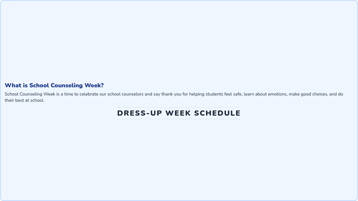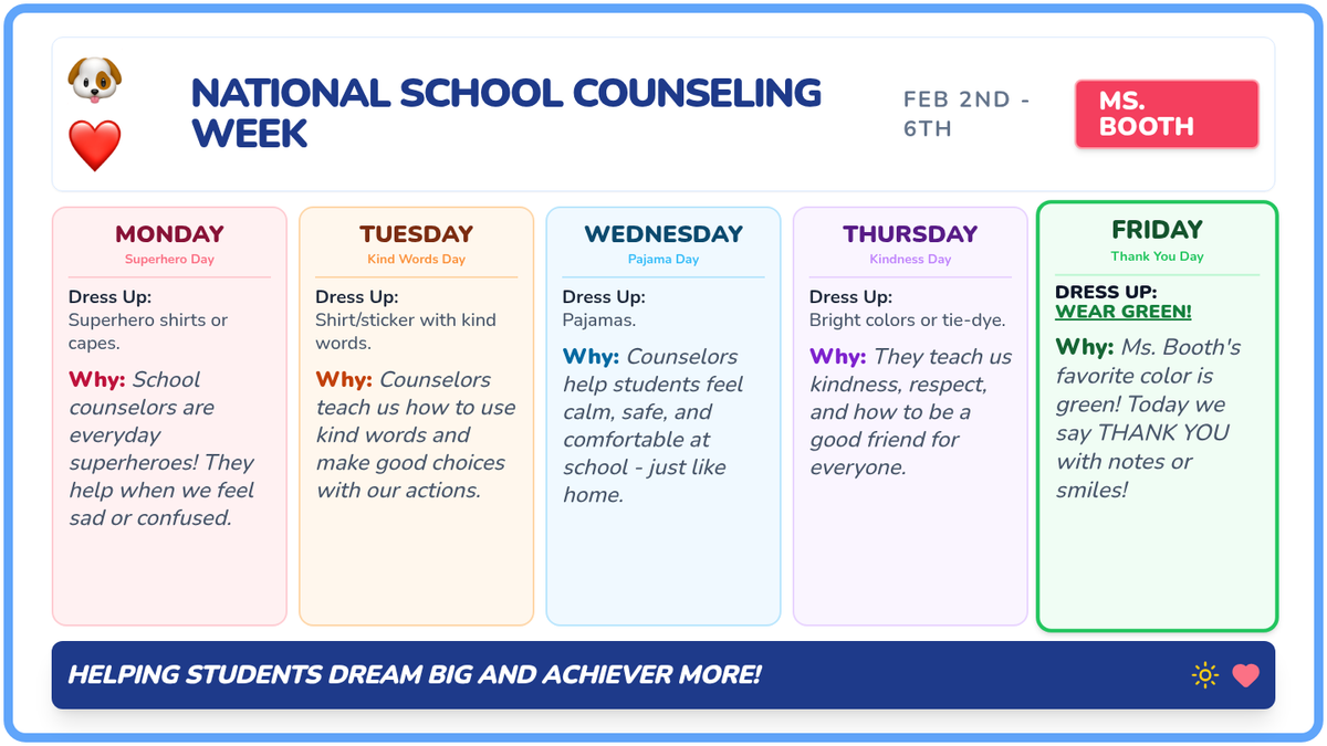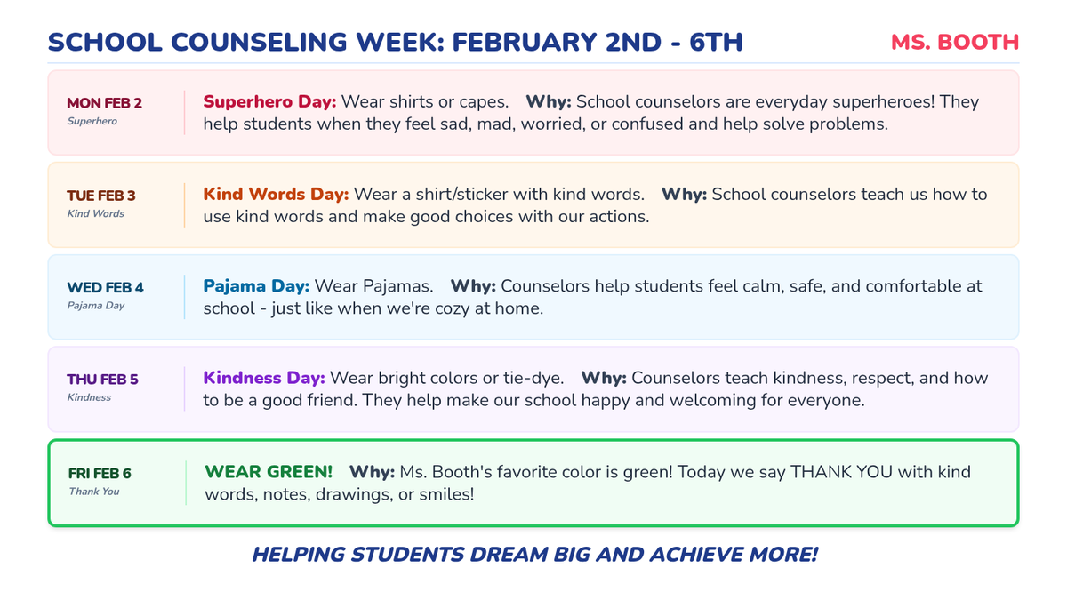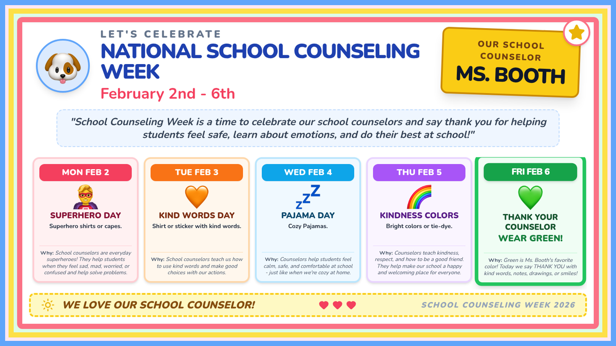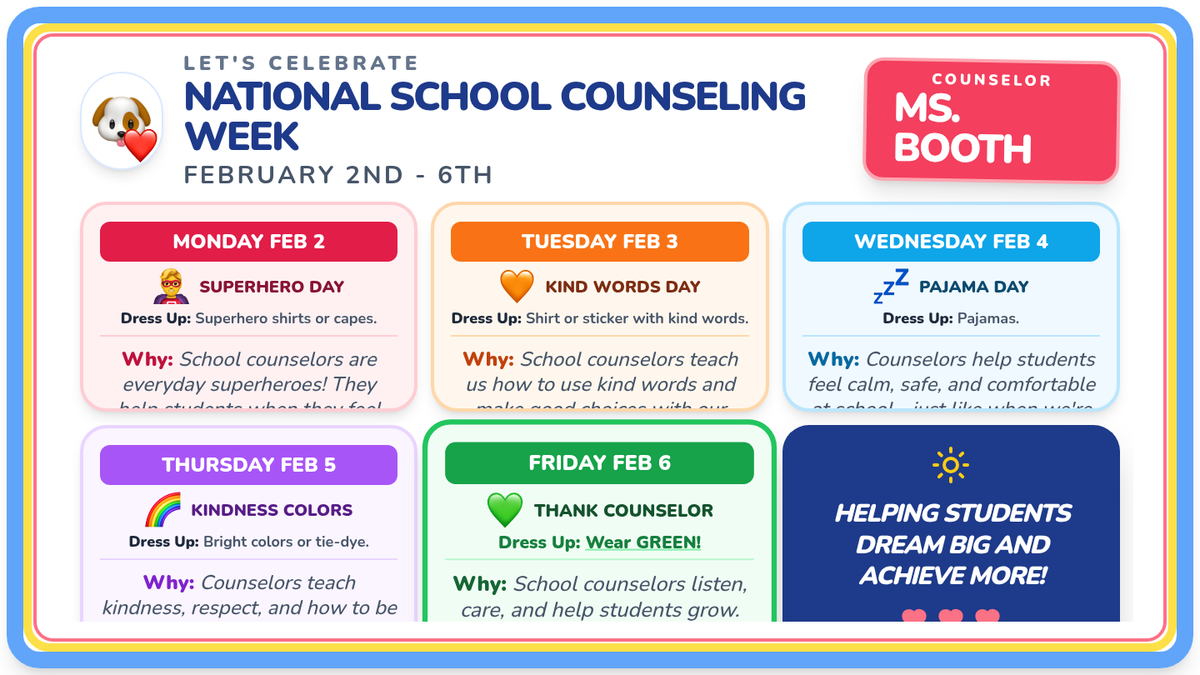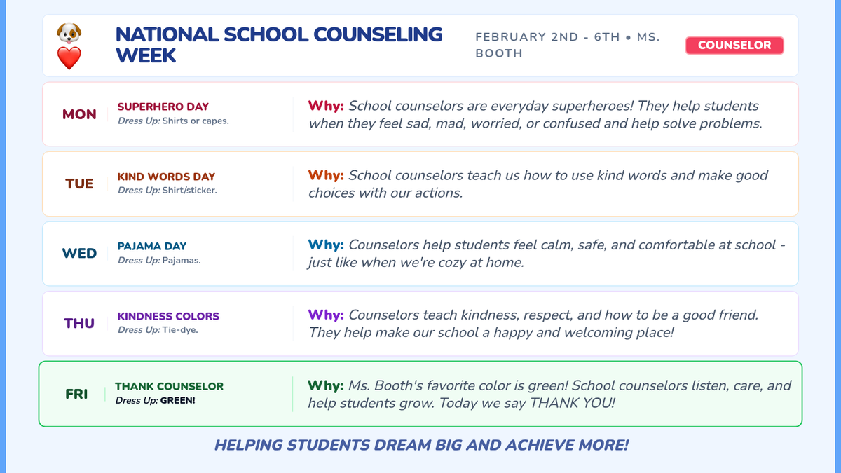 Materials for celebrating School Counselor Week, featuring flyers for students and parents.