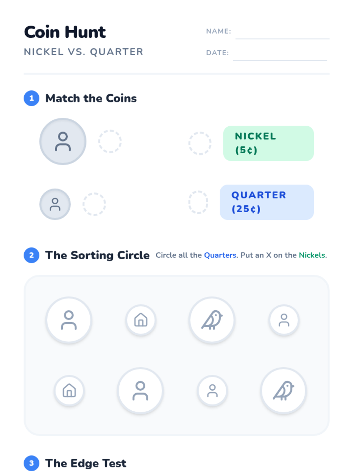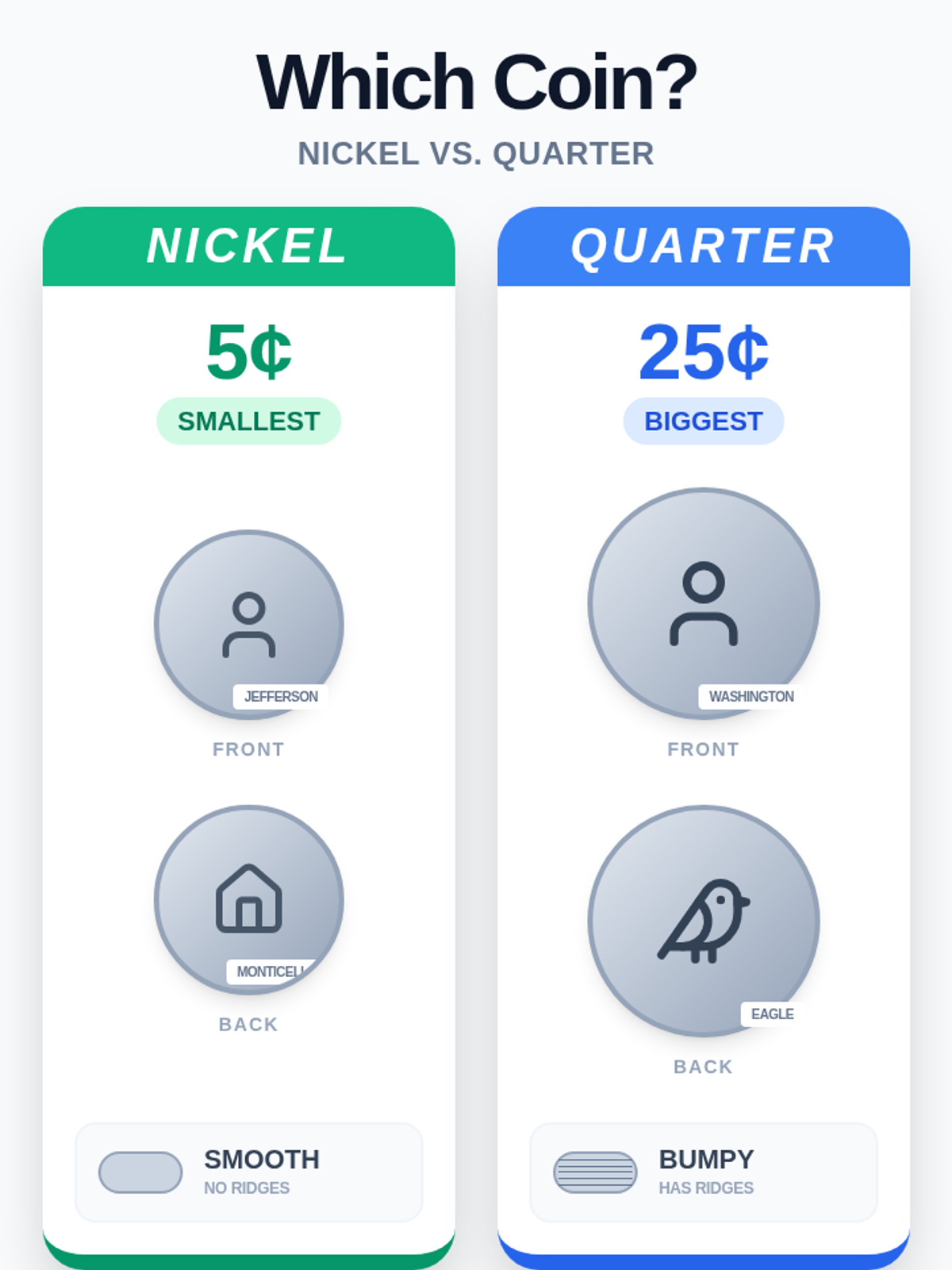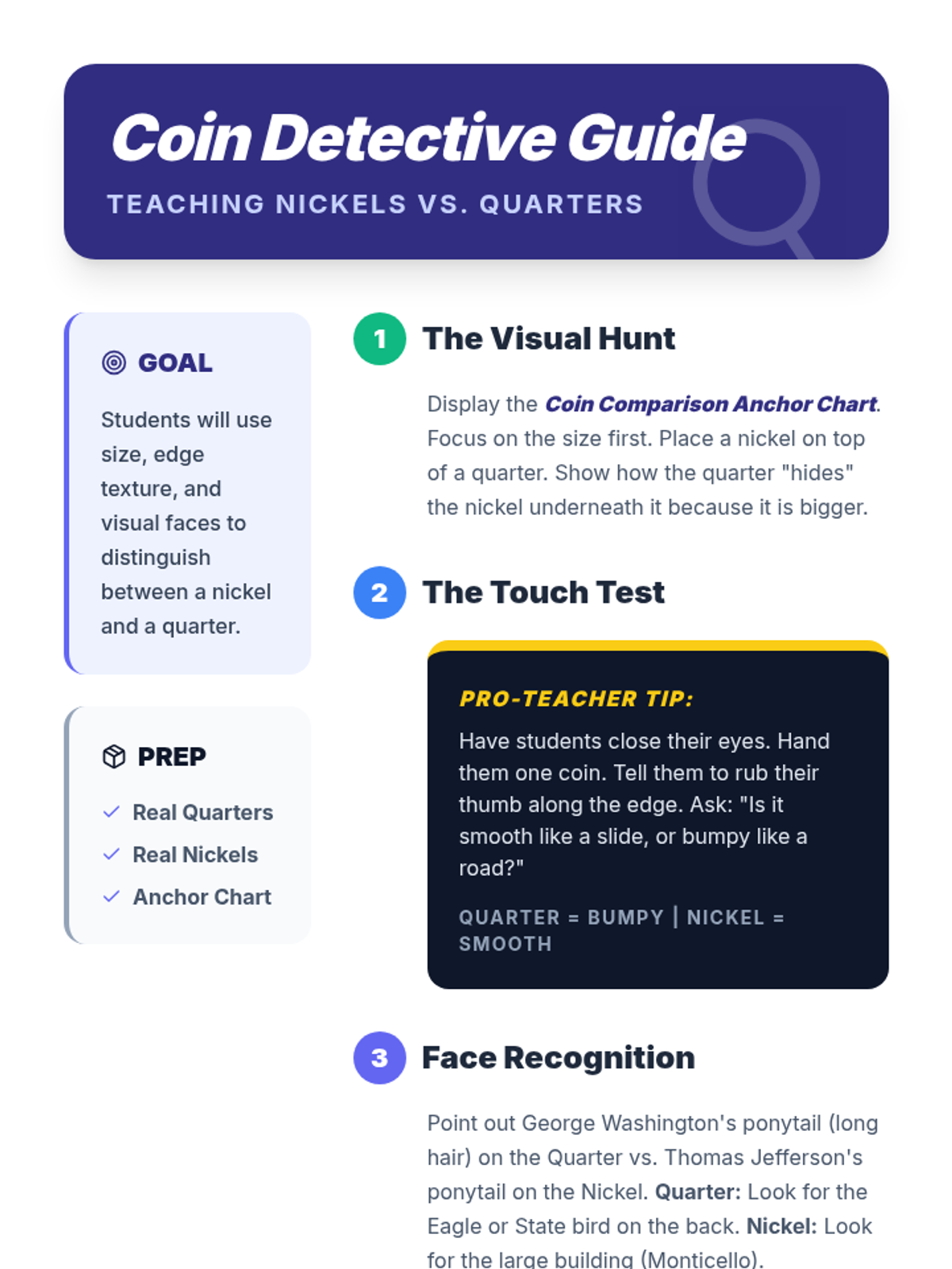 A lesson focused on identifying and distinguishing between nickels and quarters through visual cues and physical characteristics.