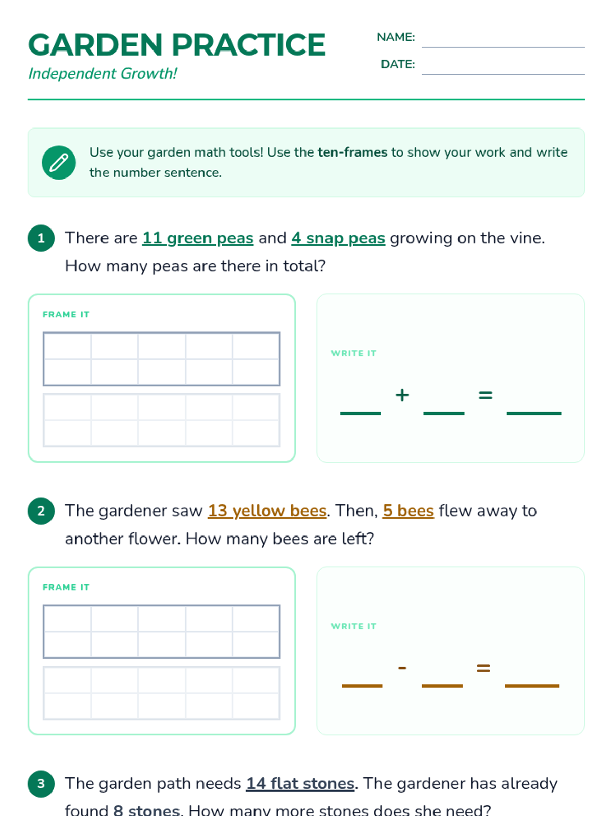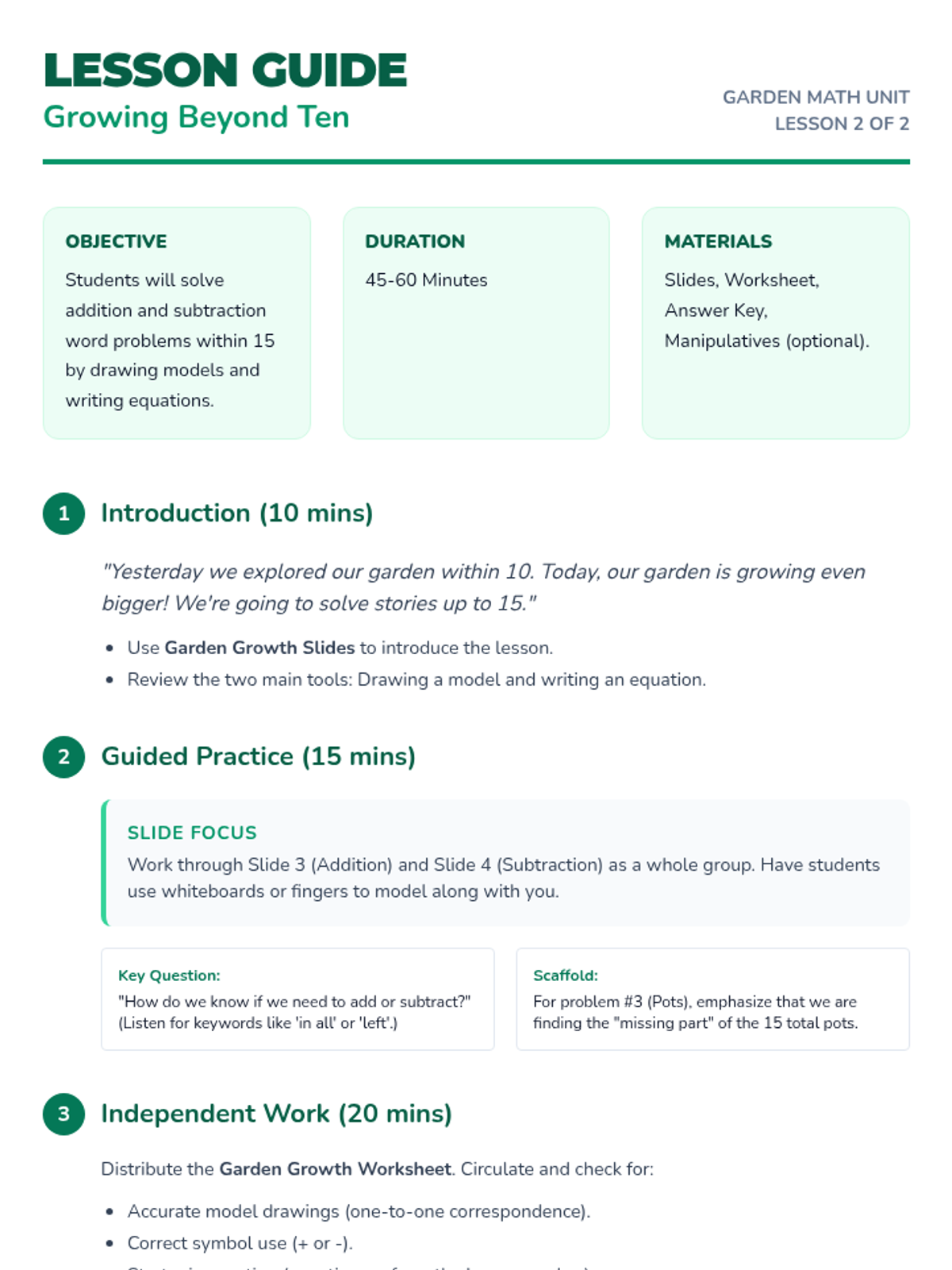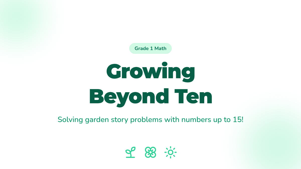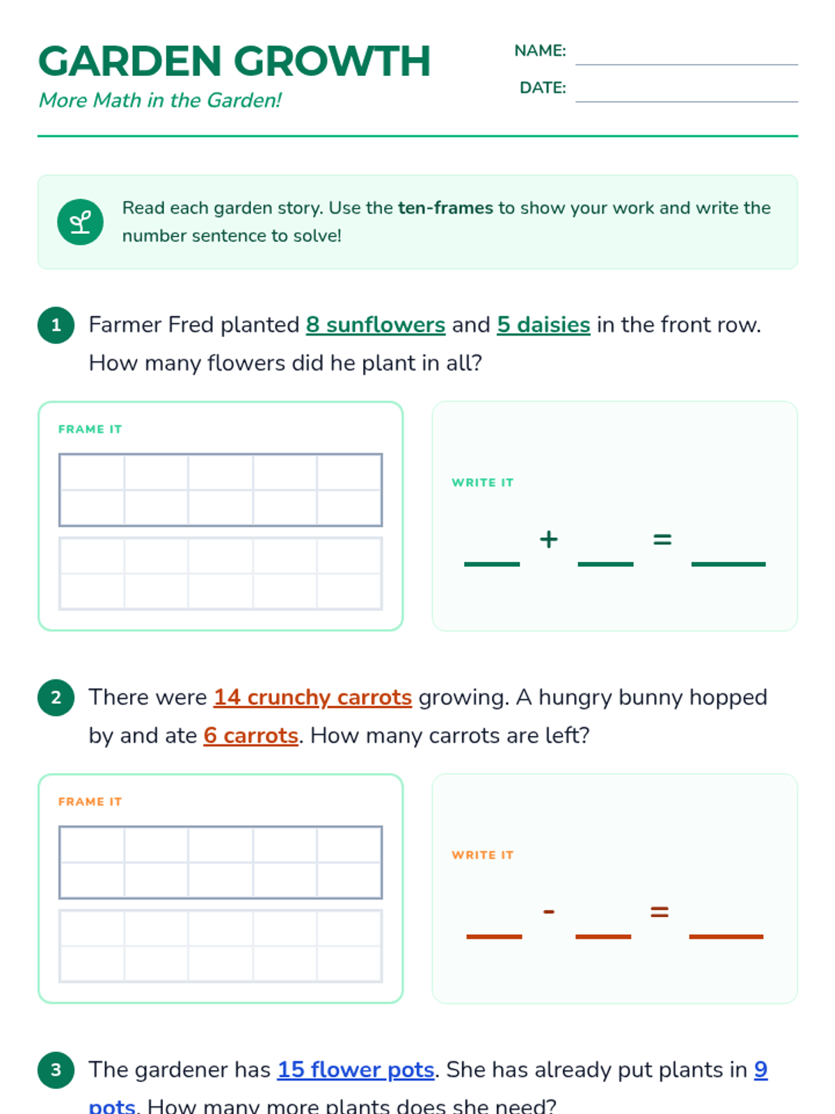 A math lesson extending addition and subtraction skills to numbers within 15 through garden-themed word problems, focusing on drawing models and writing equations.