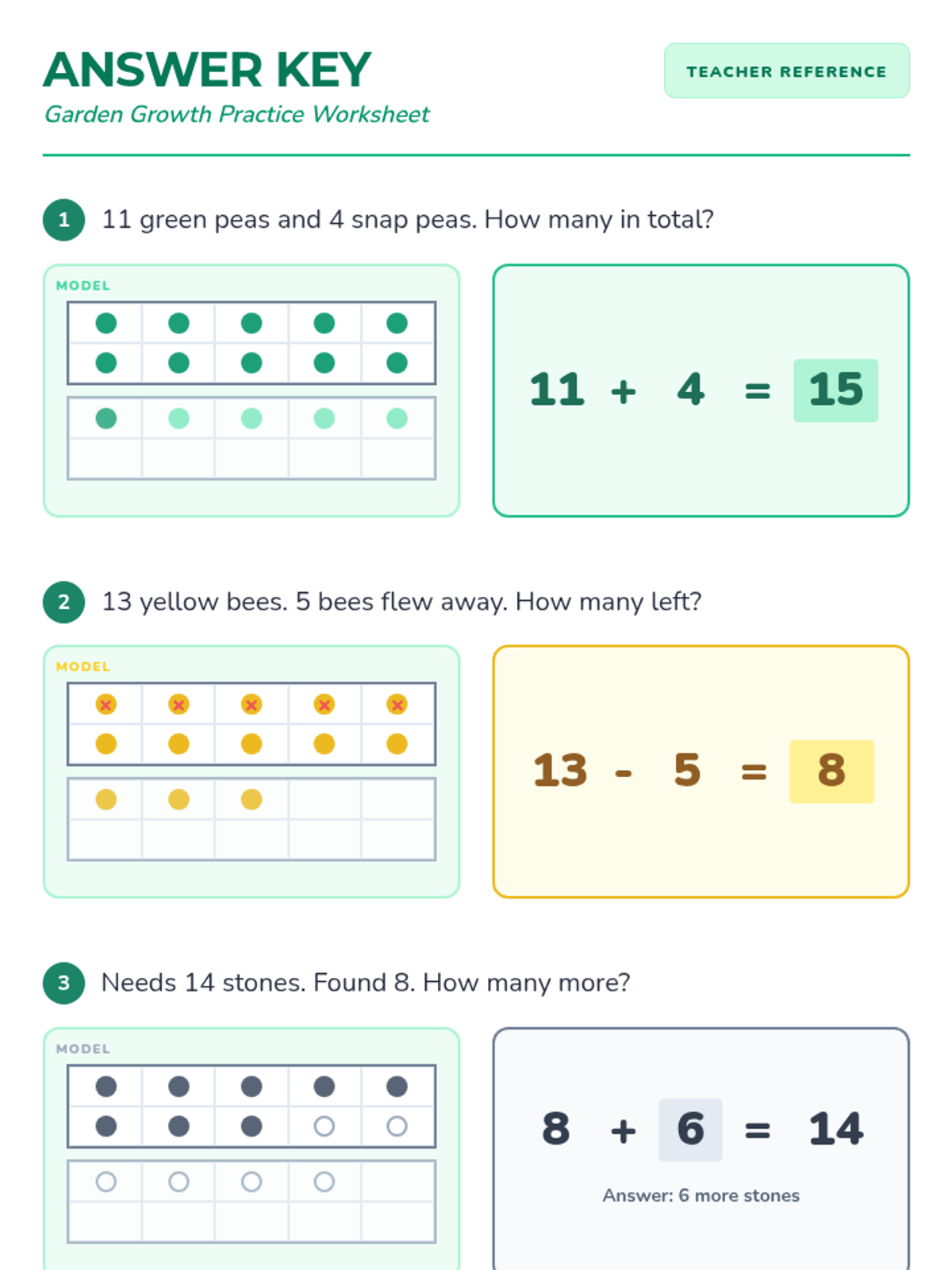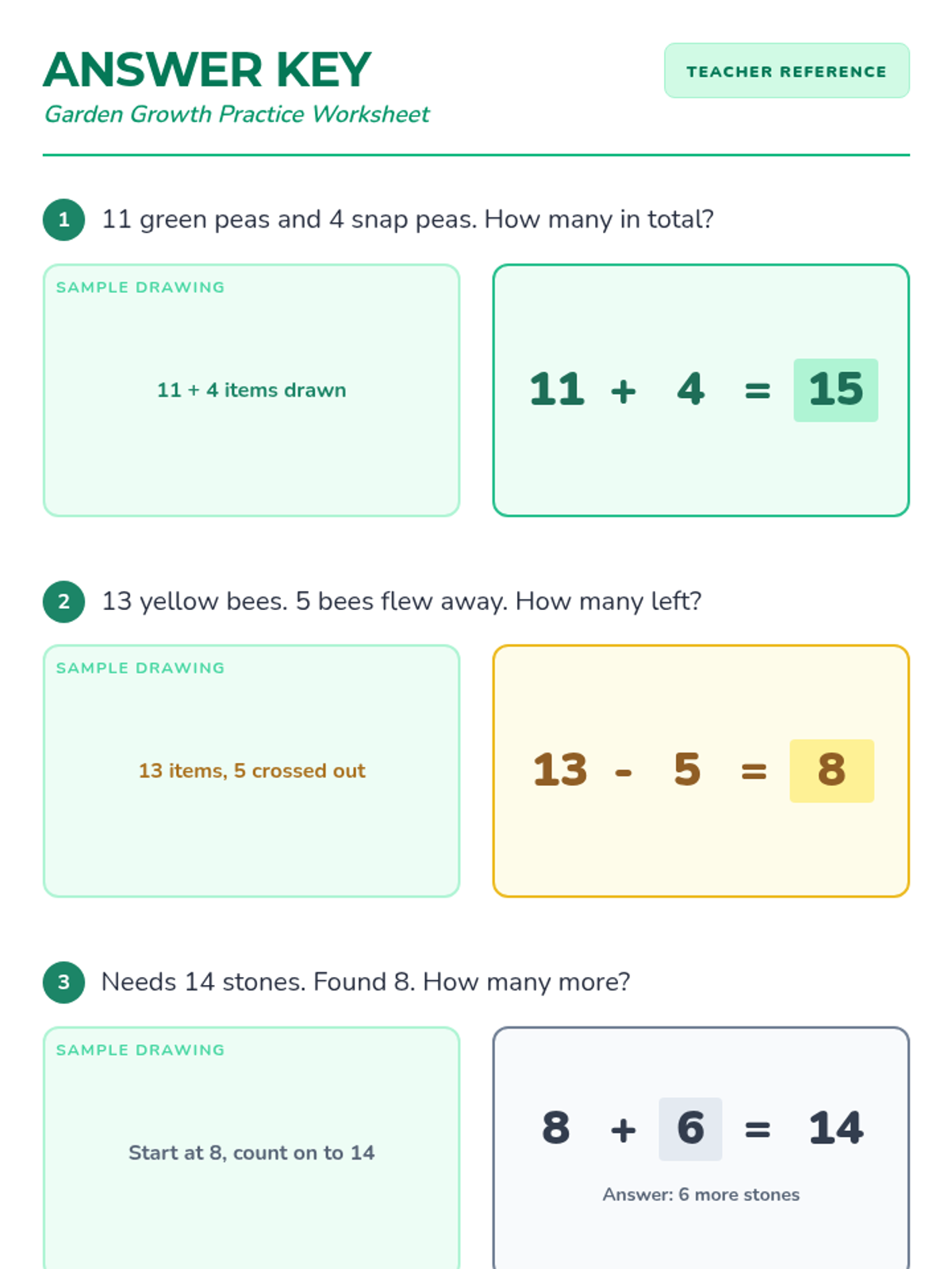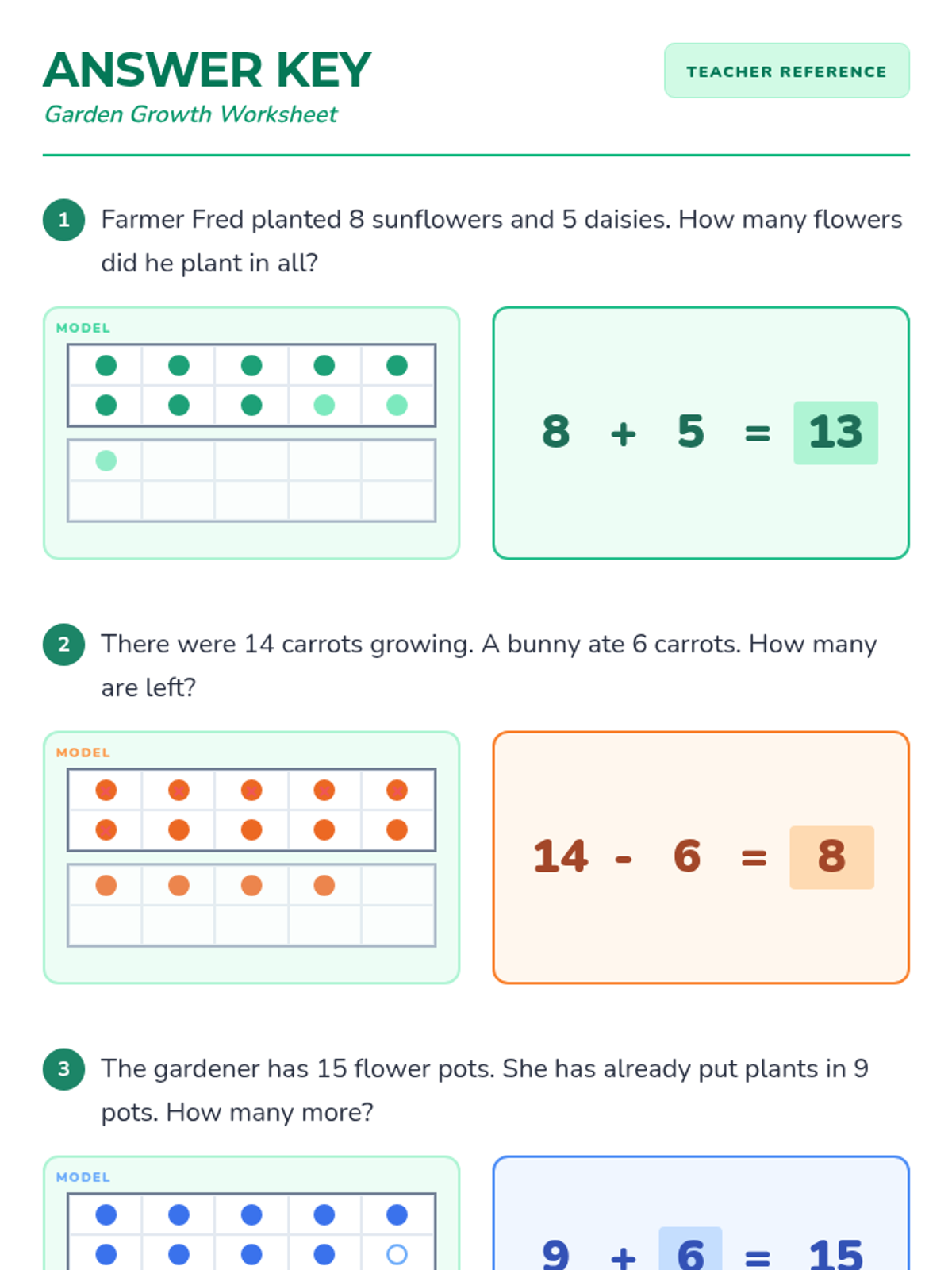 A math lesson extending addition and subtraction skills to numbers within 15 through garden-themed word problems, focusing on drawing models and writing equations.