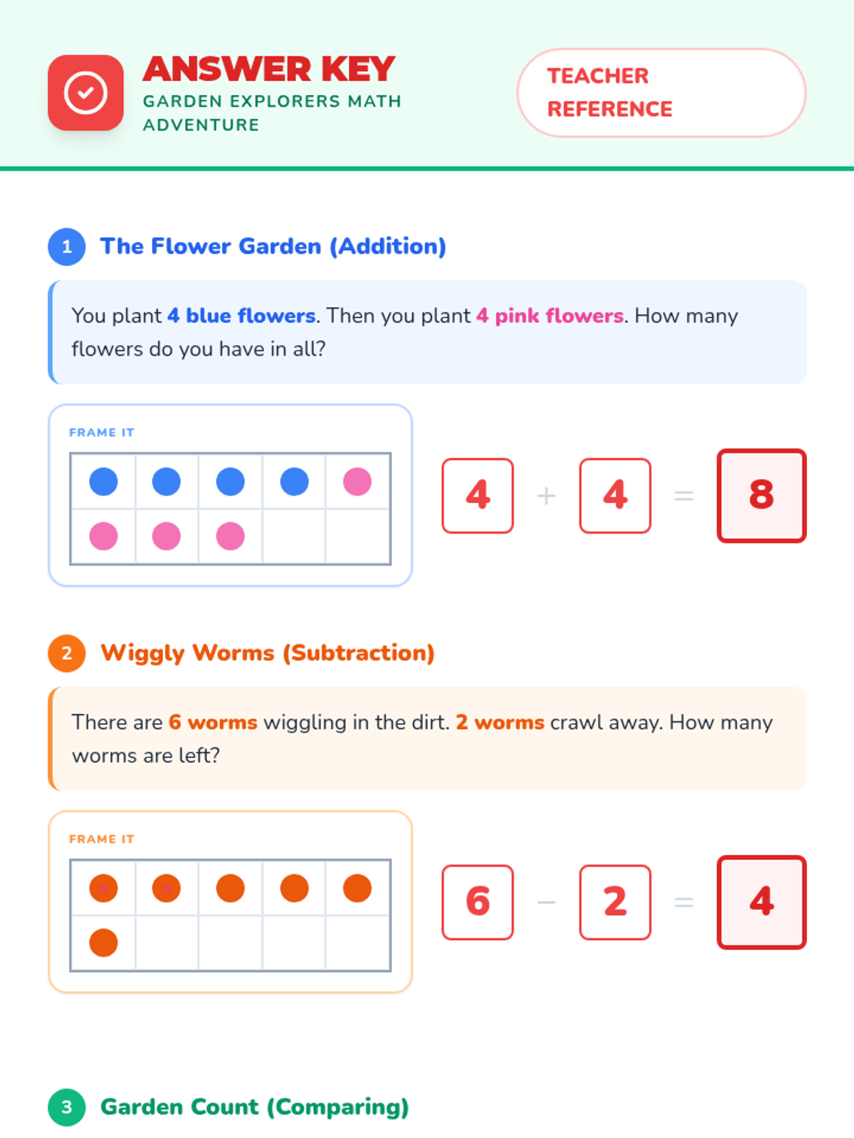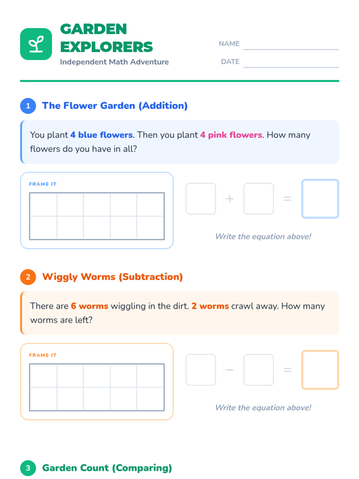 A kindergarten math lesson focusing on addition and subtraction within 10, comparing quantities, and extending patterns through a 'Garden Explorers' theme. Includes group instruction slides, independent practice worksheets, and a hands-on sorting activity.