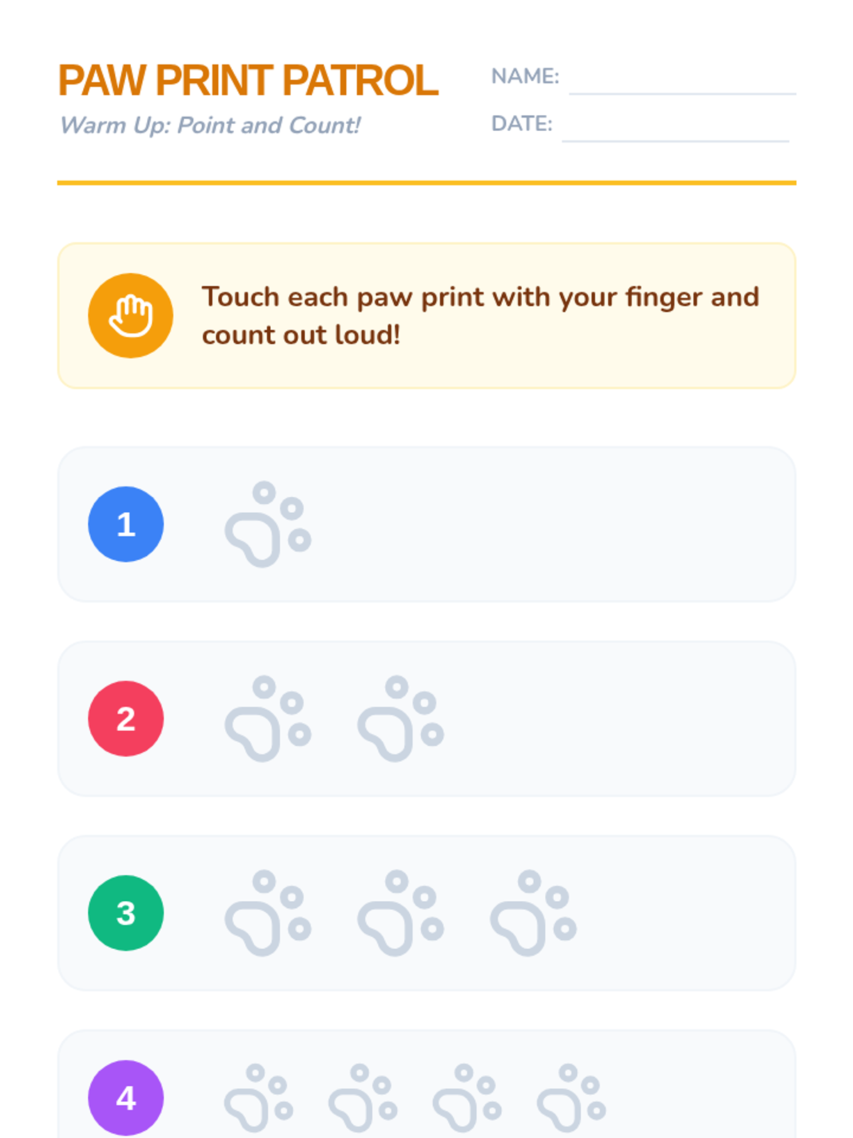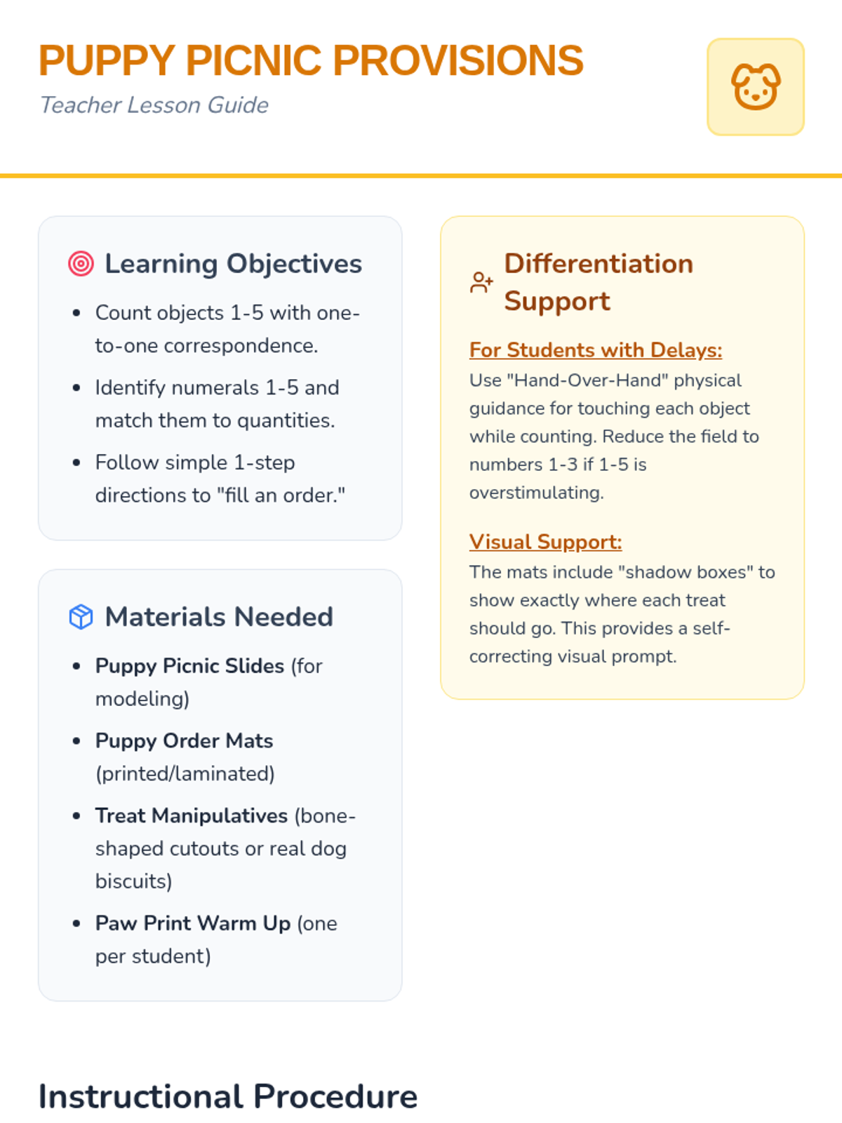 A hands-on numeracy lesson for Pre-K students focused on counting 1-5 and one-to-one correspondence through a playful puppy picnic theme. Students use visual mats and 'treat' manipulatives to fulfill specific orders for their puppy friends.