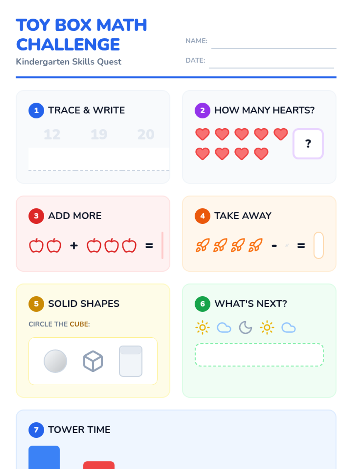 A comprehensive review of essential kindergarten math concepts including counting, addition, subtraction, shapes, and measurement, featuring high-contrast visuals and picture-supported problems.