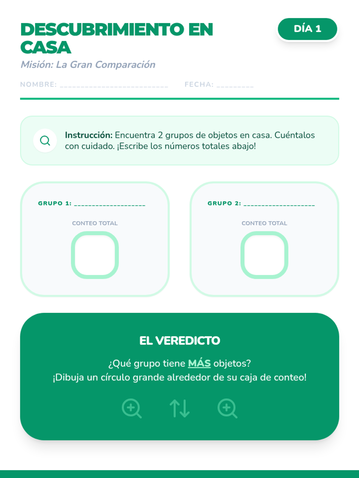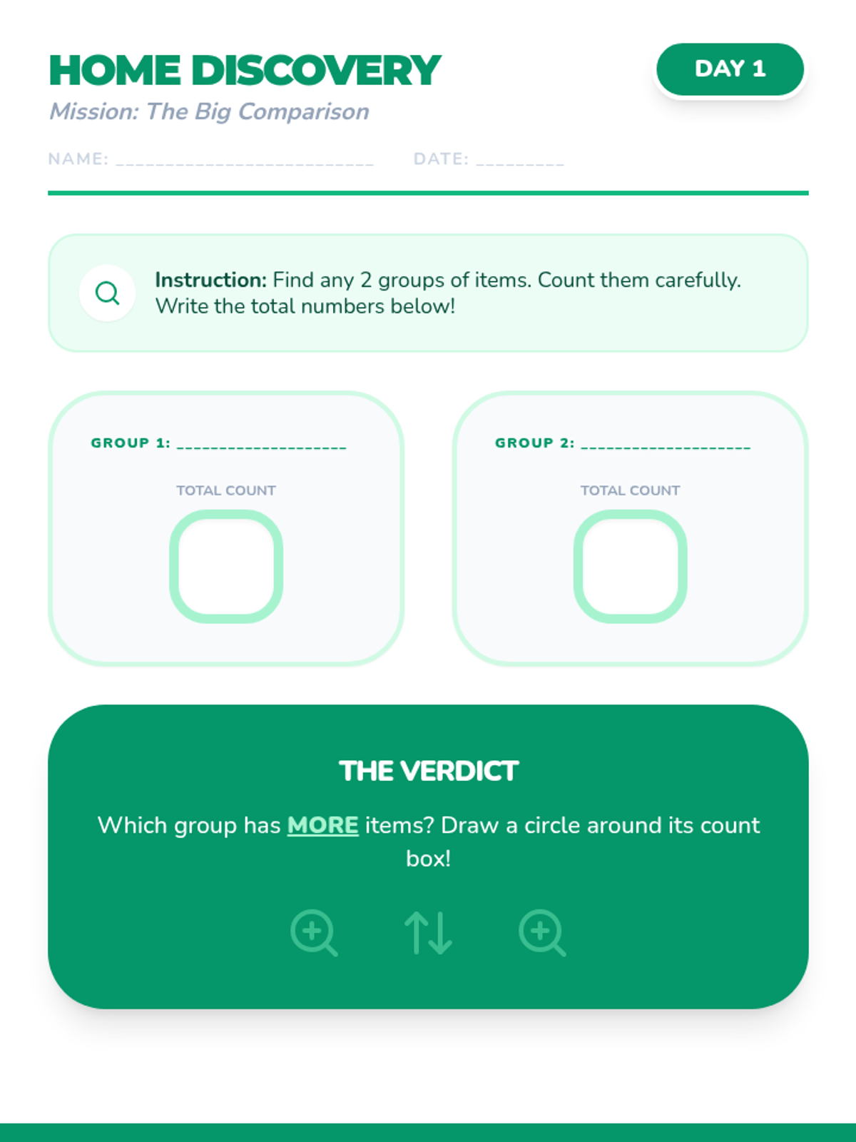 A 5-day homework series focused on one-to-one correspondence, comparing quantities, and number identification through daily household scavenger hunts.