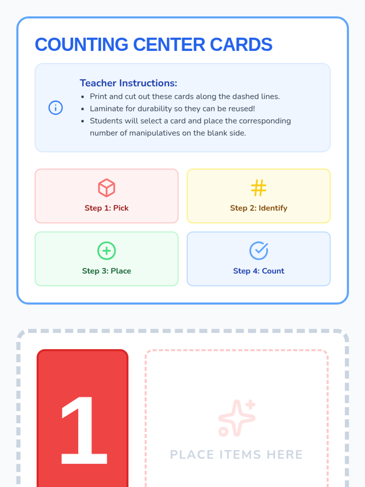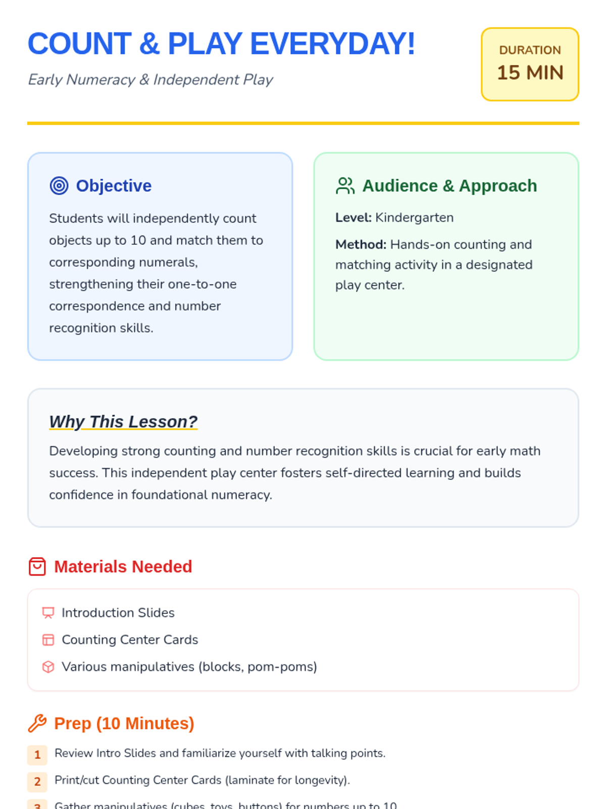 This engaging 15-minute lesson introduces Kindergarten students to independent counting through a fun play center where they match manipulatives to numerals.