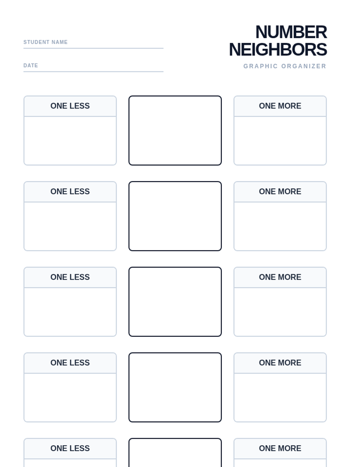 A set of materials focused on helping students understand number relationships by identifying 'one more' and 'one less' than a given number.