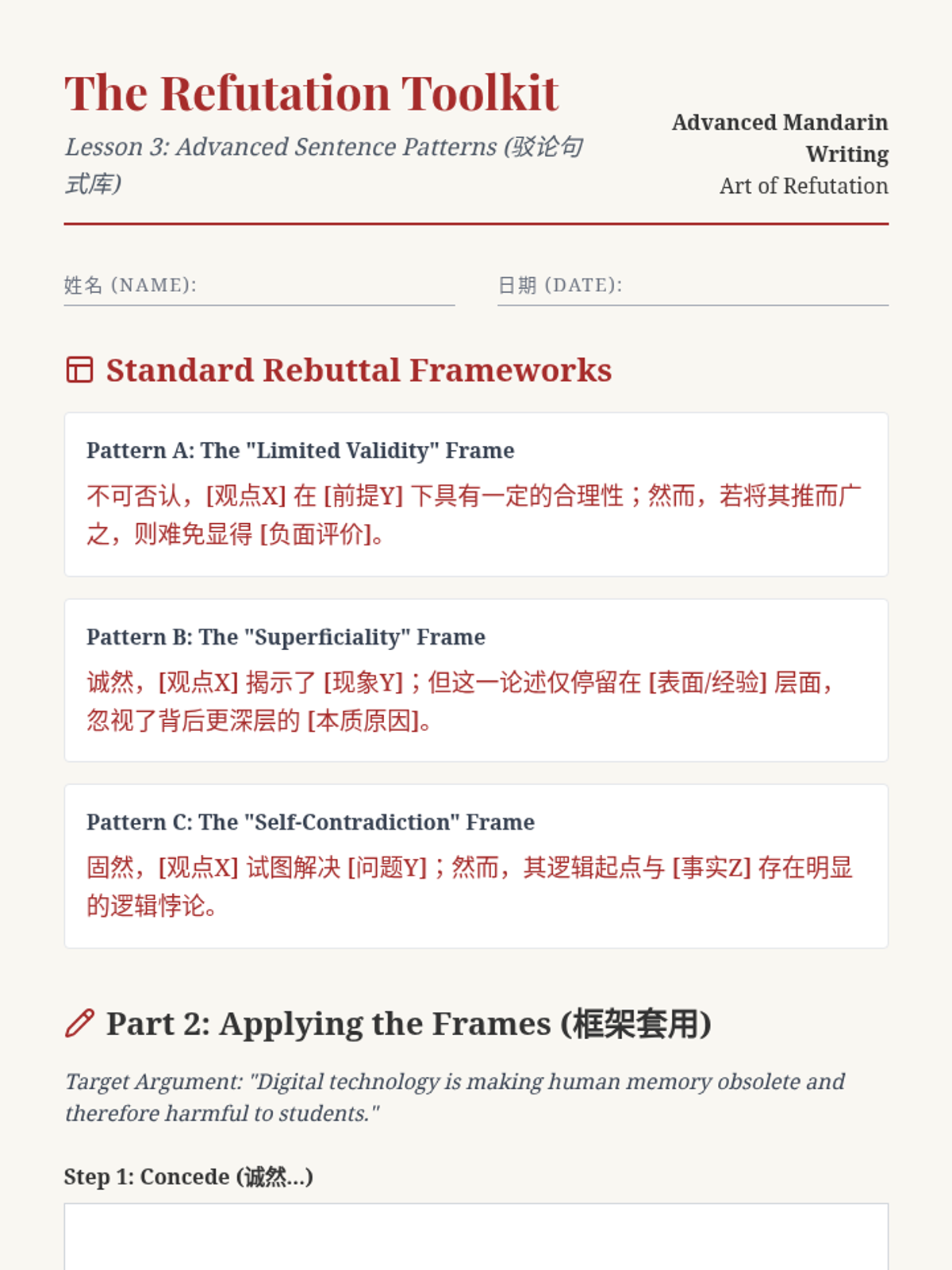 Teaches the diplomatic tone and specific linguistic patterns required for addressing and refuting counter-arguments in Chinese.