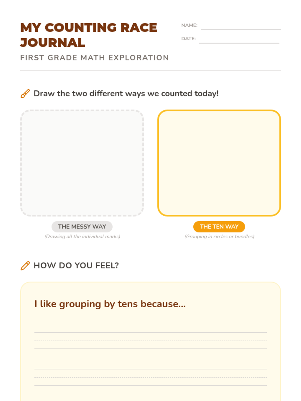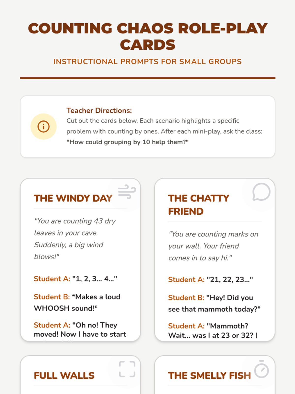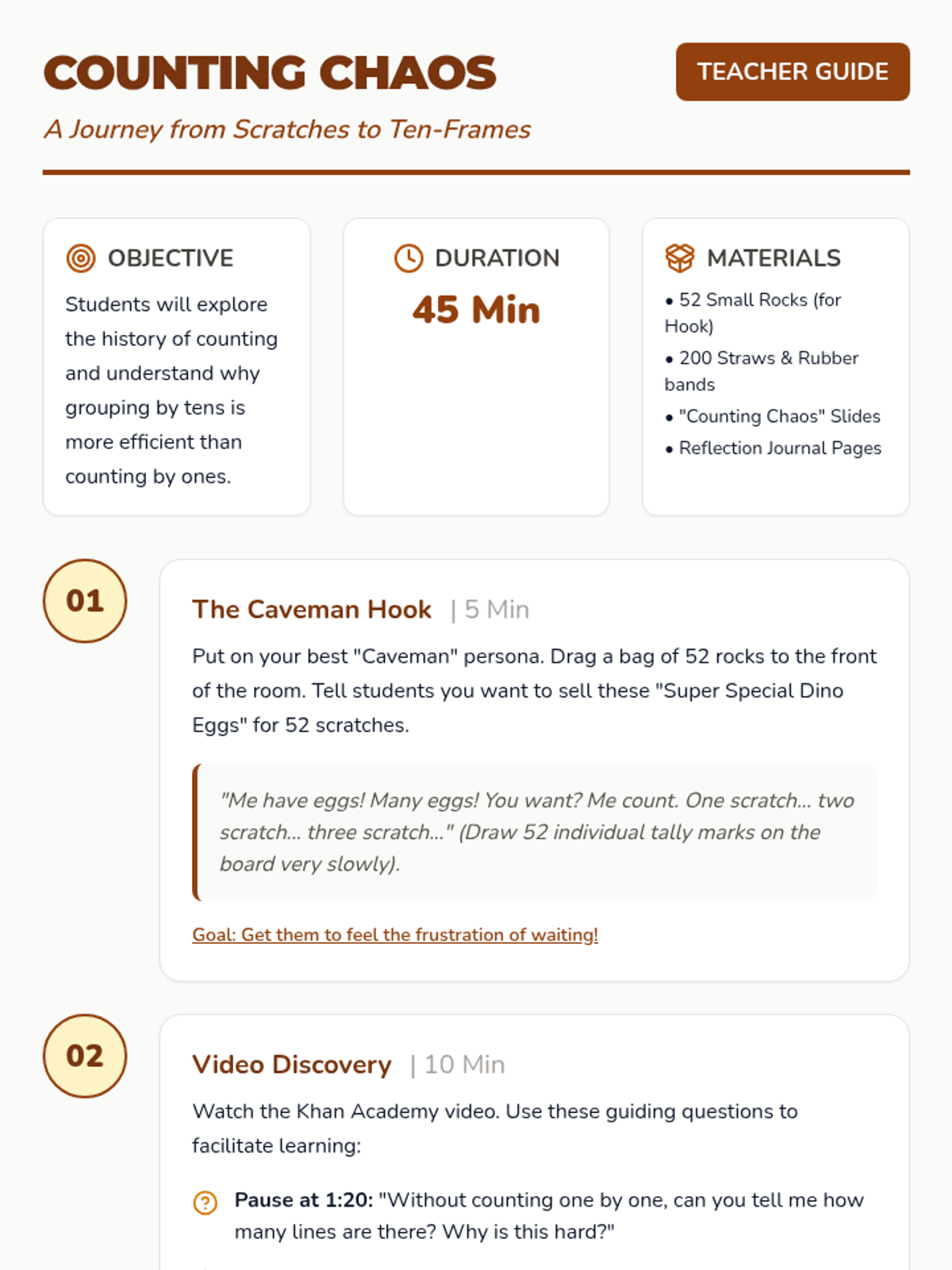 Students explore the history of counting, the frustration of tally marks, and the efficiency of the base-10 system through role-play, video, and a hands-on counting race.