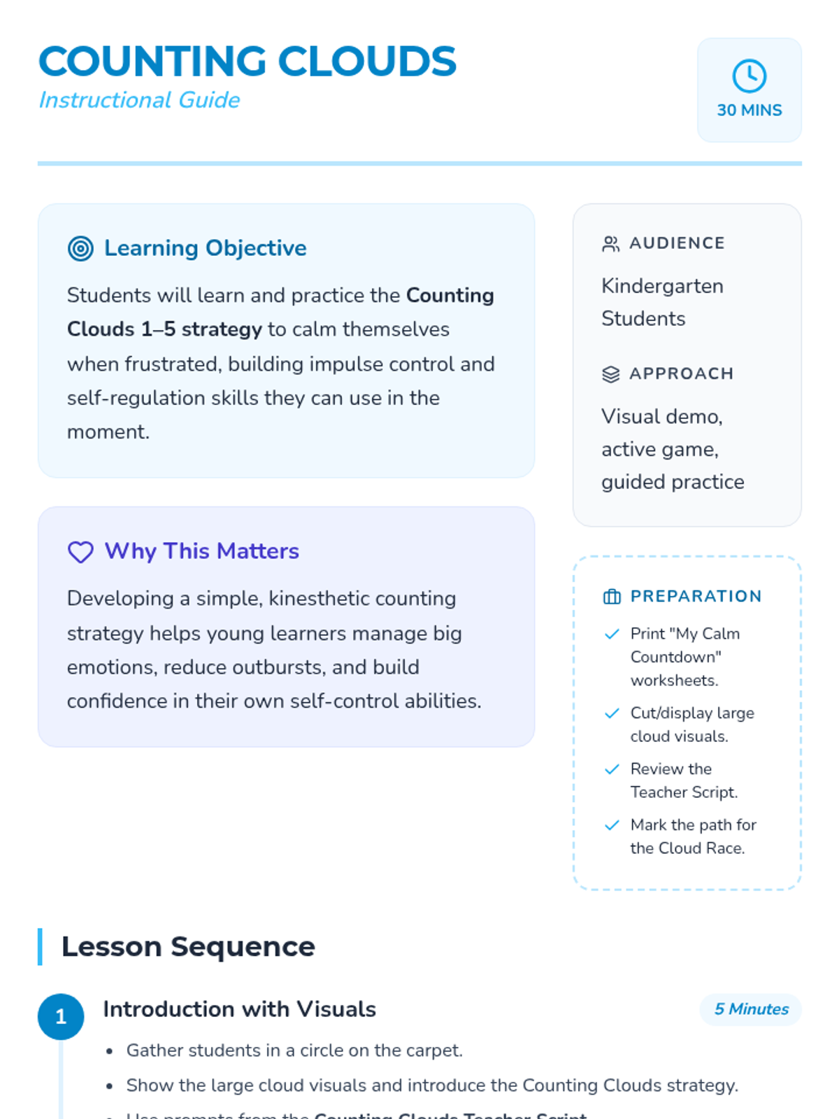 A 30-minute Kindergarten lesson that teaches students to manage frustration using a 1-5 counting strategy with deep breaths, using kinesthetic movement and visual aids.