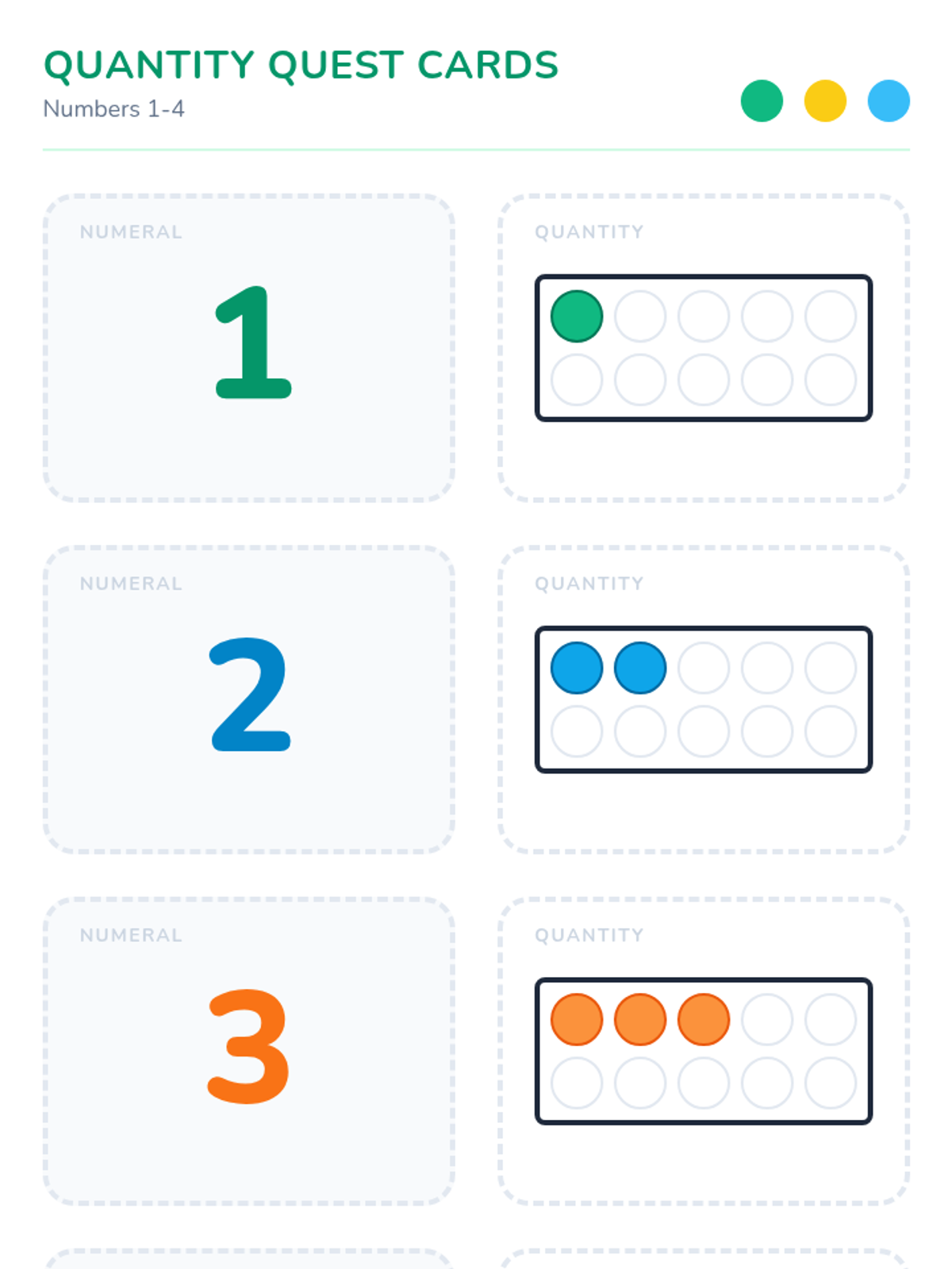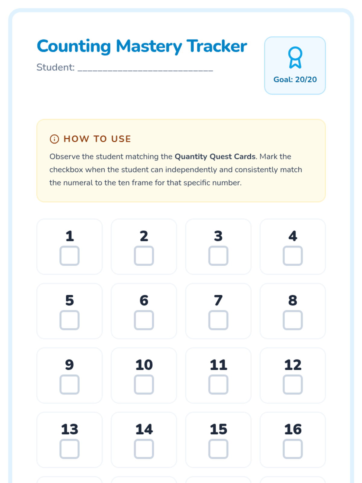 A set of hands-on materials designed for young learners to master number-to-quantity matching using numerals and ten frames up to 20. Optimized for clarity and engagement with high-contrast visuals and friendly design.