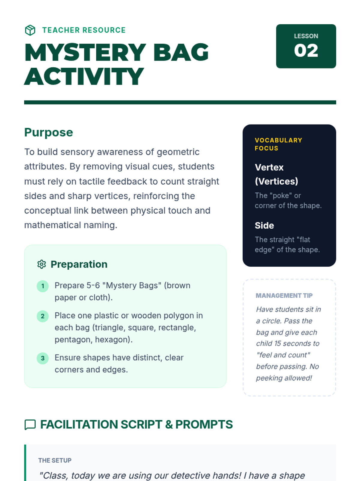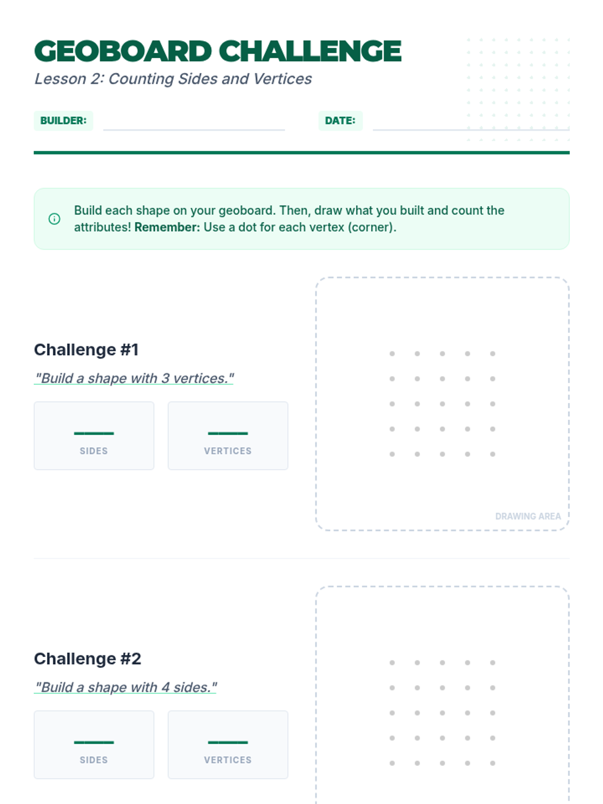 A hands-on workshop where students count straight sides and vertices to understand the physical properties of polygons.