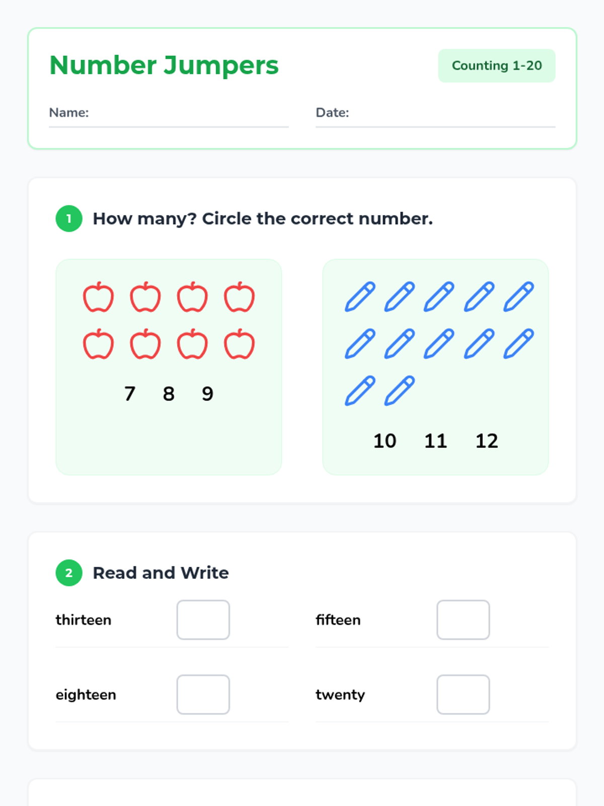 Learners practice counting objects and recognizing written numerals (1-20). The lesson involves rhythmic chanting and physical counting of classroom items to reinforce memory.