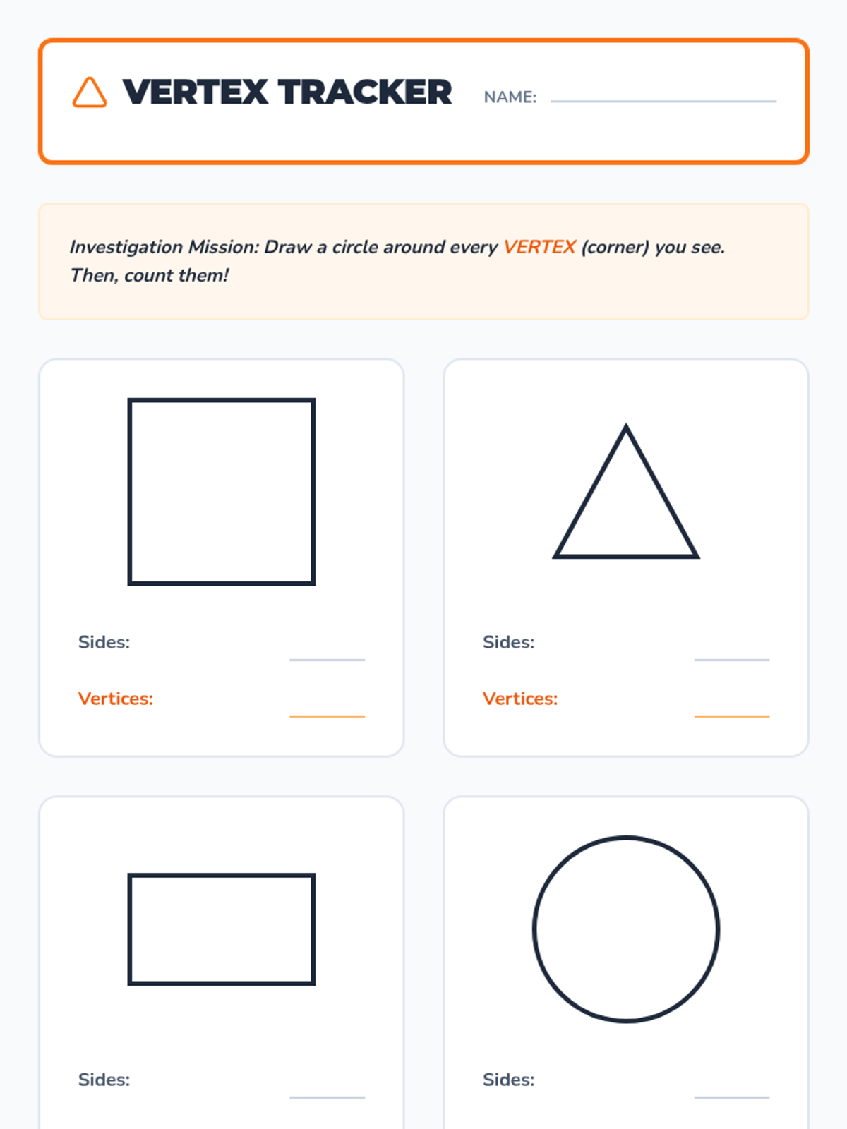 Students identify where sides meet to form vertices and correlate the number of sides with the number of vertices.