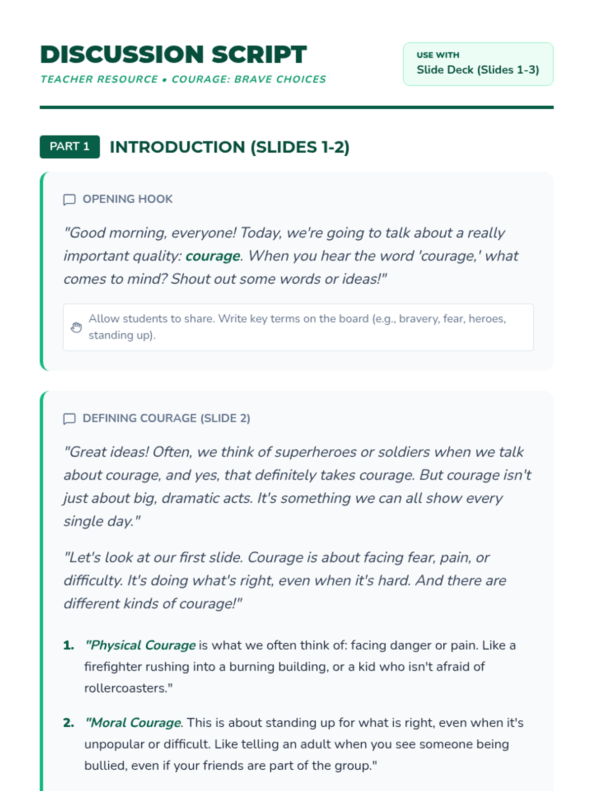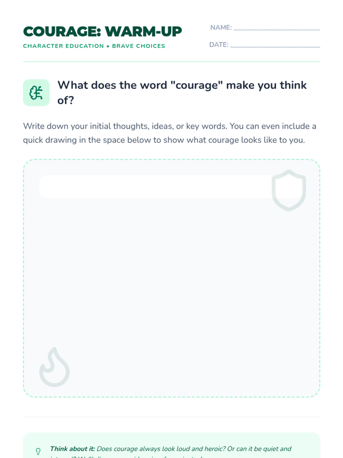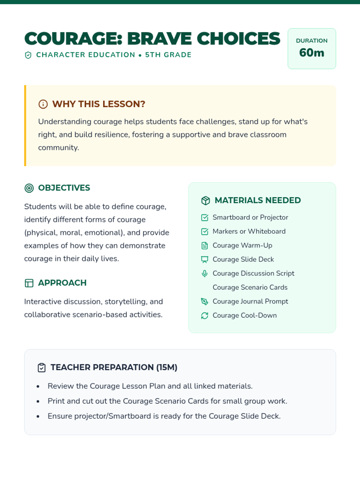 This lesson helps 5th-grade students understand what courage is, recognize different forms of bravery, and identify ways they can demonstrate courage in their daily lives.