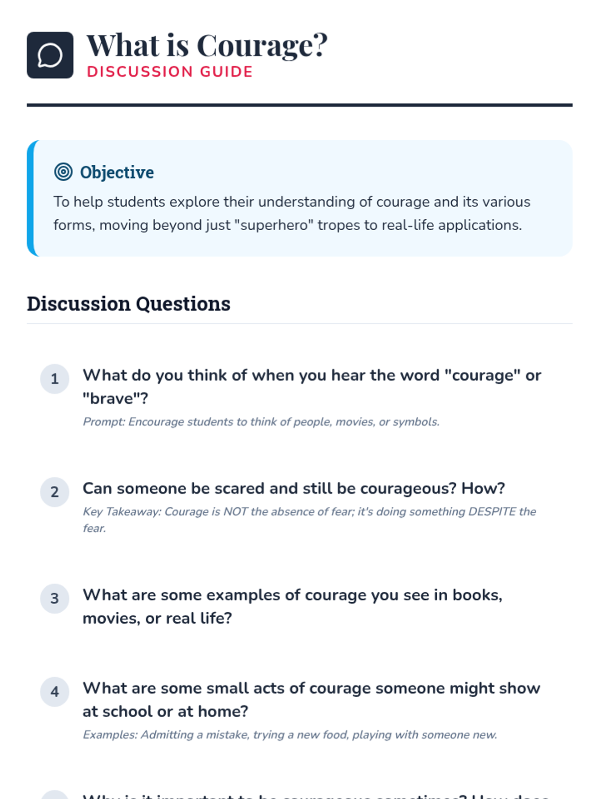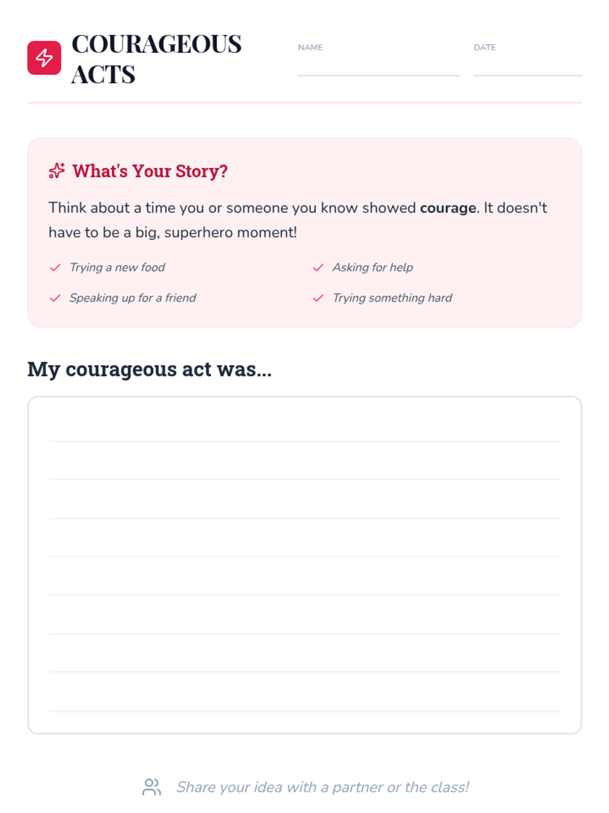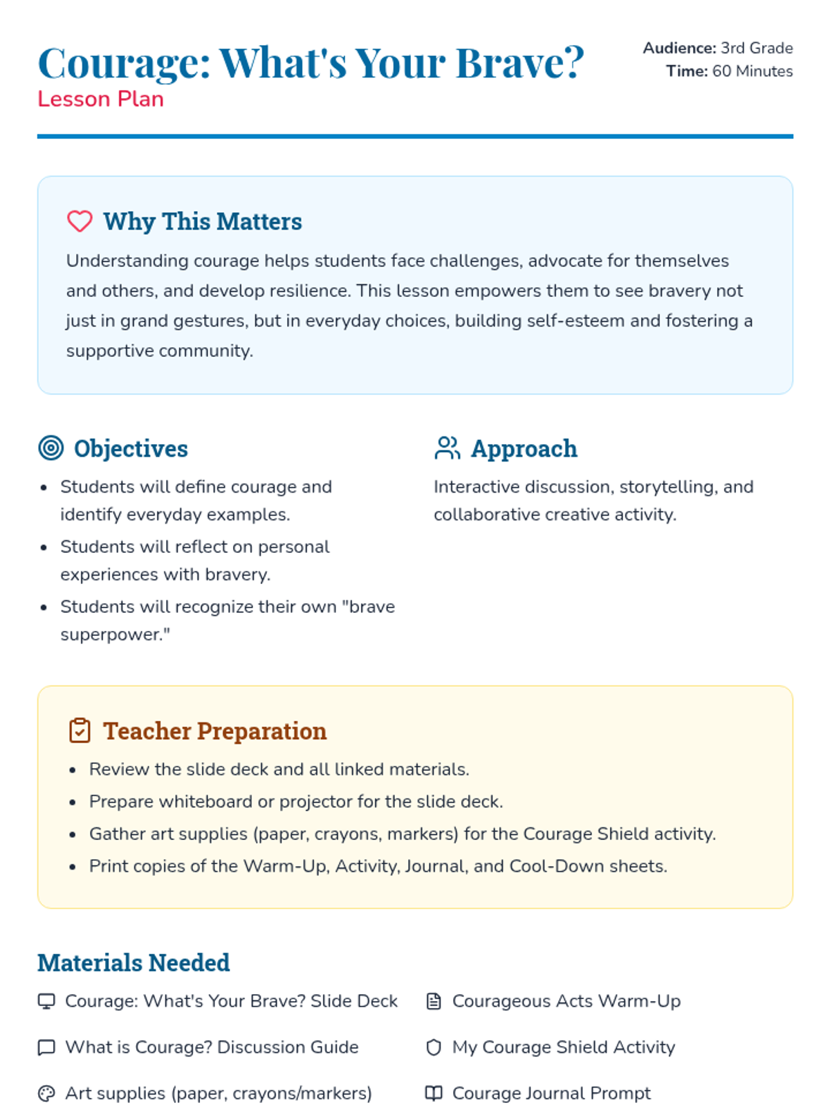This lesson introduces 3rd-grade students to the concept of courage, exploring what it means to be brave in everyday situations through discussion, storytelling, and creative reflection.