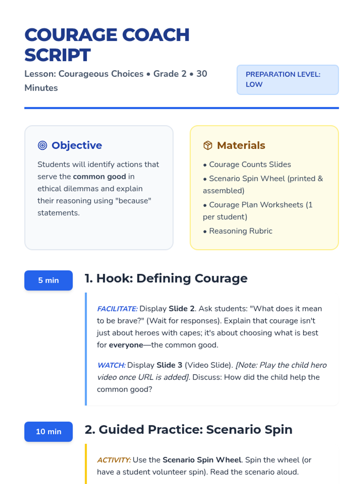 In this character-building lesson, 2nd-grade students explore the concept of courage through the lens of the common good. They will engage with ethical dilemmas using a scenario wheel and learn to articulate and defend choices that benefit their community.