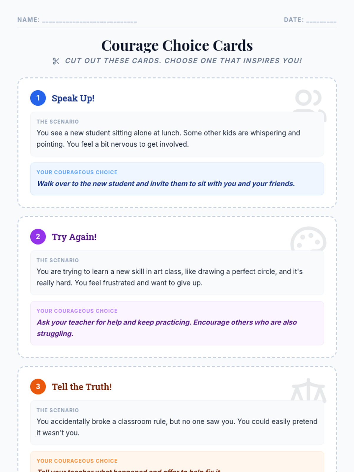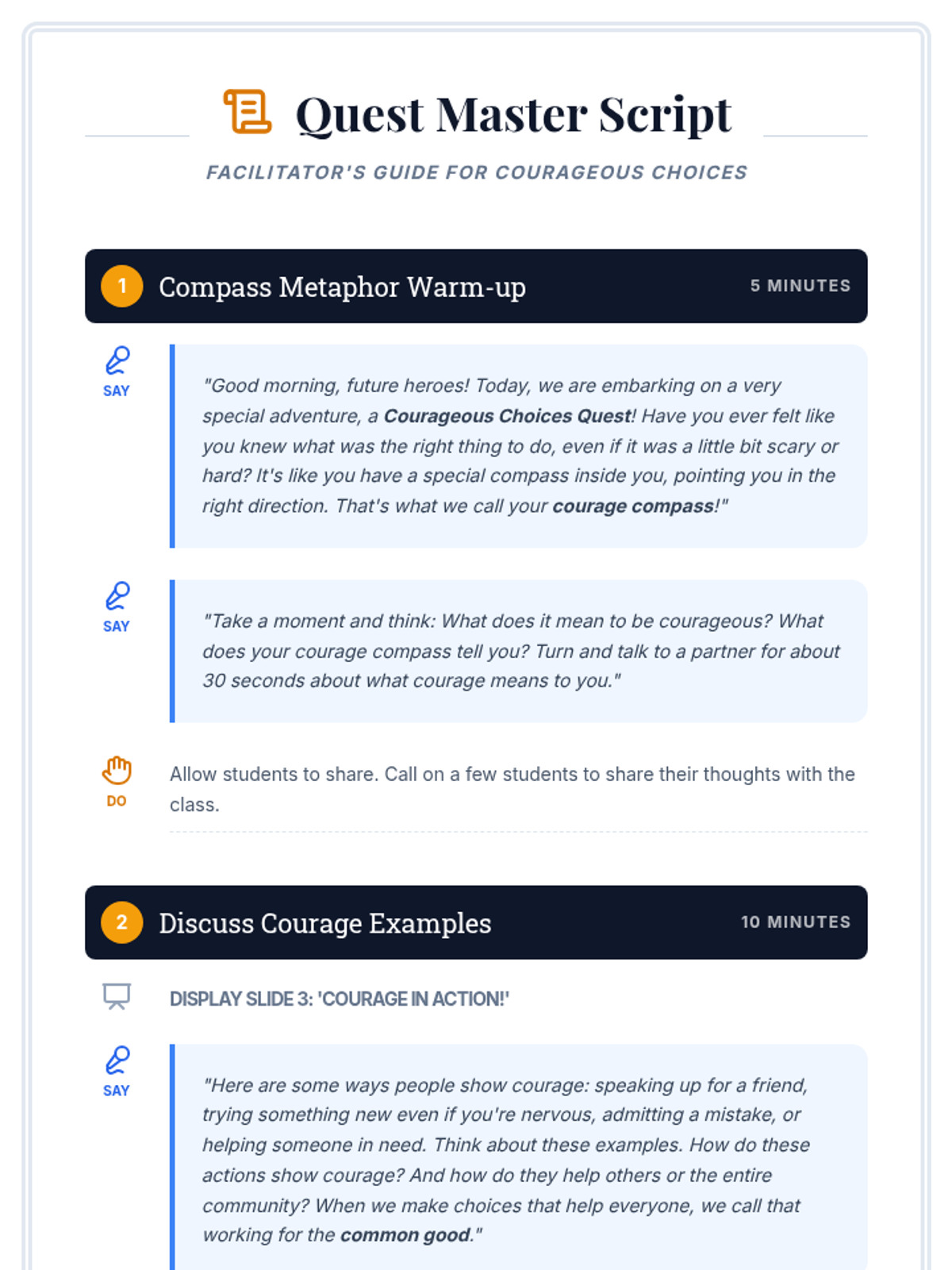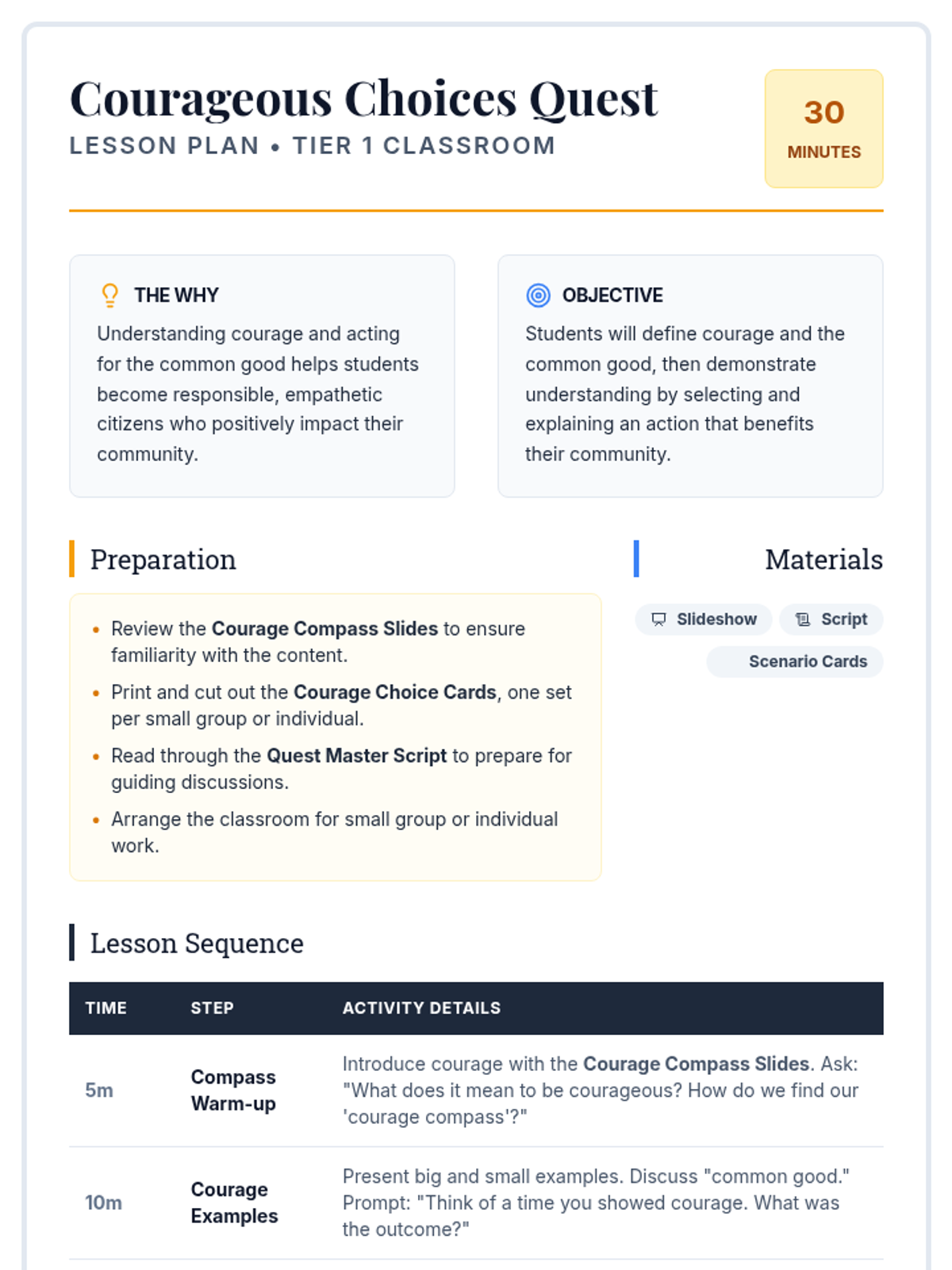 This lesson empowers 4th-grade students to understand and demonstrate courage by making choices that benefit the common good through a "quest" metaphor and interactive scenario cards.