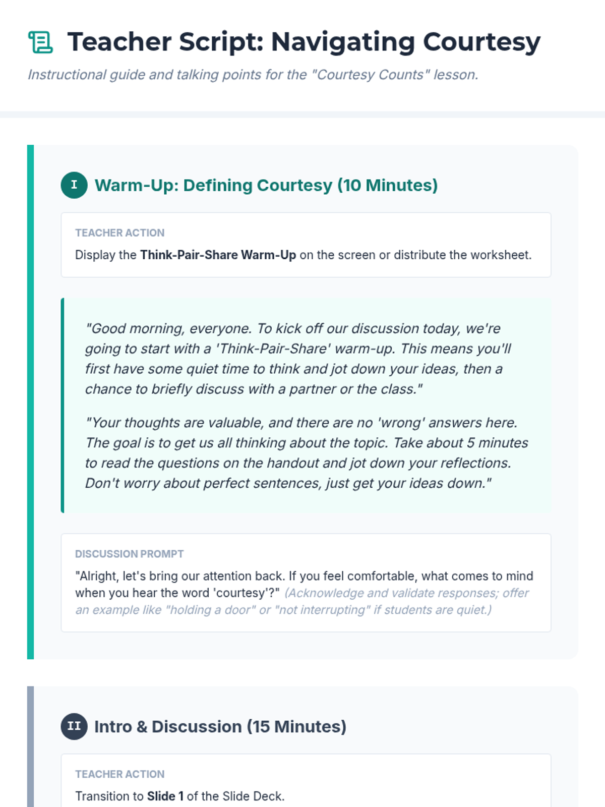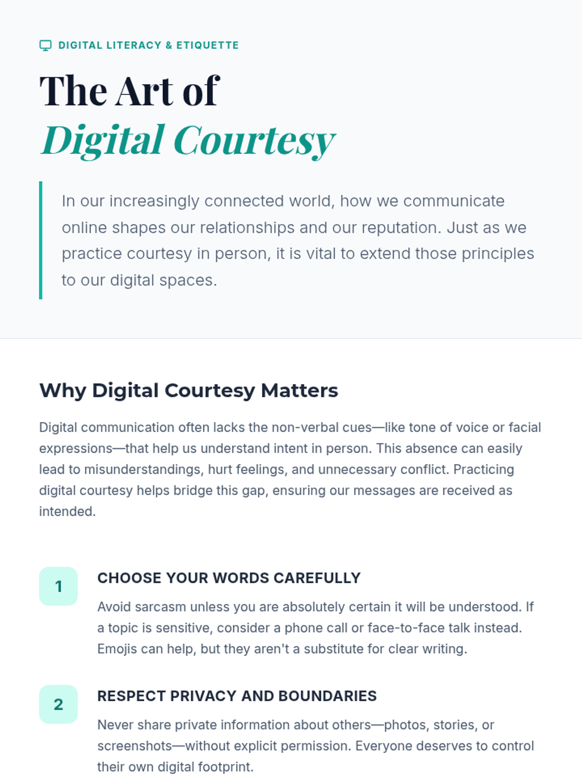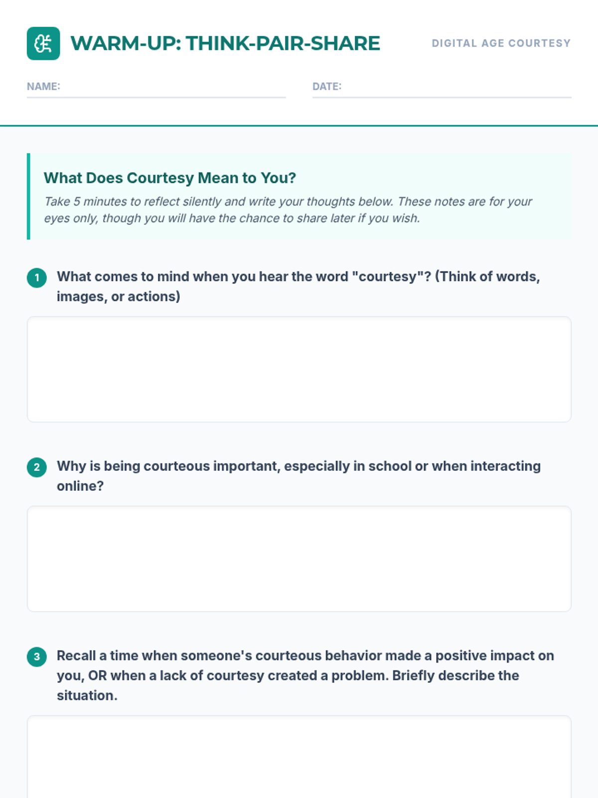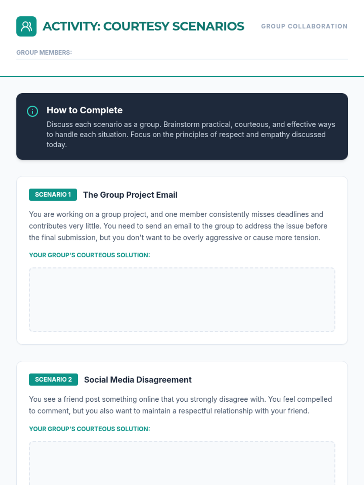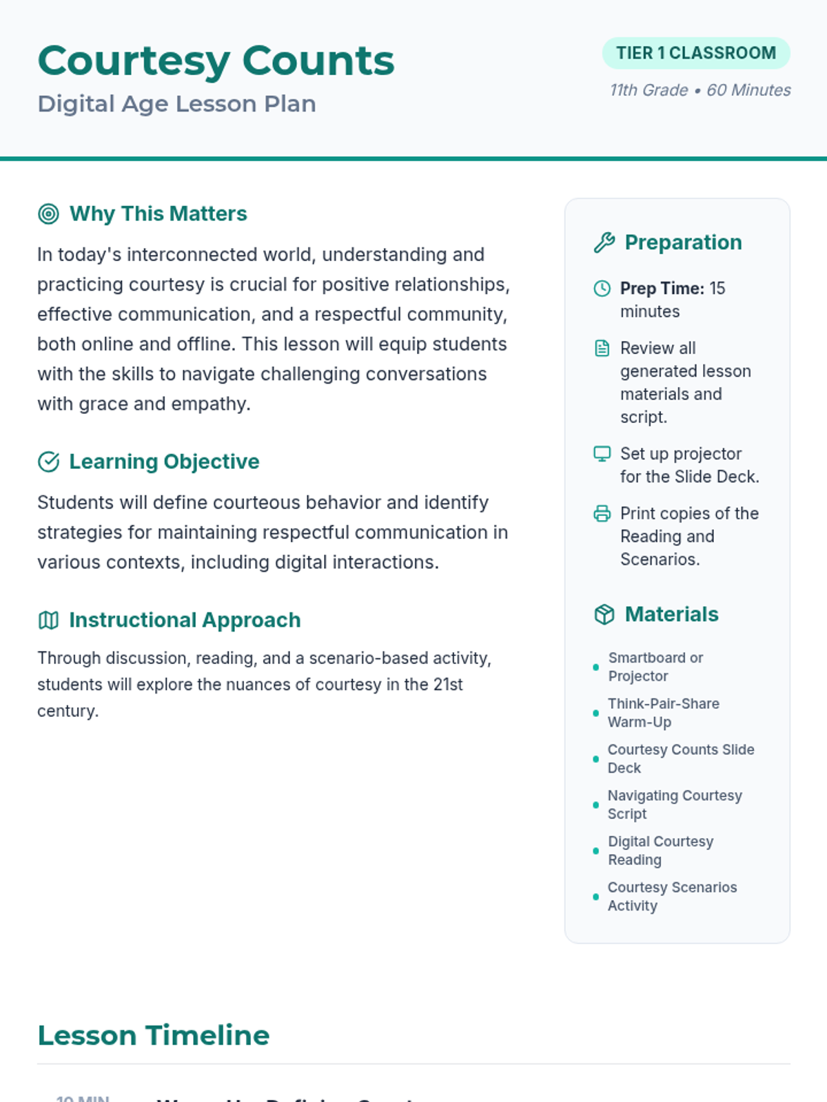 A 60-minute lesson for 11th-grade students on the importance of courtesy in digital and real-world interactions, featuring a reading, scenario-based group work, and guided discussion.