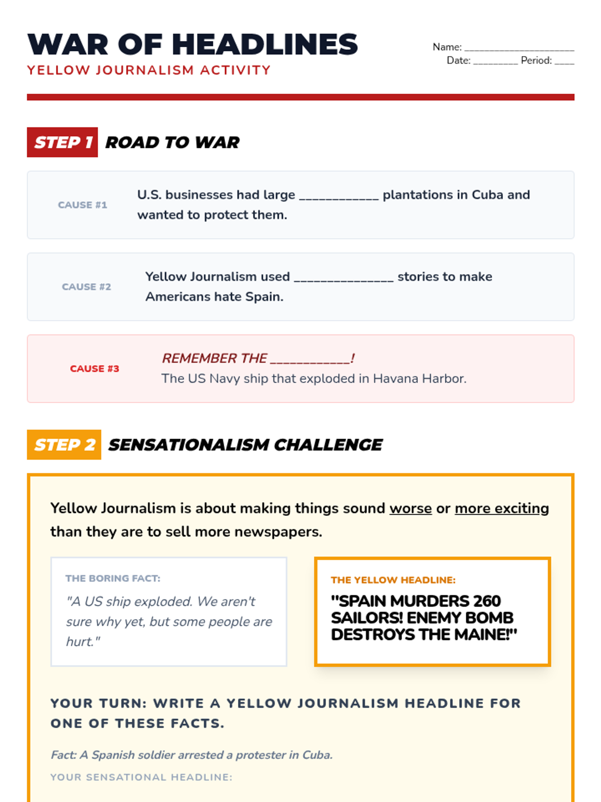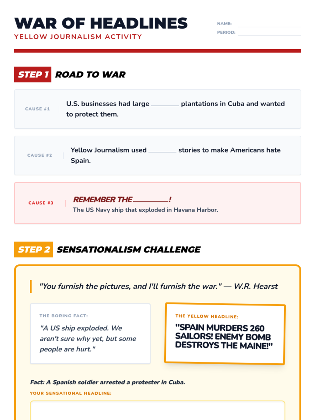 An exploration of the causes of the Spanish-American War, focusing on the role of yellow journalism and the USS Maine.