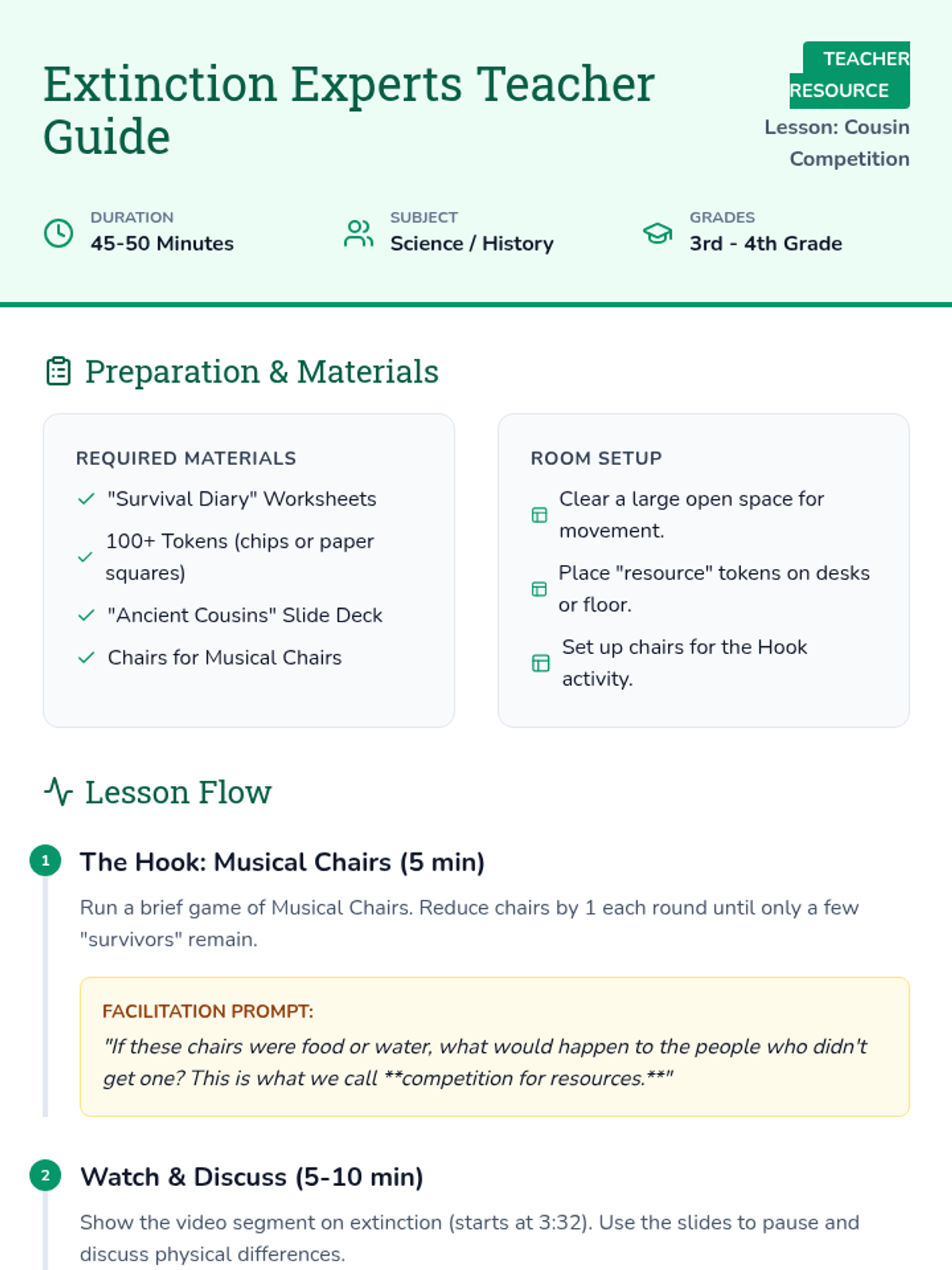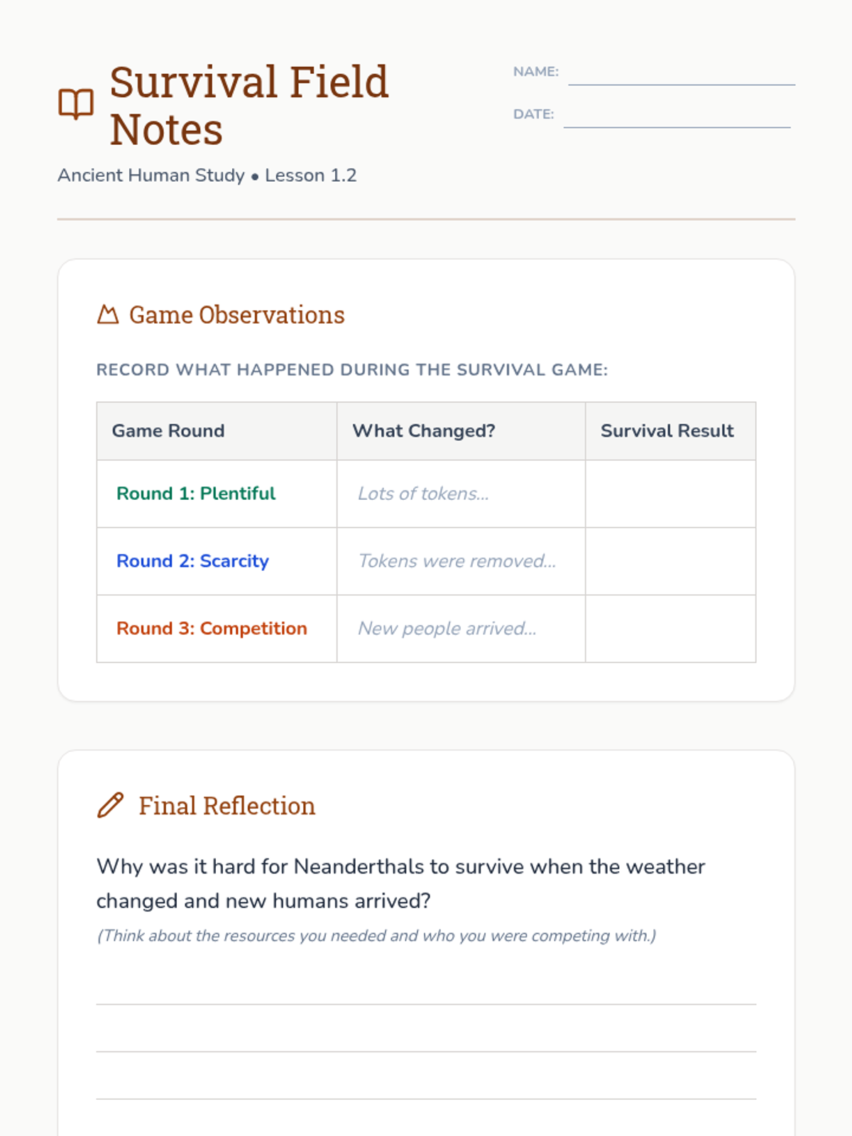 Students explore extinction and competition by roleplaying Neanderthals and Homo sapiens during a period of climate change and shifting resources.