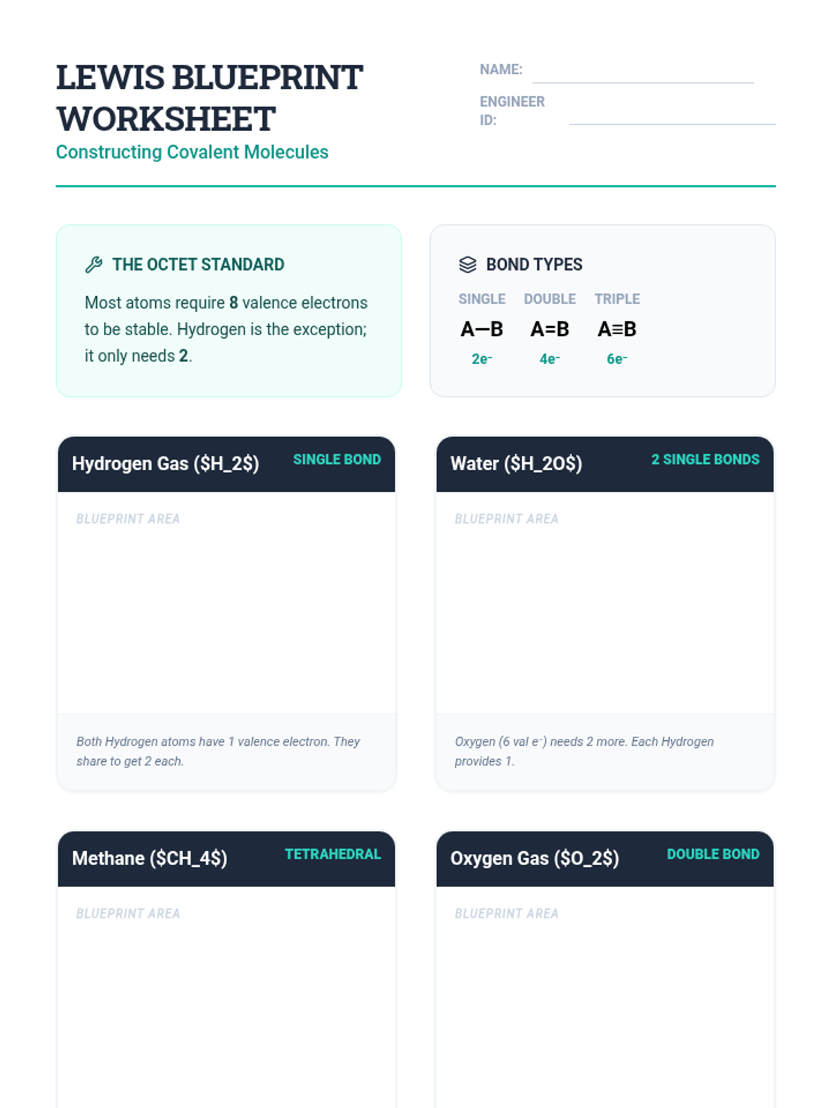 The lesson introduces covalent bonding as a cooperative sharing of electrons between non-metals. Students learn to draw single, double, and triple bonds using Lewis structures to satisfy the Octet Rule for both atoms.