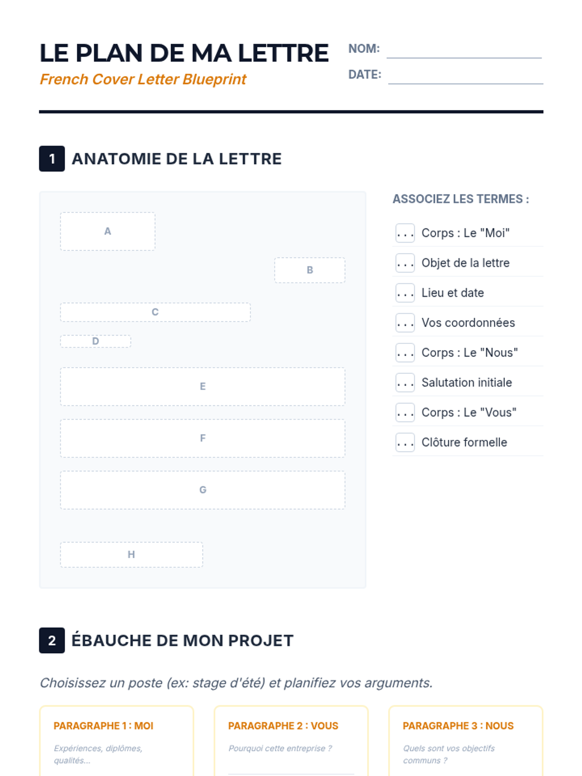 Students deconstruct and draft a formal French 'lettre de motivation,' learning the specific layout and self-promotion vocabulary required in the Francophone world.