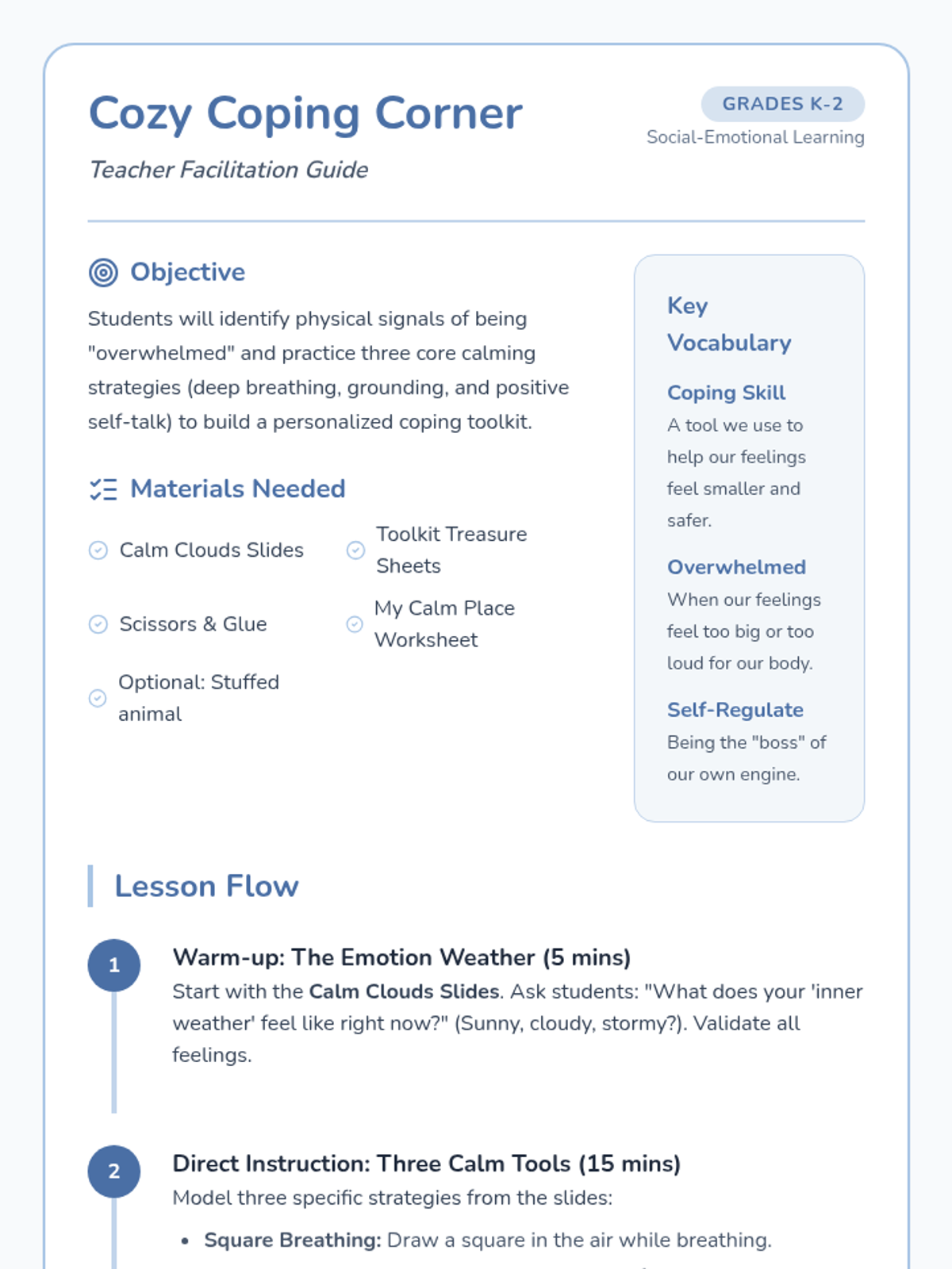 A gentle, social-emotional learning lesson for K-2 students to discover and practice self-regulation techniques. Students will explore calming strategies and create their own 'toolkit' for managing big emotions.