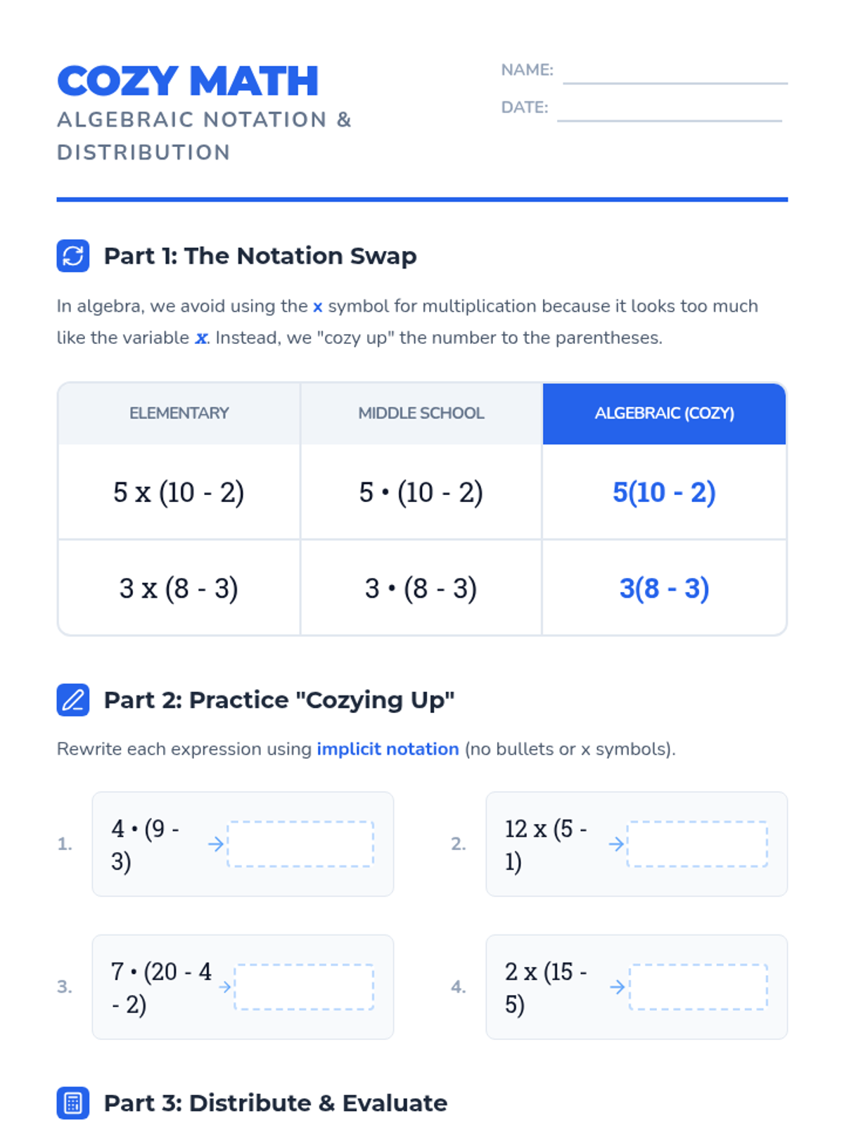 This lesson transitions 6th-grade students from using the 'x' symbol for multiplication to algebraic 'implicit' notation (cozying up numbers to parentheses). It uses the Distributive Property over subtraction as the primary vehicle for practicing this new notation.