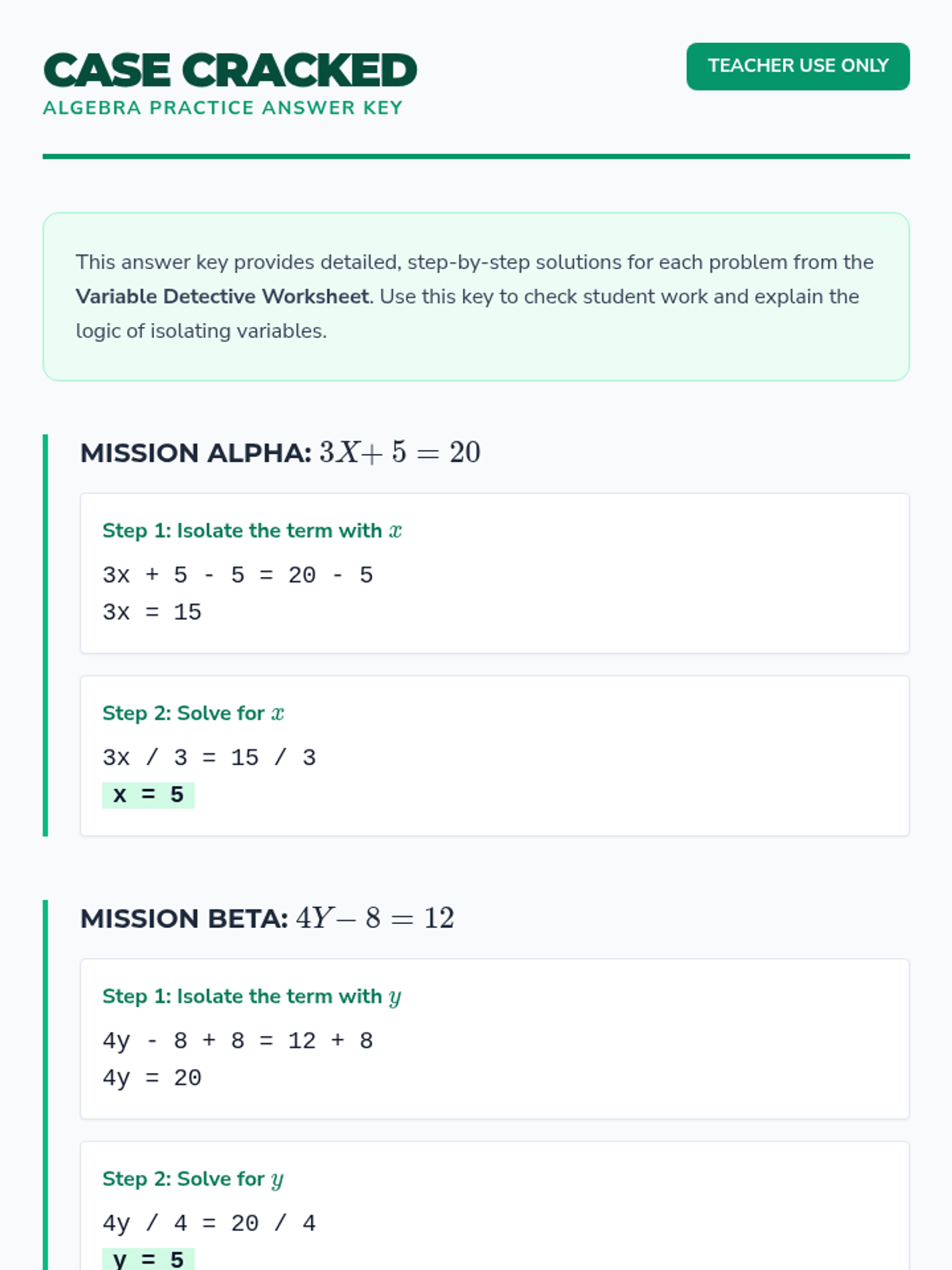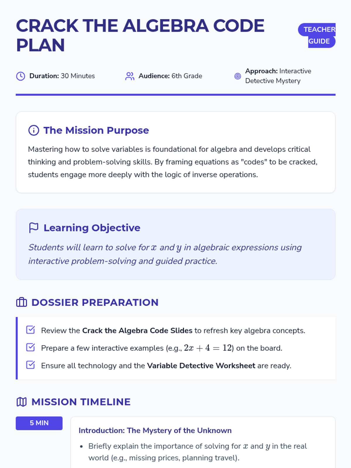 A 30-minute introductory lesson for 6th graders on solving one-step and two-step algebraic equations using a 'crack the code' detective theme.