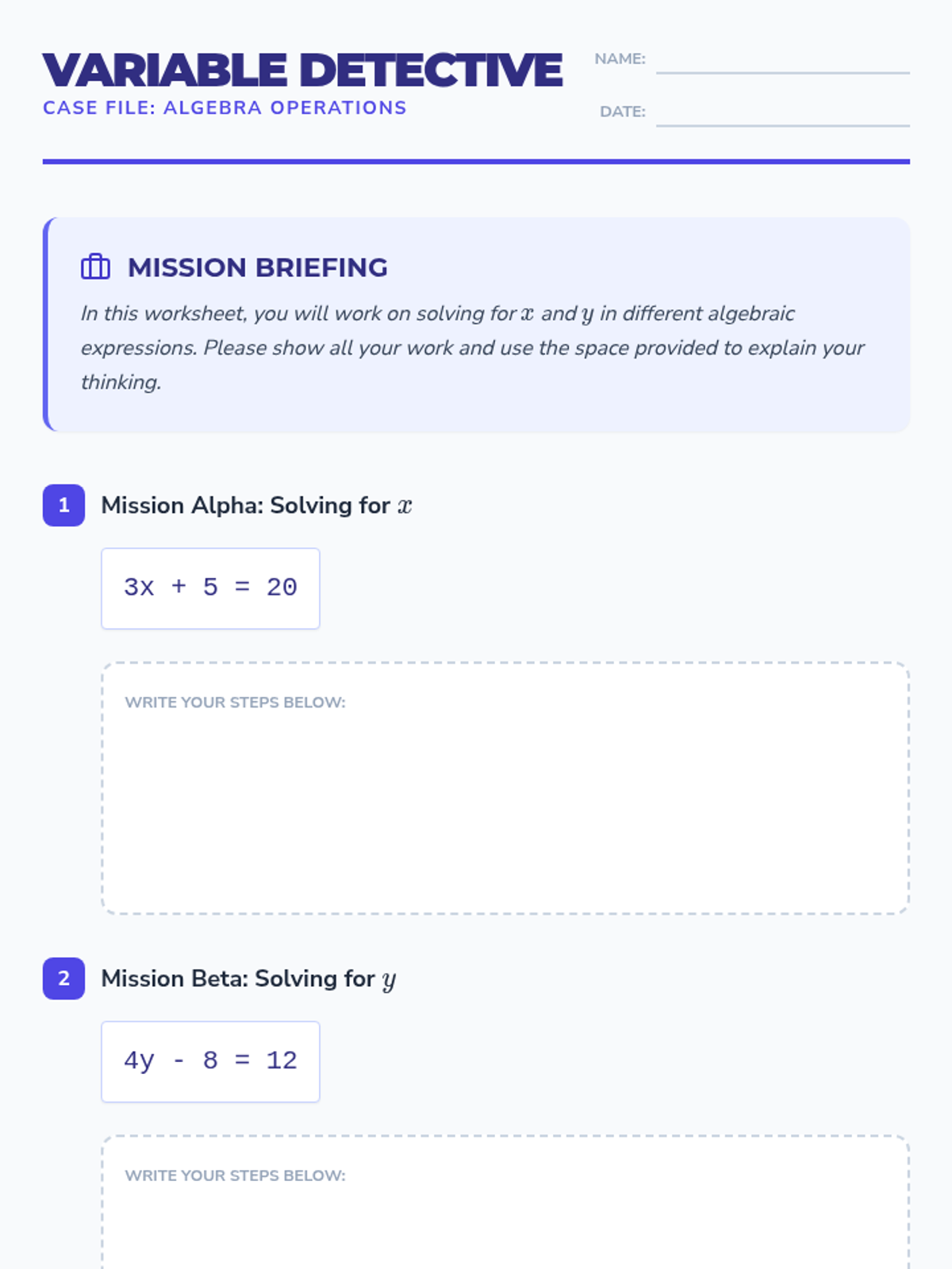A concise assessment focused on NC.6.EE standards (Expressions and Equations) designed for calculator-inactive practice. Students will demonstrate mastery in evaluating expressions, solving one-step equations, and representing real-world scenarios with algebraic notation.