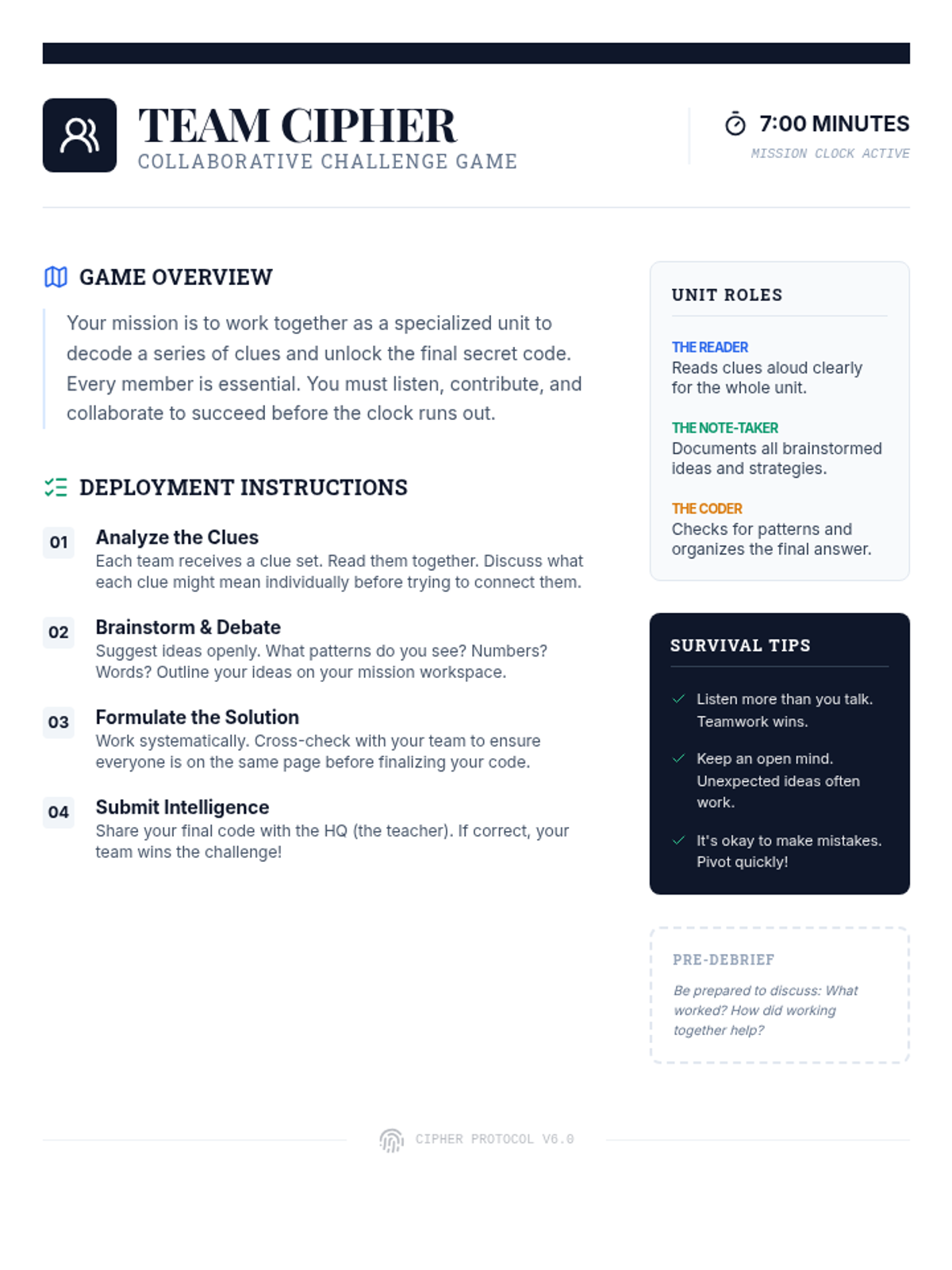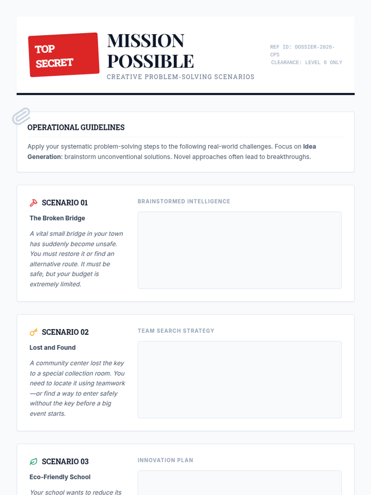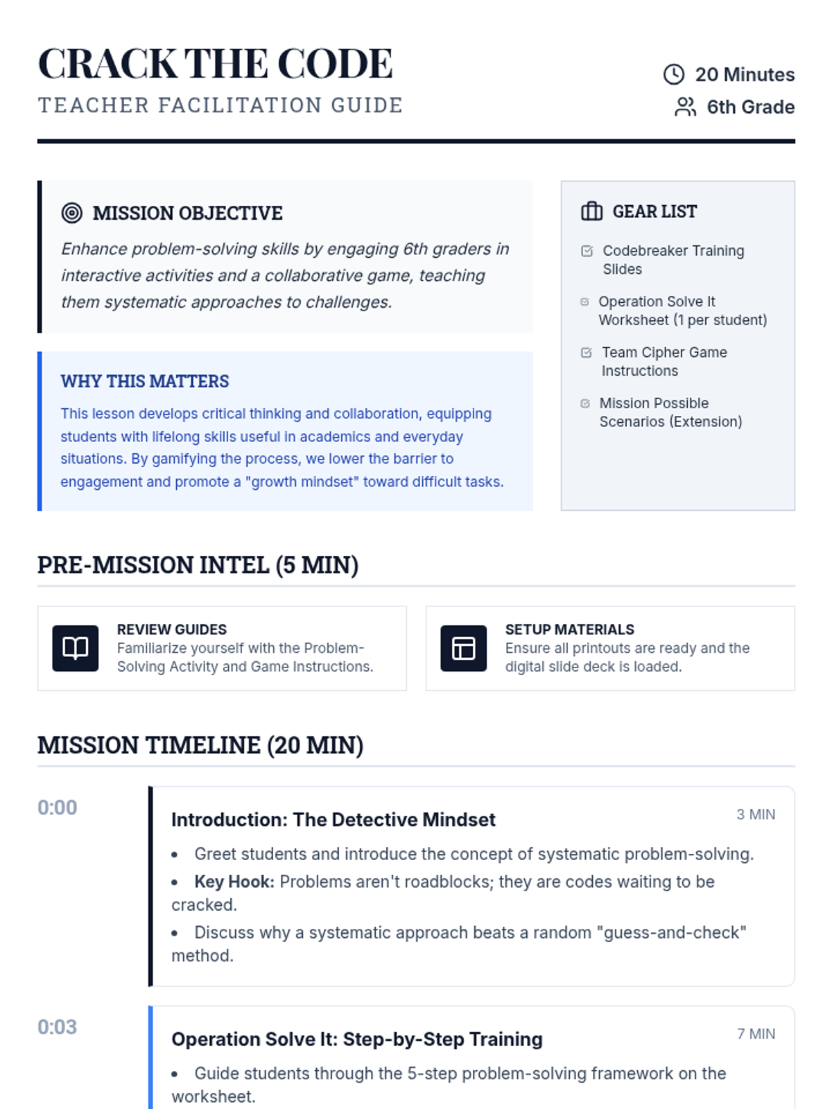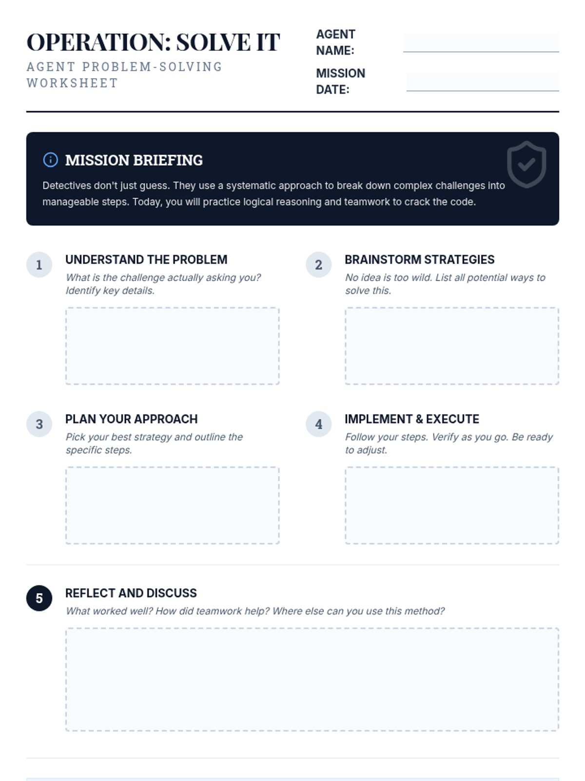 This engaging 20-minute lesson for 6th graders focuses on systematic problem-solving, critical thinking, and collaboration through a detective-themed series of challenges. Students learn to analyze problems, brainstorm strategies, and work as a team to 'crack the code' of various scenarios.