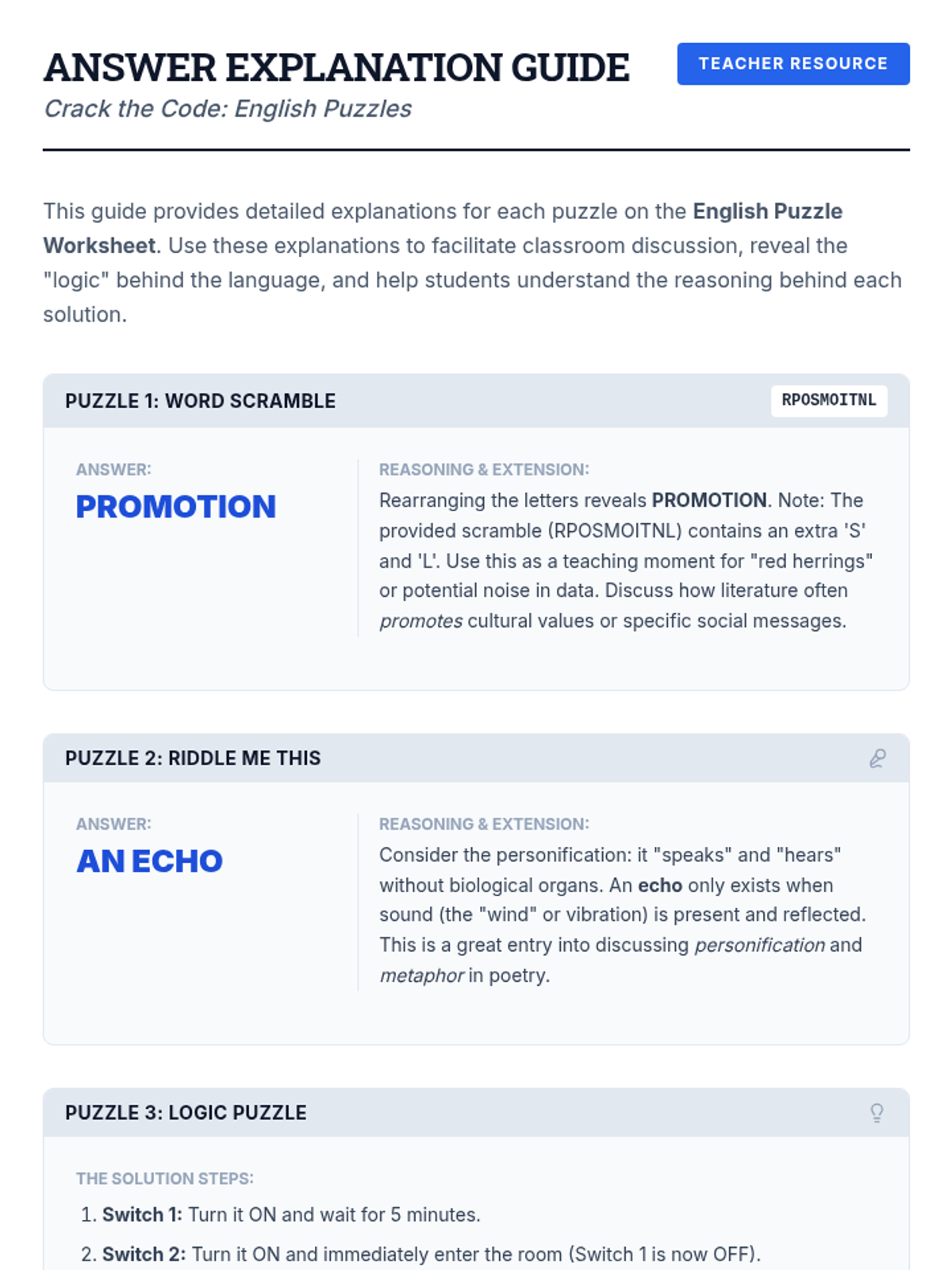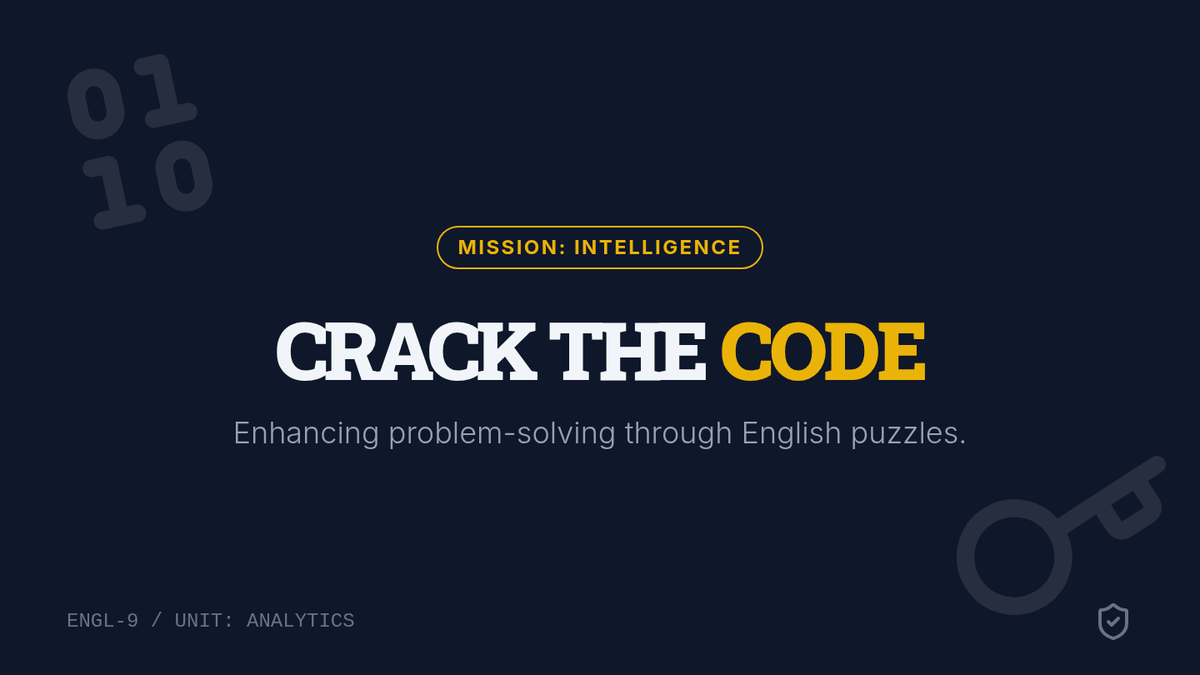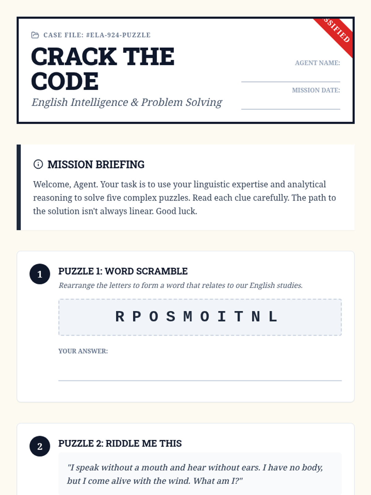 A 30-minute interactive session for 9th graders focusing on analytical thinking and language arts through a series of engaging puzzles and riddles. Students will work together to 'crack the code' and develop critical problem-solving strategies.