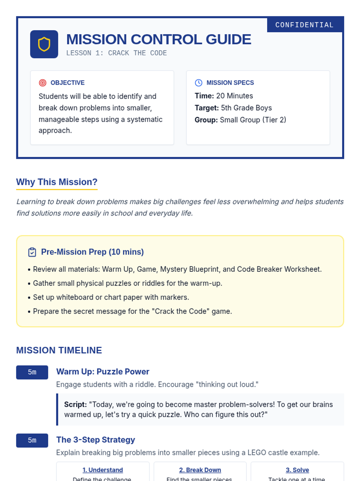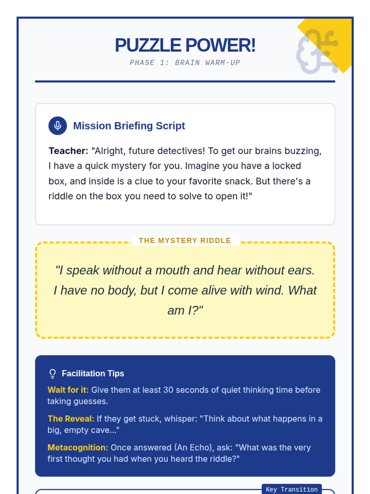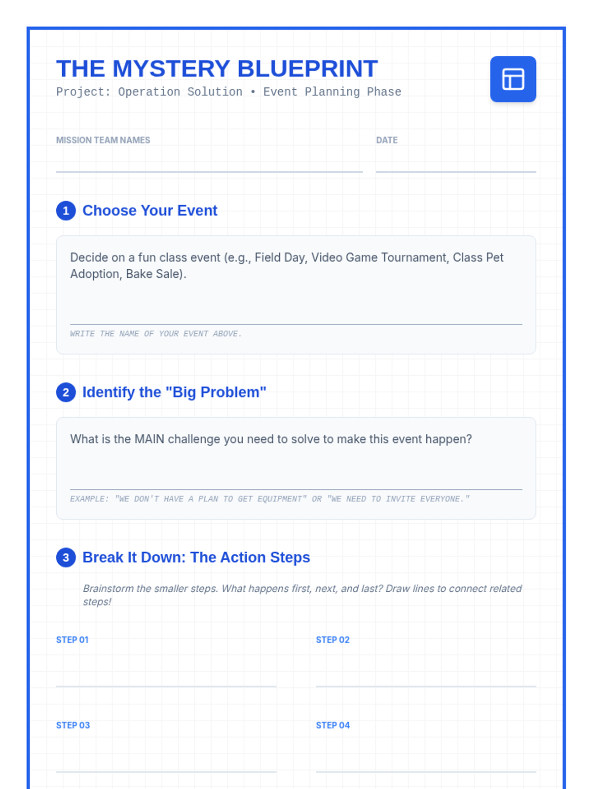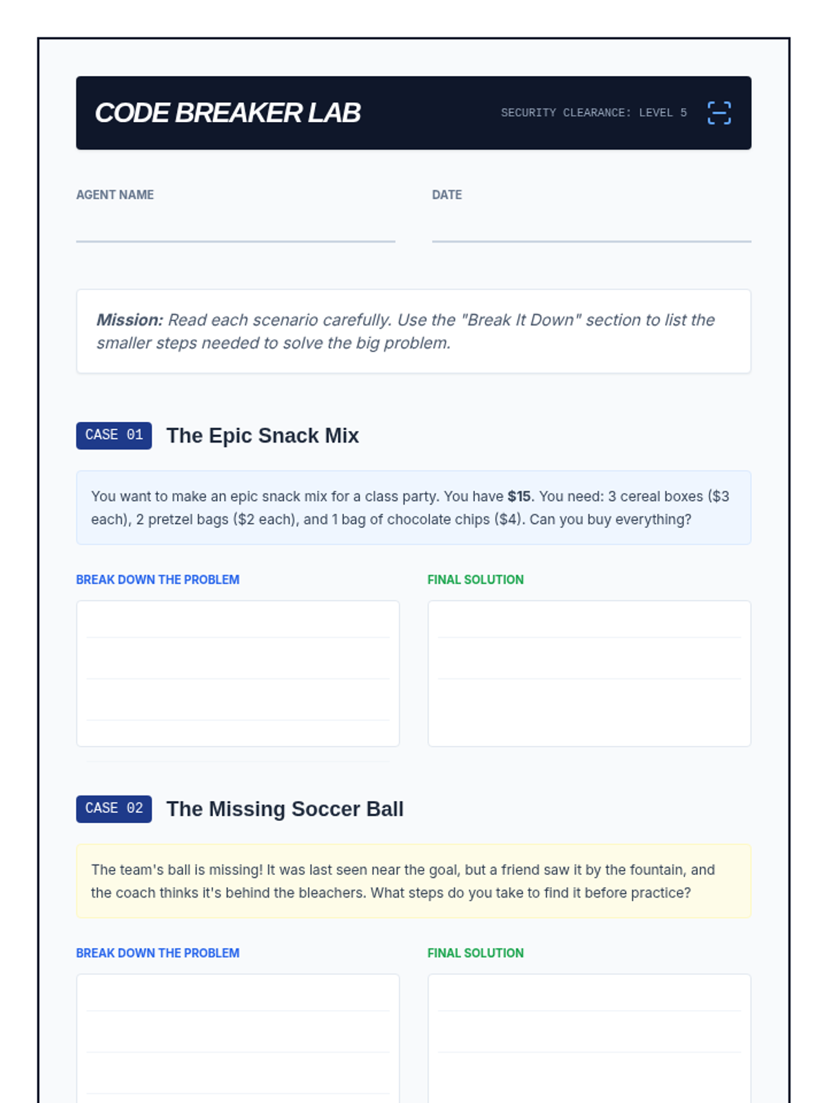 Students learn to deconstruct large challenges into manageable steps through puzzles and collaborative planning.