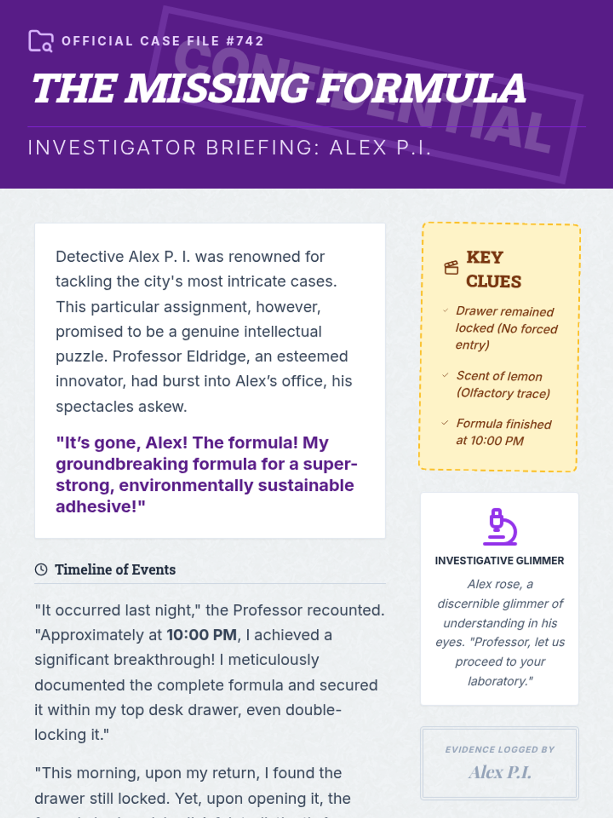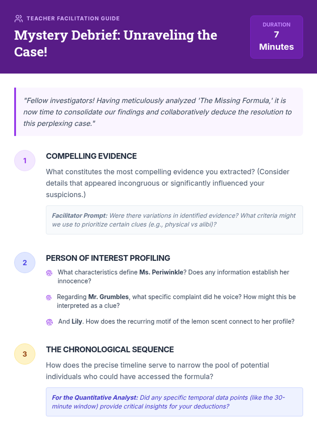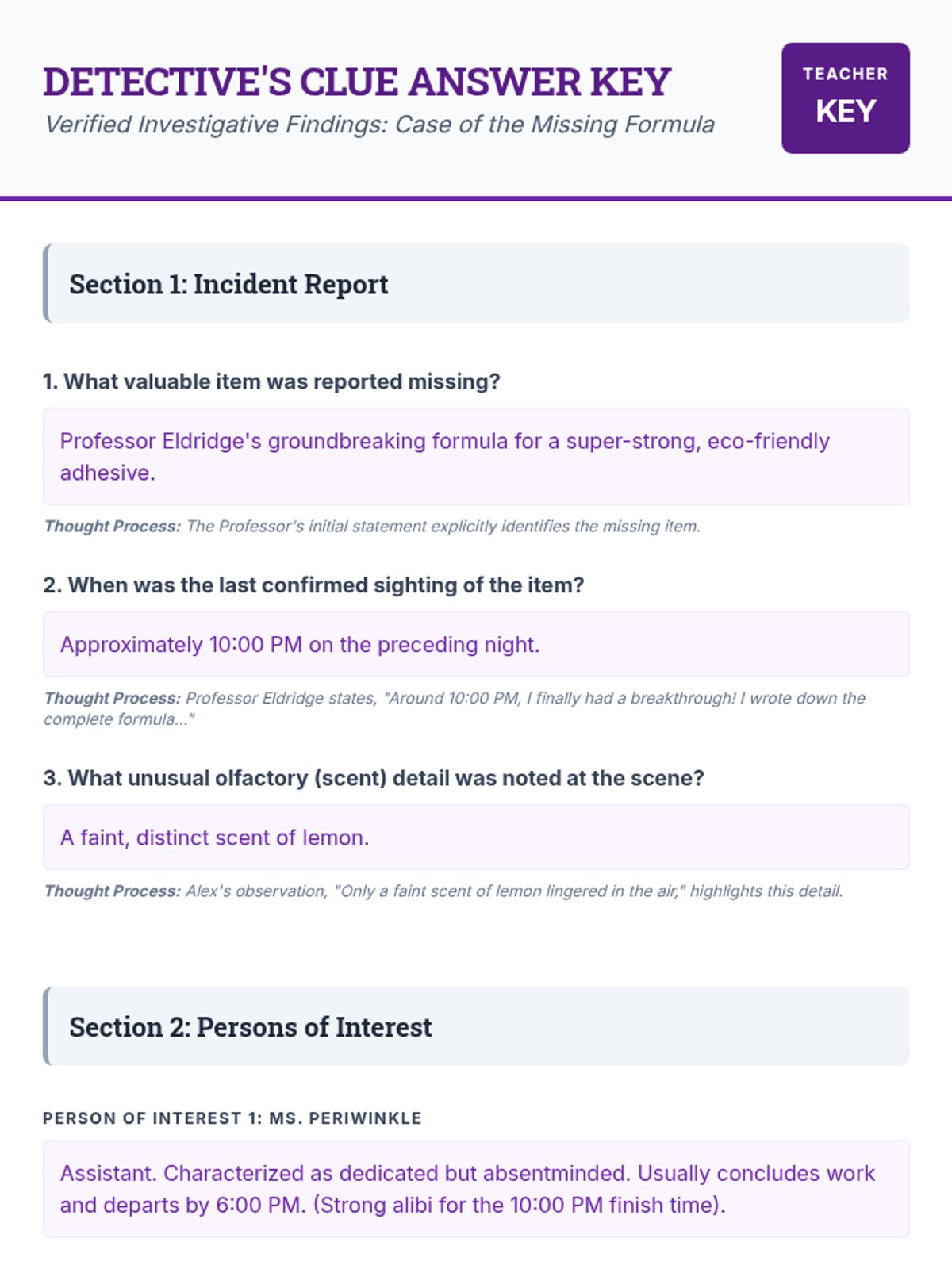 Students act as junior investigators to solve the mystery of Professor Eldridge's missing formula. They analyze alibis, physical evidence like scents, and a chronological timeline to identify the person responsible for the formula's disappearance.