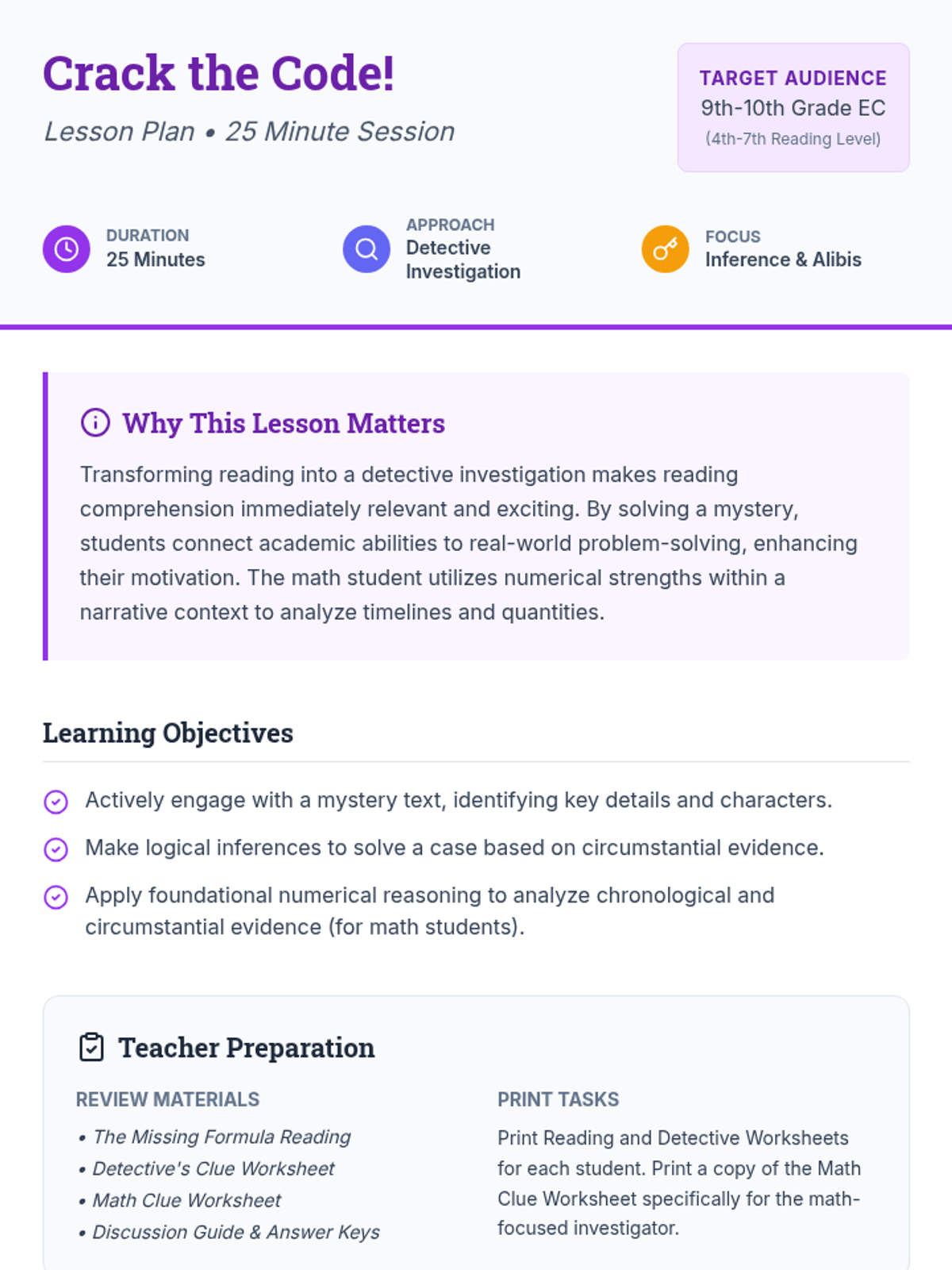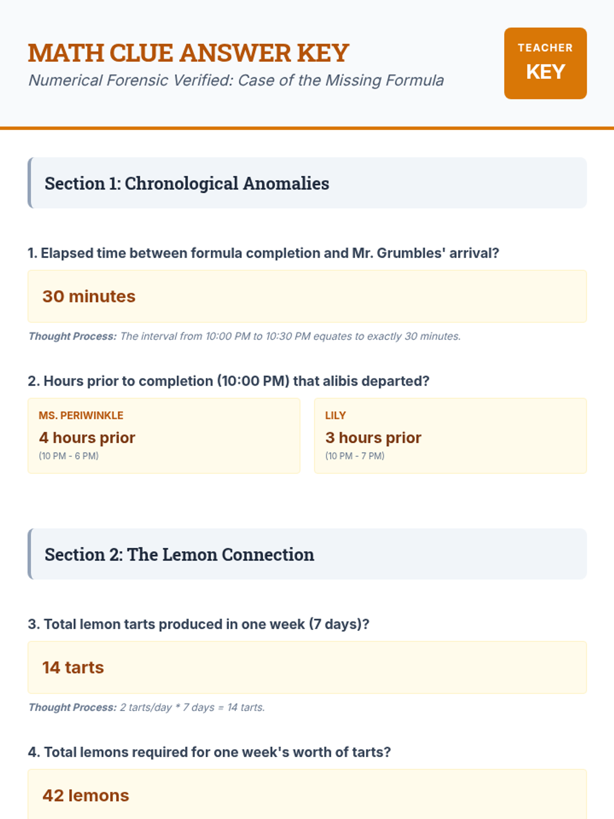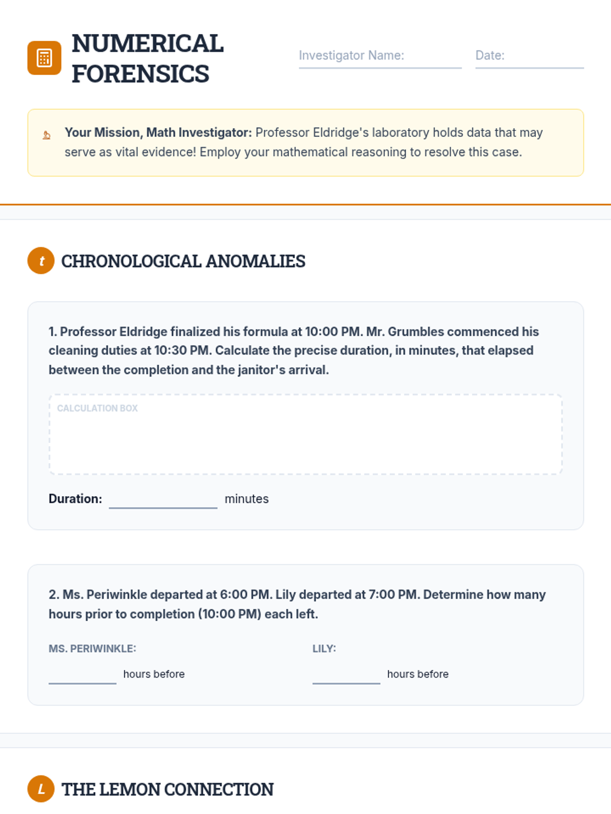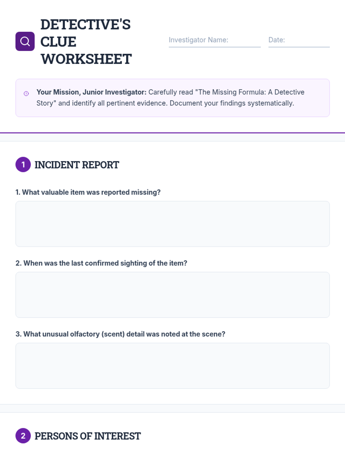 Students act as junior investigators to solve the mystery of Professor Eldridge's missing formula. They analyze alibis, physical evidence like scents, and a chronological timeline to identify the person responsible for the formula's disappearance.
