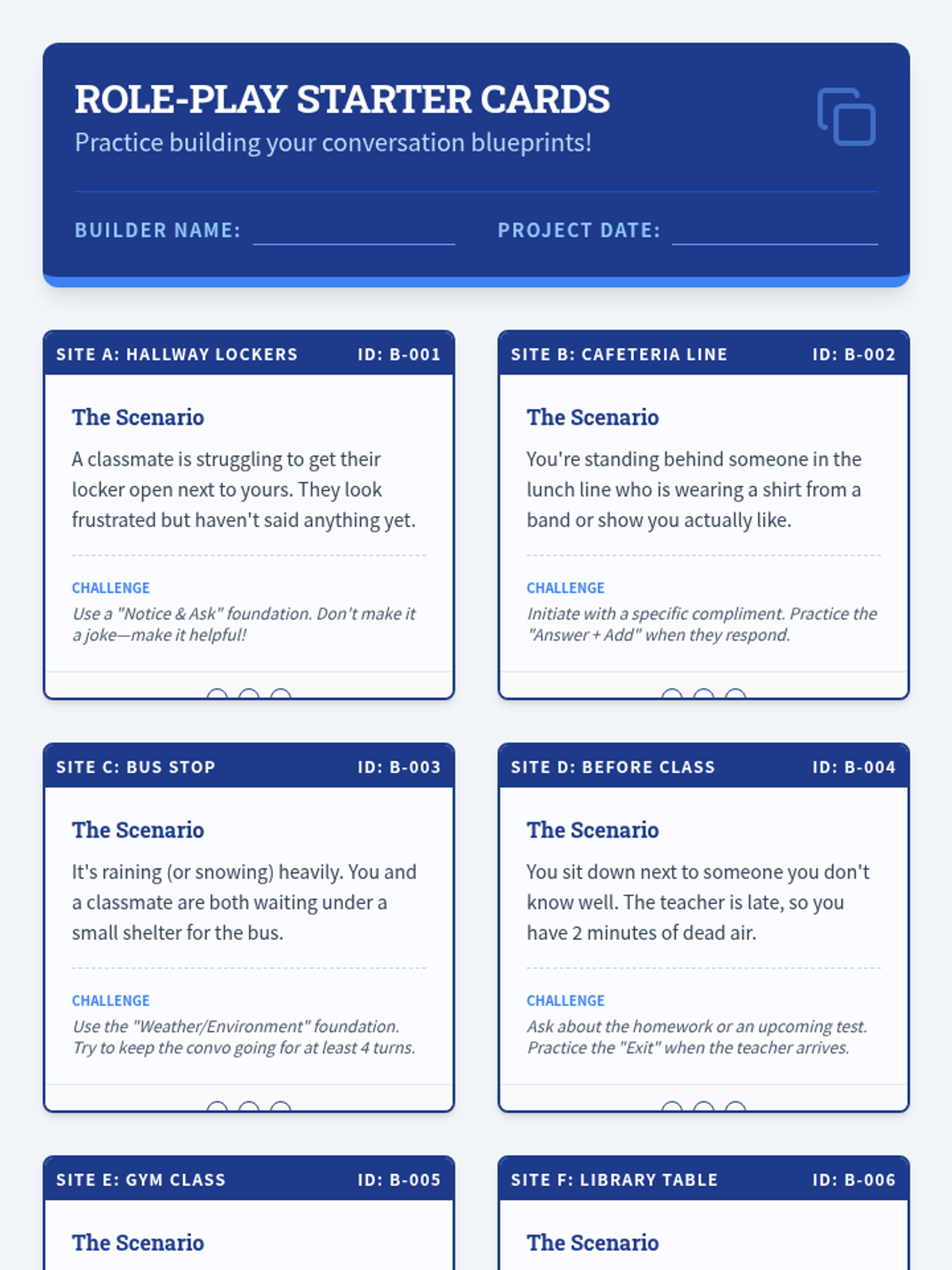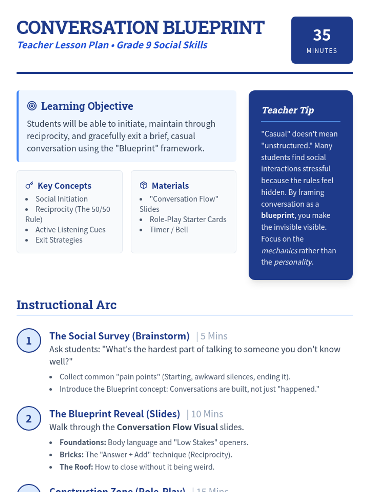A 35-minute lesson for 9th graders on the mechanics of casual conversation, focusing on initiation, reciprocity, active listening, and gracefully ending interactions. Students use a blueprint-themed framework to build social confidence.