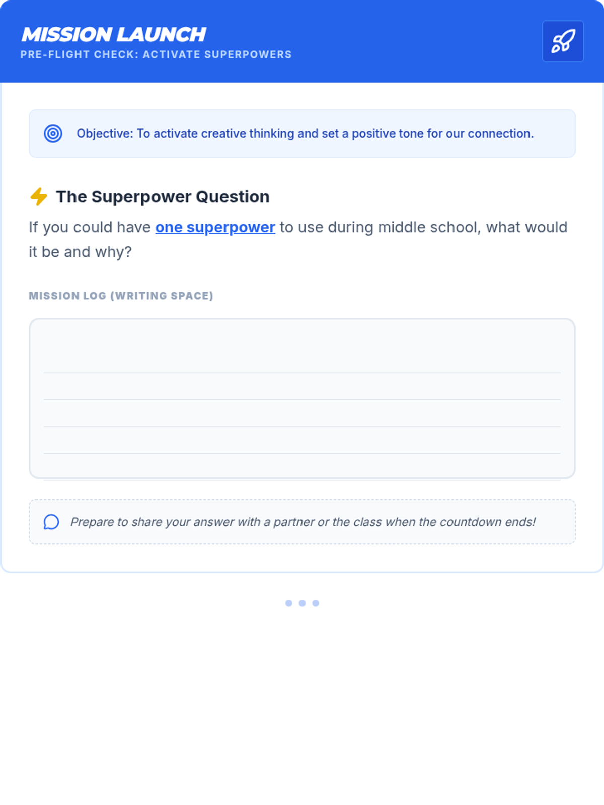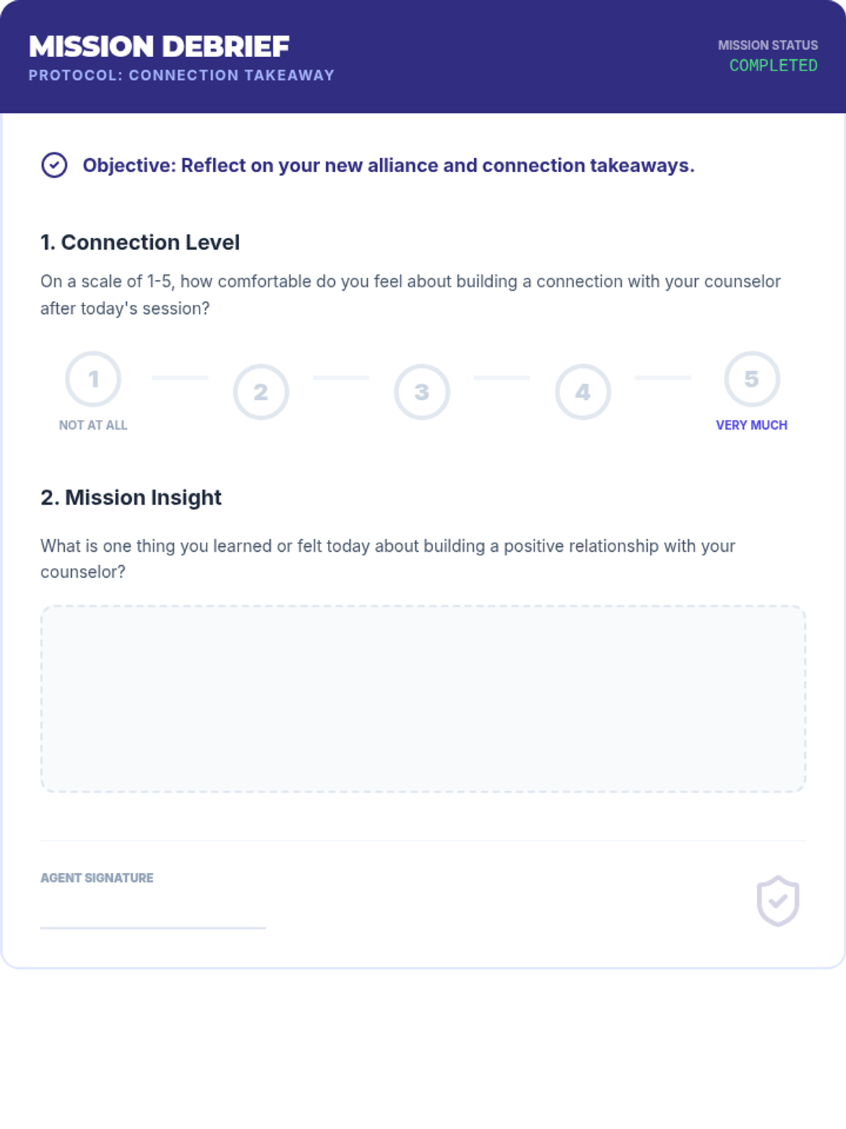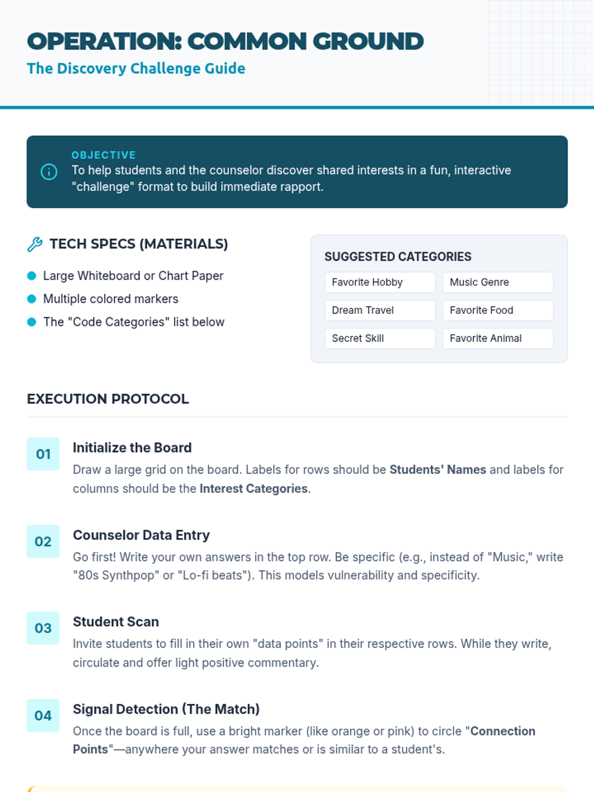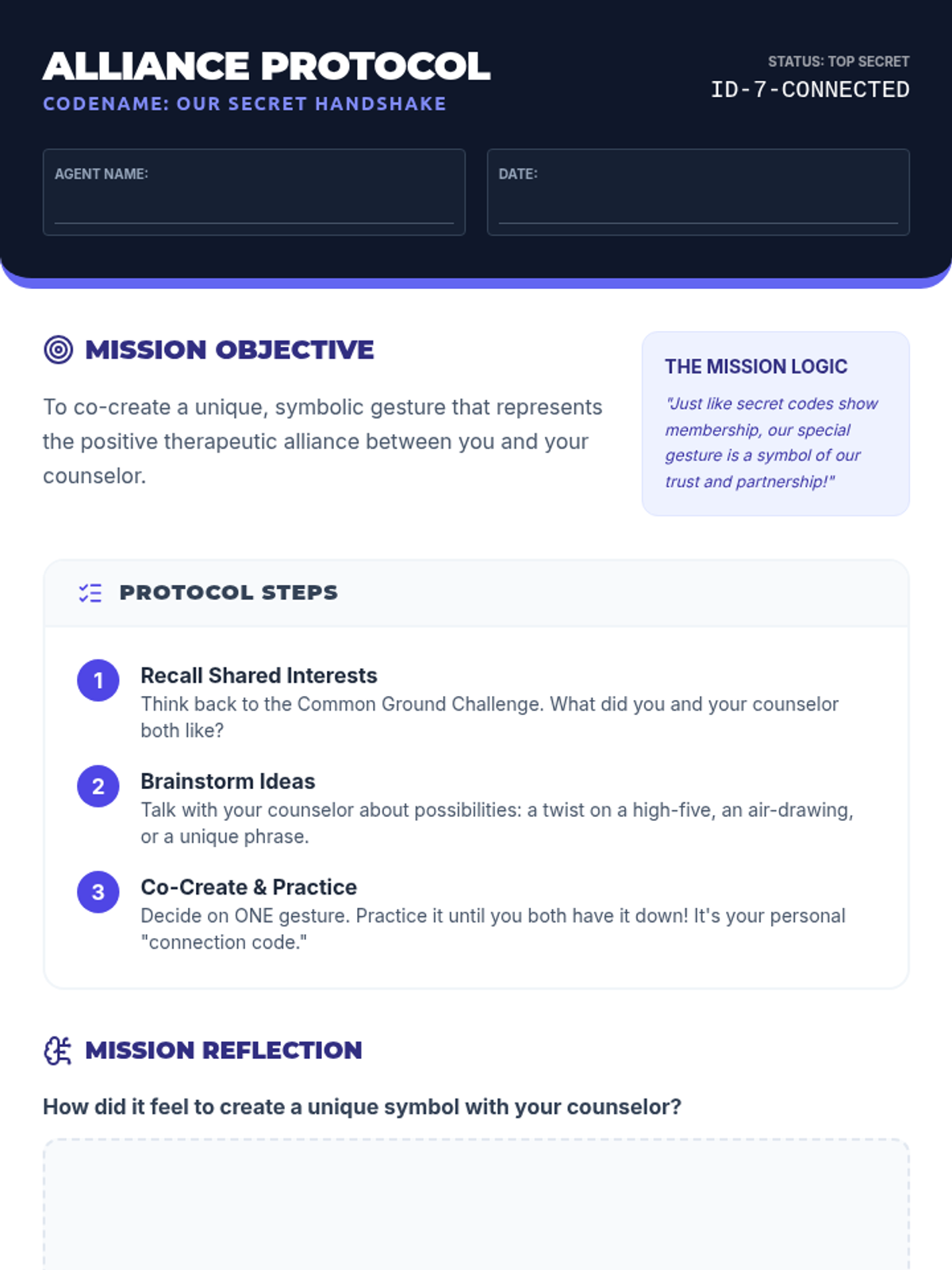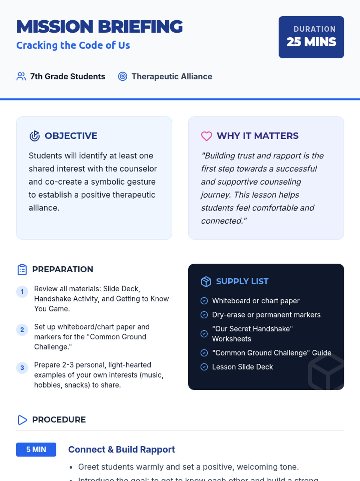 A 25-minute lesson for 7th-grade students focused on building a therapeutic alliance through discovery of shared interests and the creation of a symbolic connection gesture.