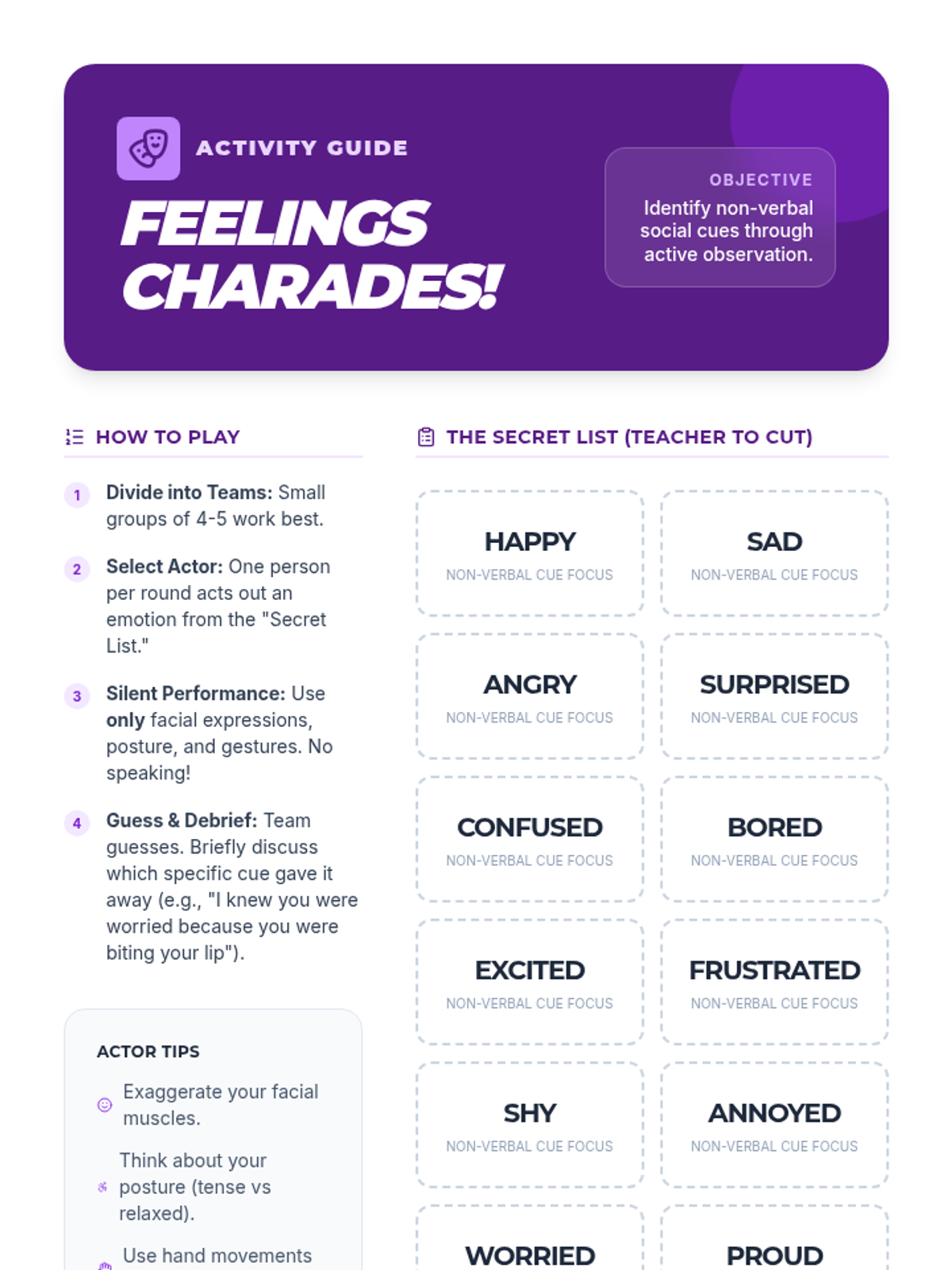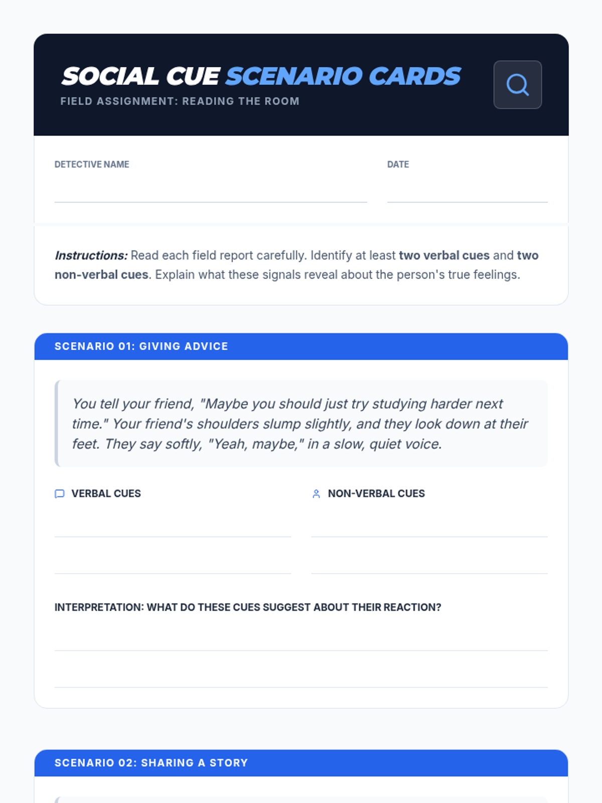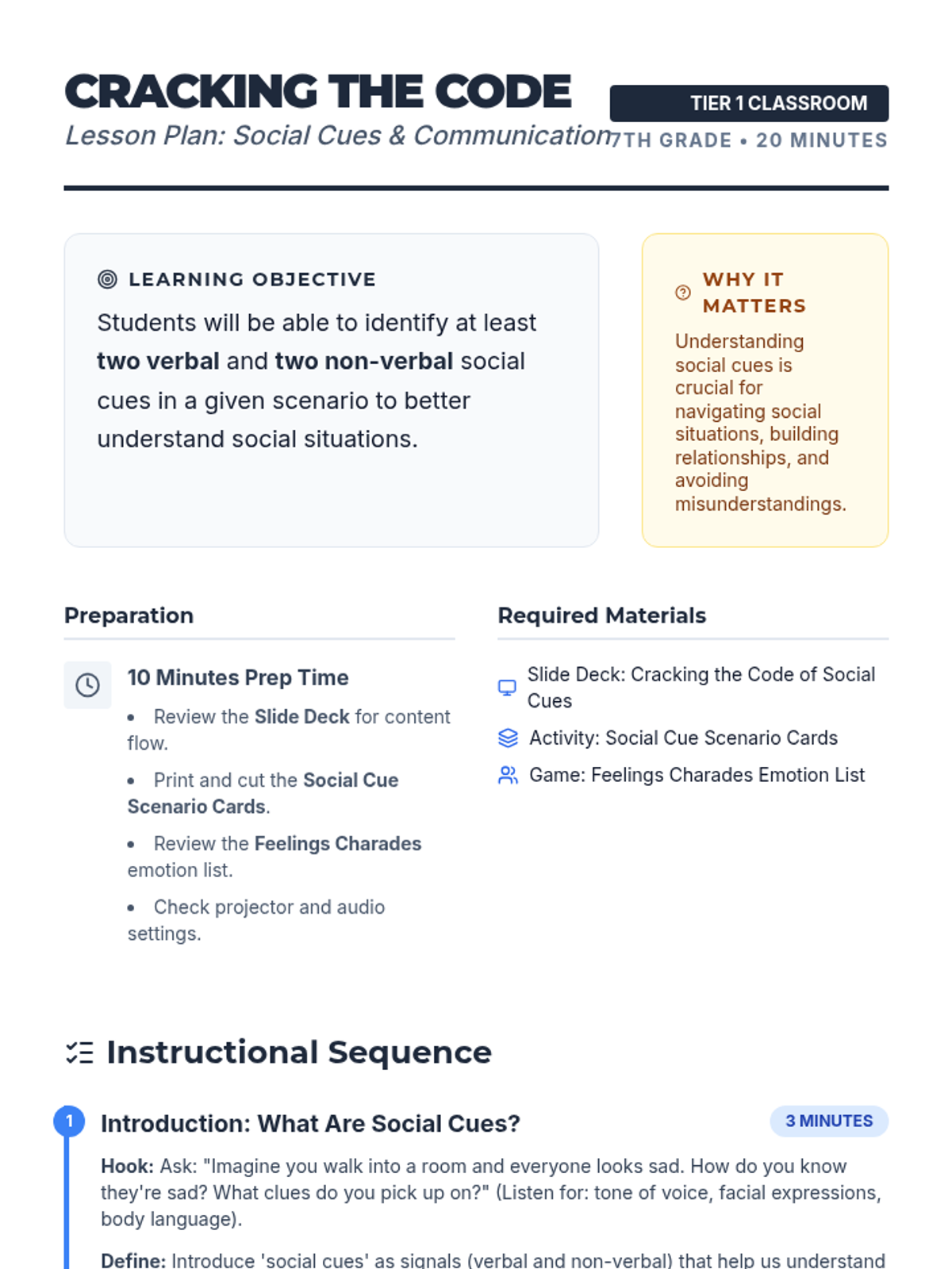 A 20-minute SEL lesson for 7th graders on identifying and interpreting verbal and non-verbal social cues like body language and tone.