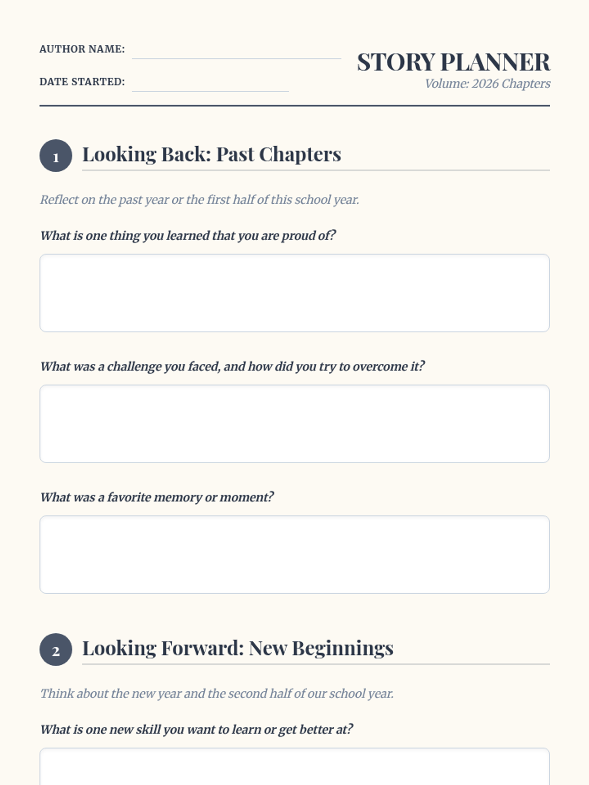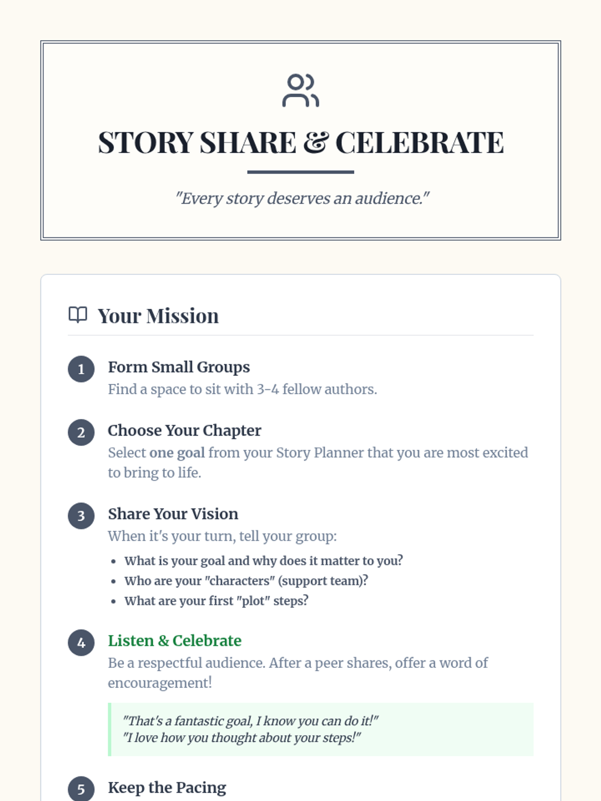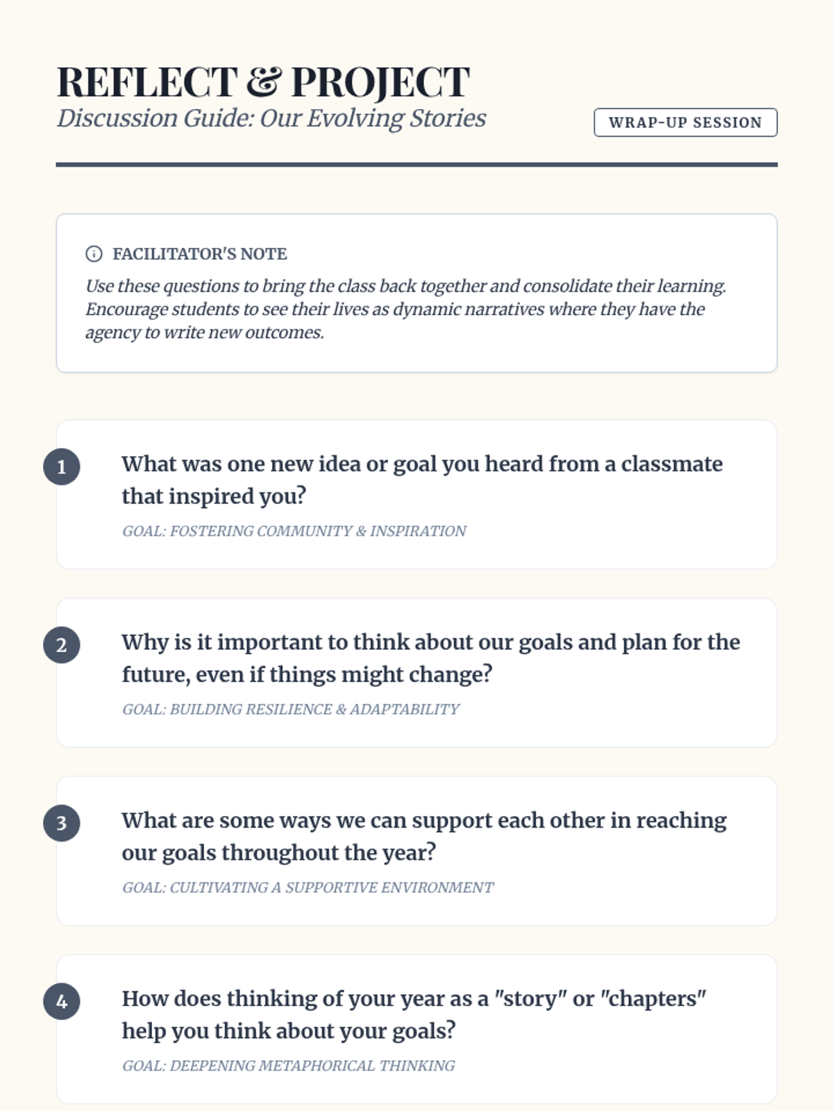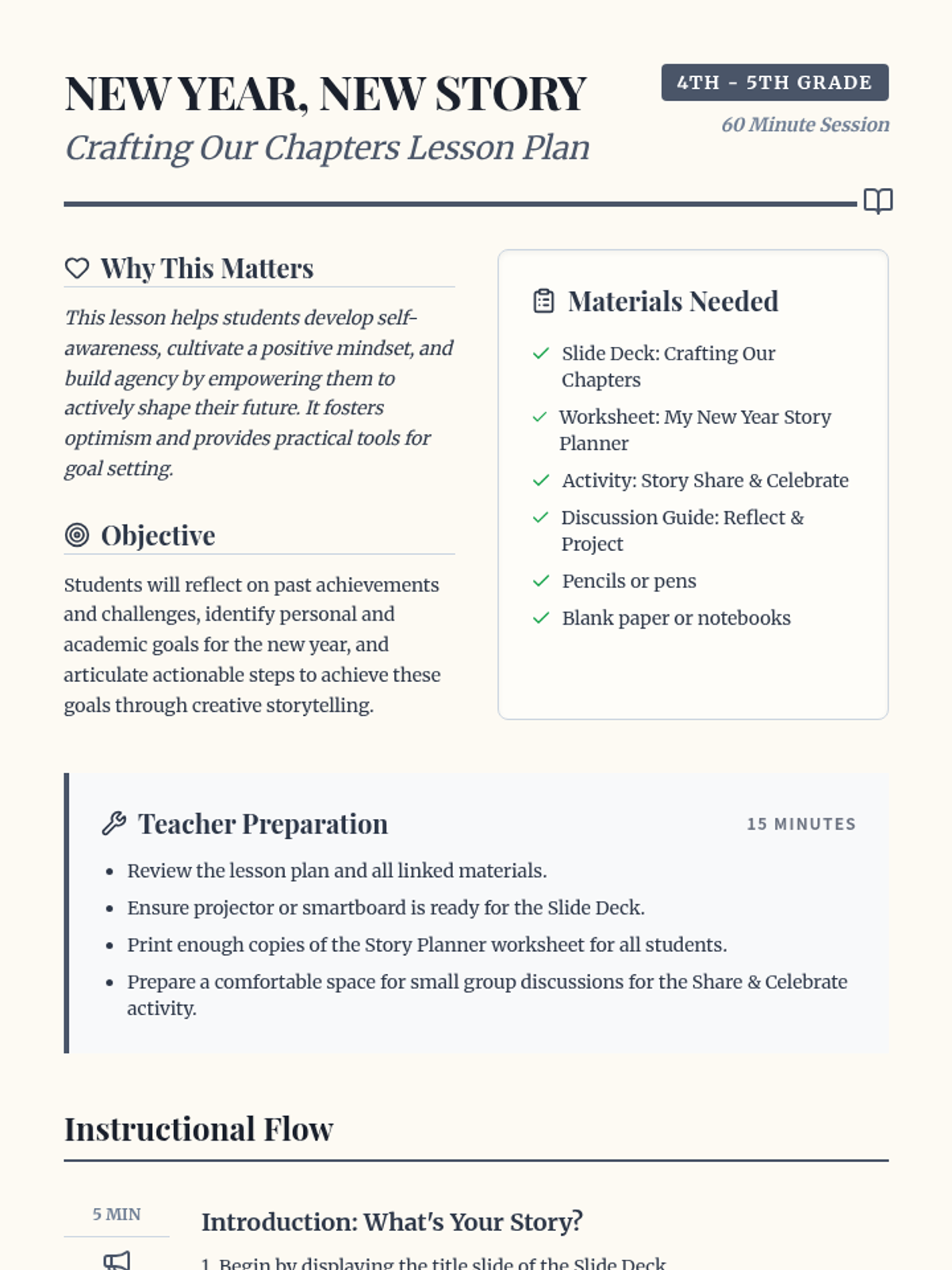 A 60-minute lesson for 4th and 5th graders focused on goal-setting through the metaphor of storytelling. Students reflect on past achievements and 'write' their future chapters by setting specific, actionable goals.