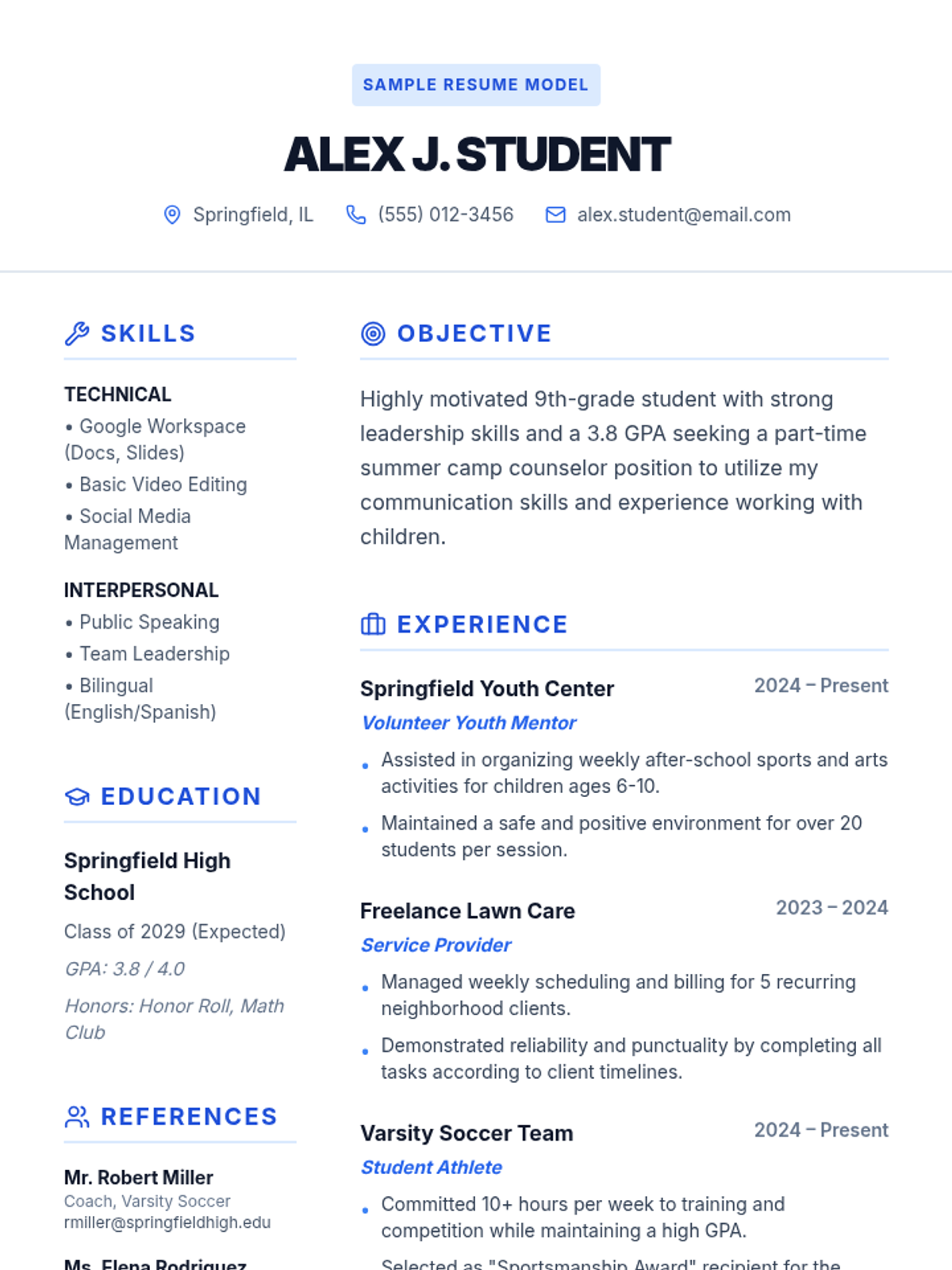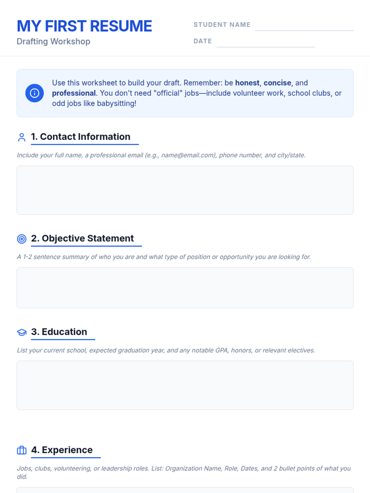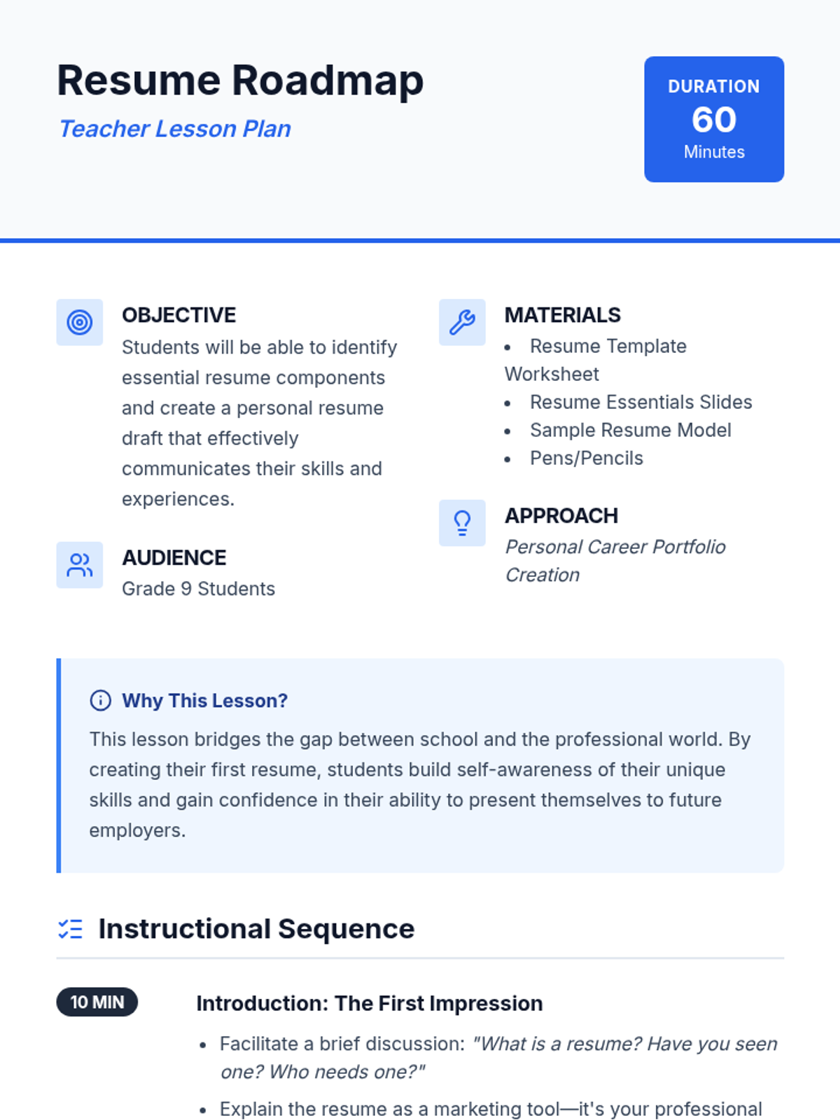 Students will learn the essential components of a resume and how to effectively present their skills and experiences using a guided template. This lesson is designed for Grade 9 students to build professional communication skills and self-confidence.