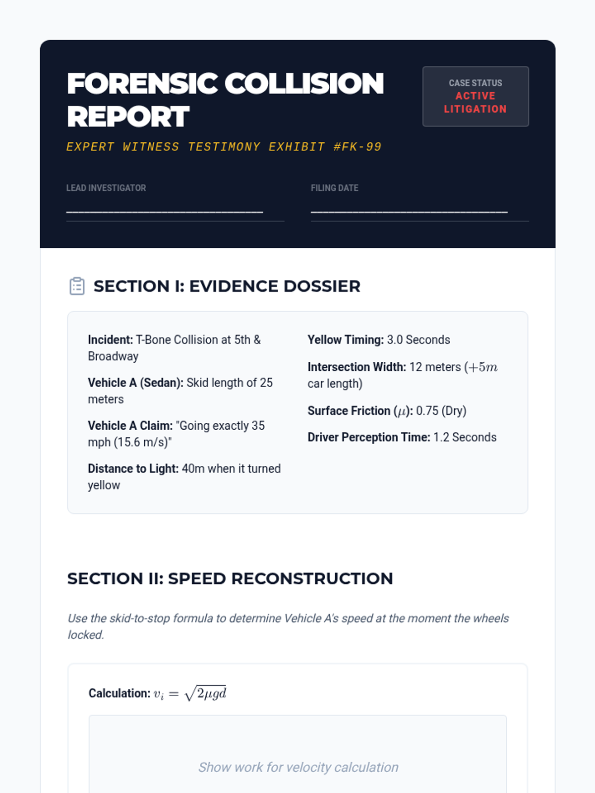 Synthesis project where students use forensic evidence to determine fault in a collision.