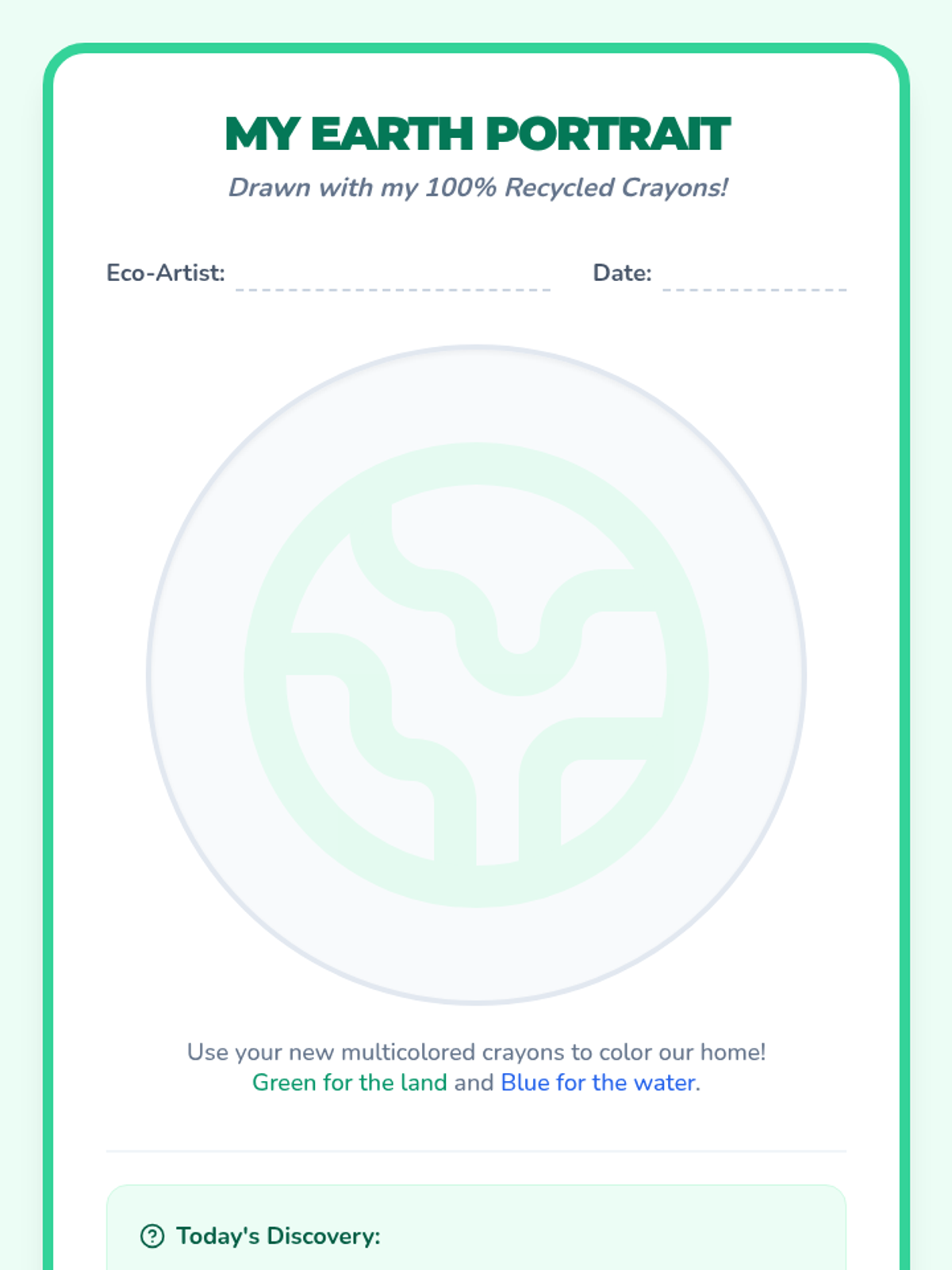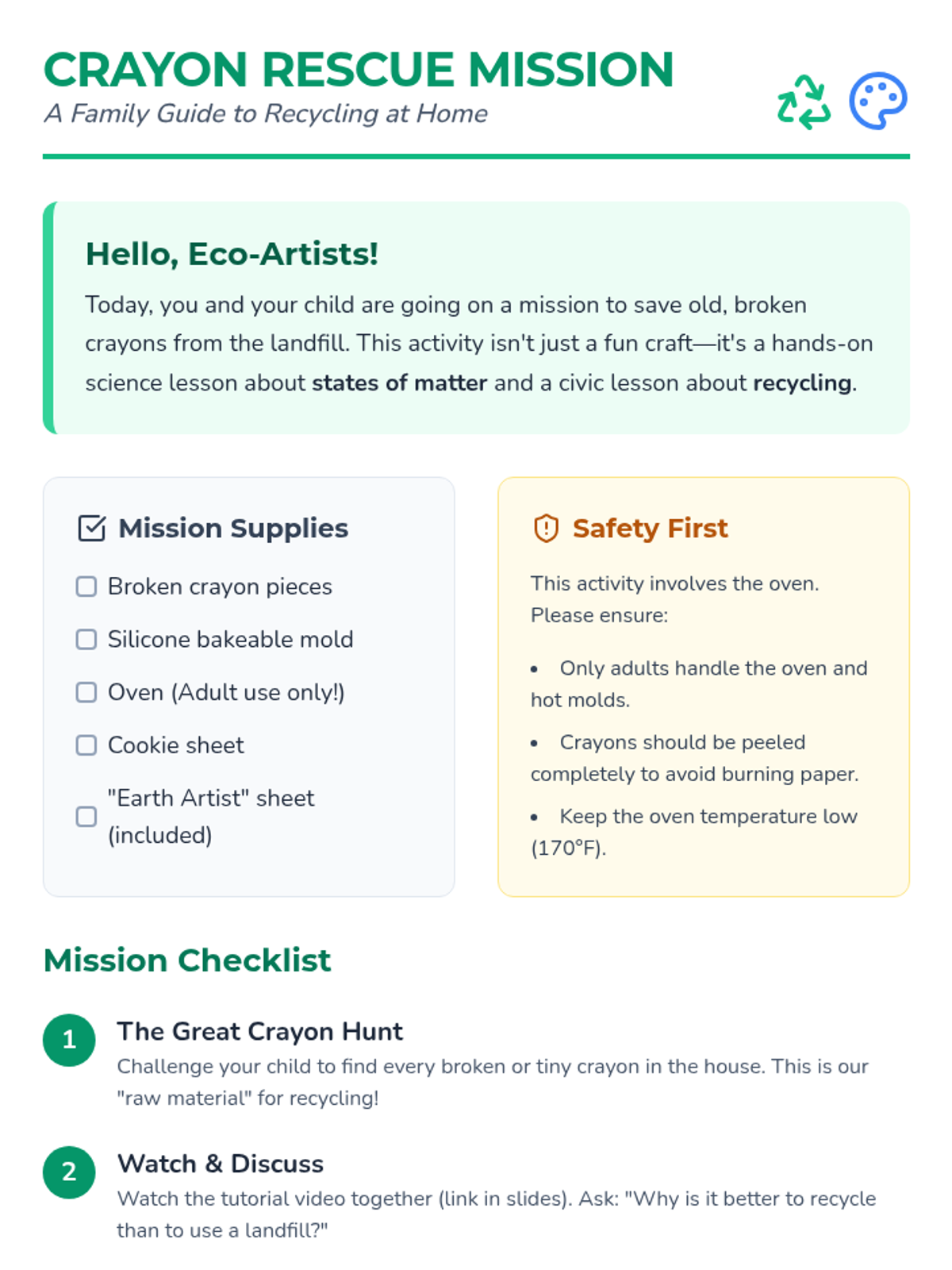 A collaborative home-based recycling activity for Pre-K to 2nd grade where families transform broken crayons into new, multicolored ones while learning about phase changes and waste reduction.
