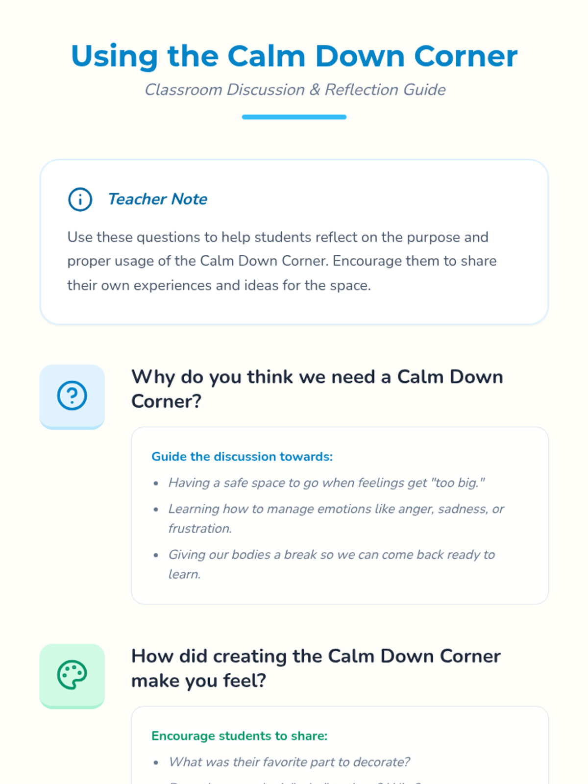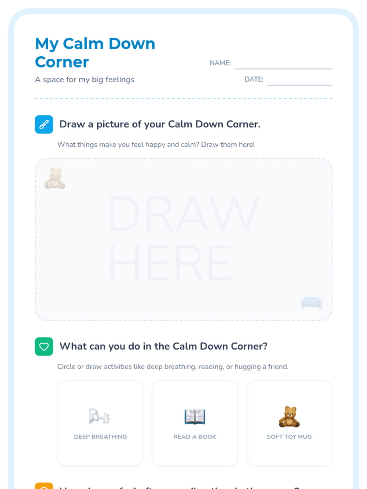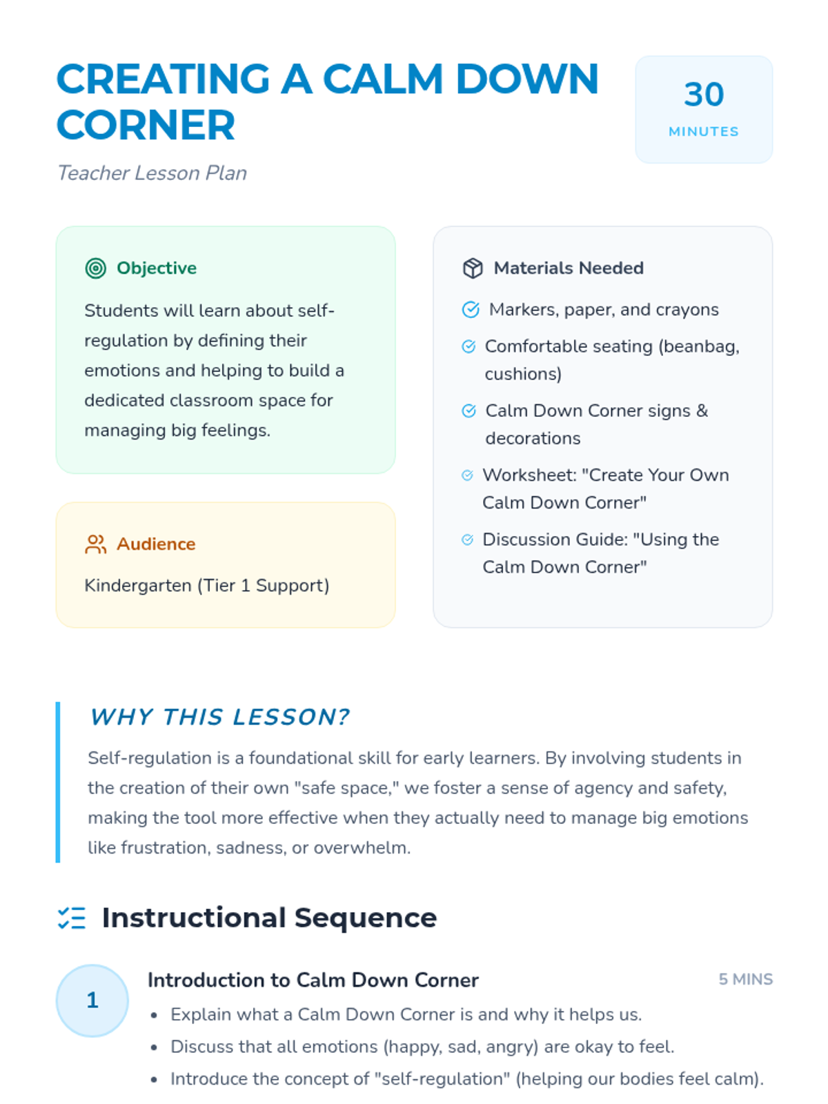 Students will learn about self-regulation through the creation and use of a 'Calm Down Corner' in the classroom. This lesson is important as it introduces young students to the concept of managing their emotions and provides them with a practical tool they can use whenever they feel overwhelmed or upset.