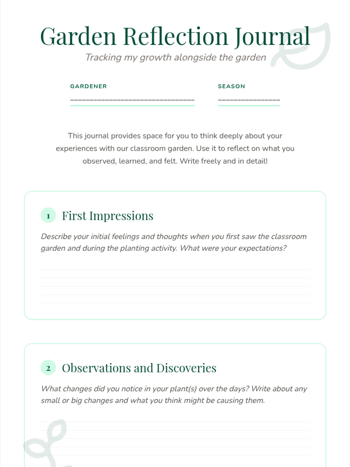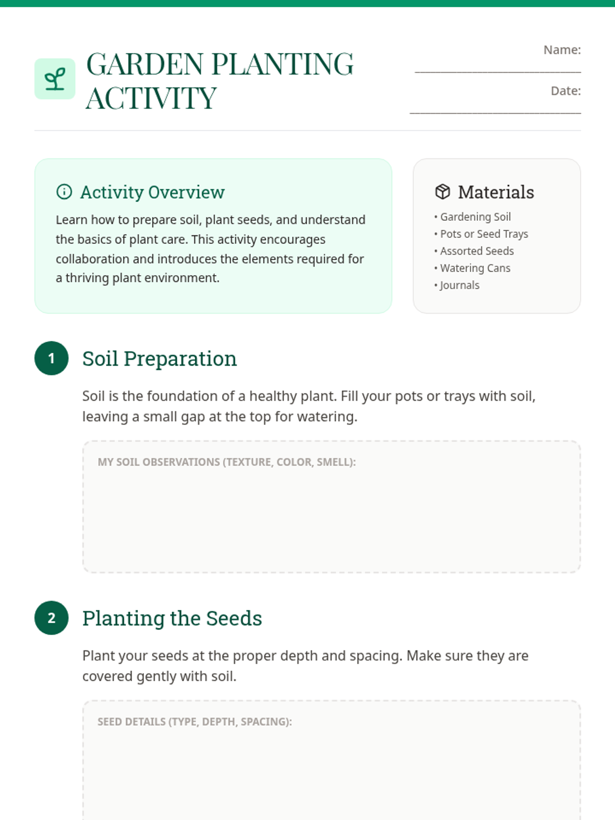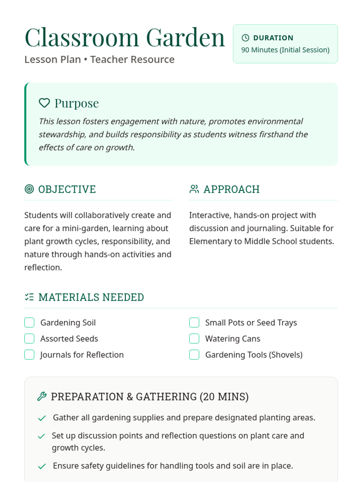 A hands-on project where students create and care for a mini-garden, promoting responsibility and understanding of plant growth cycles. This activity fosters discussions about nature, life cycles, and patience.
