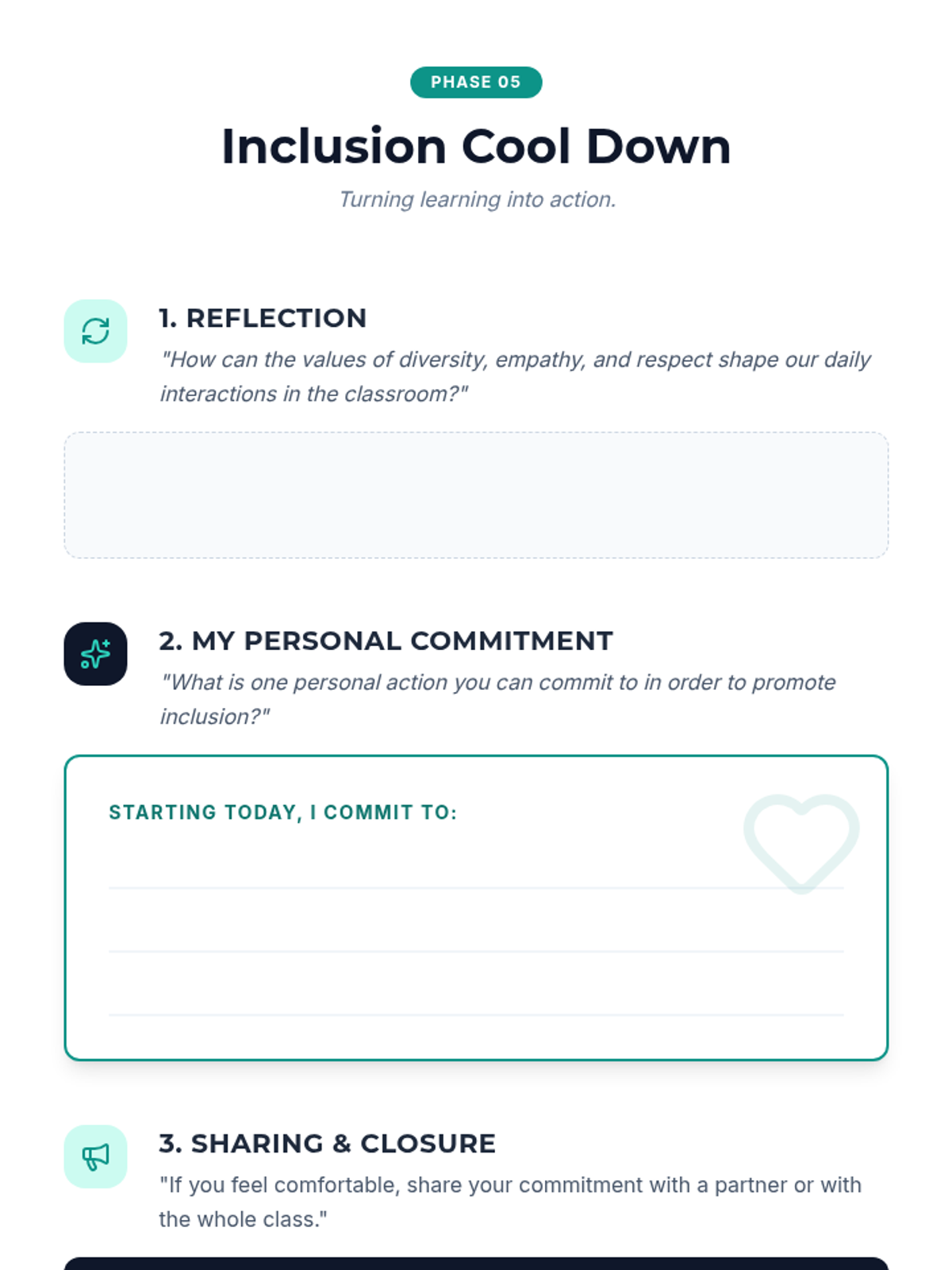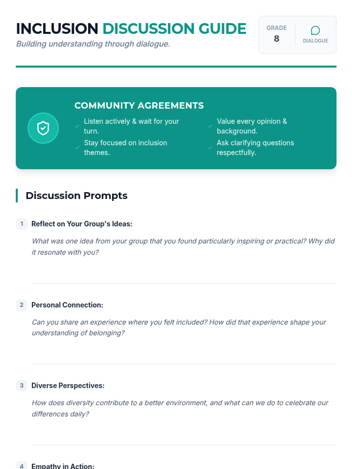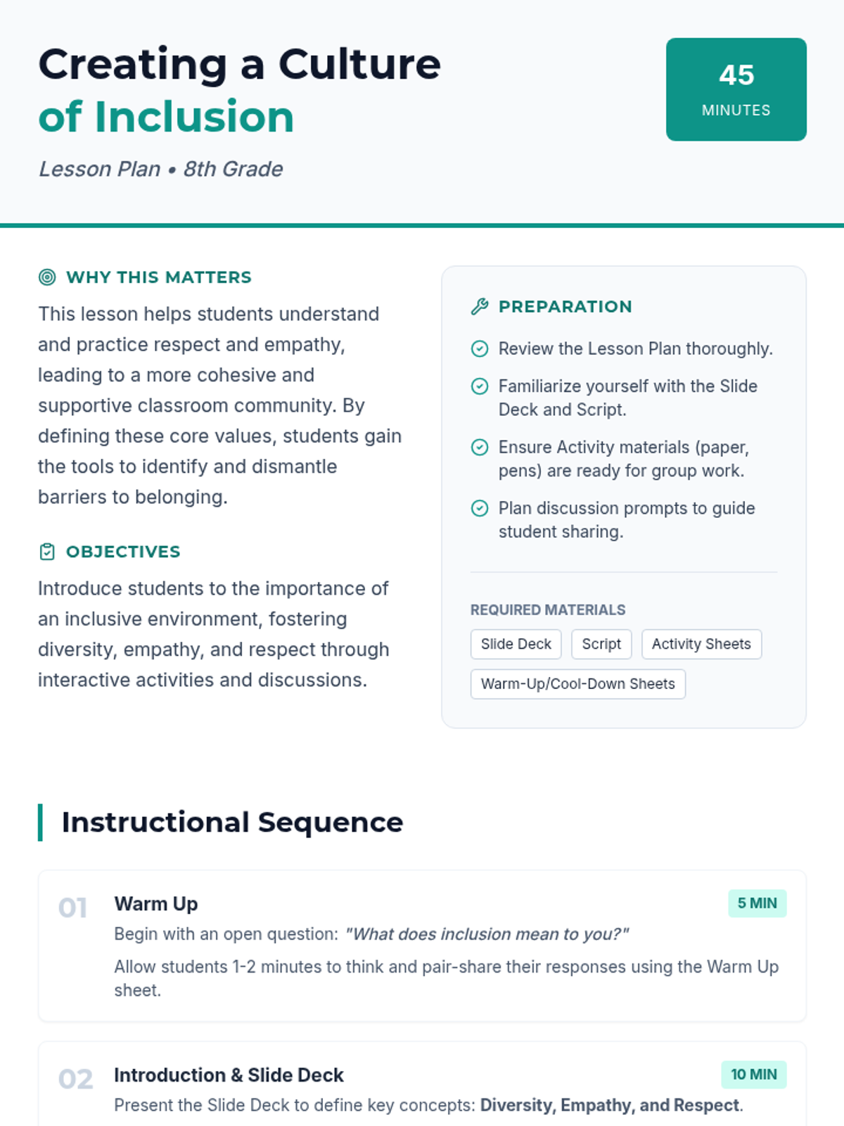 A 45-minute lesson for 8th graders designed to foster an inclusive classroom environment through the exploration of diversity, empathy, and respect. Students engage in interactive discussions, group brainstorming, and personal reflection to develop actionable commitments to inclusion.