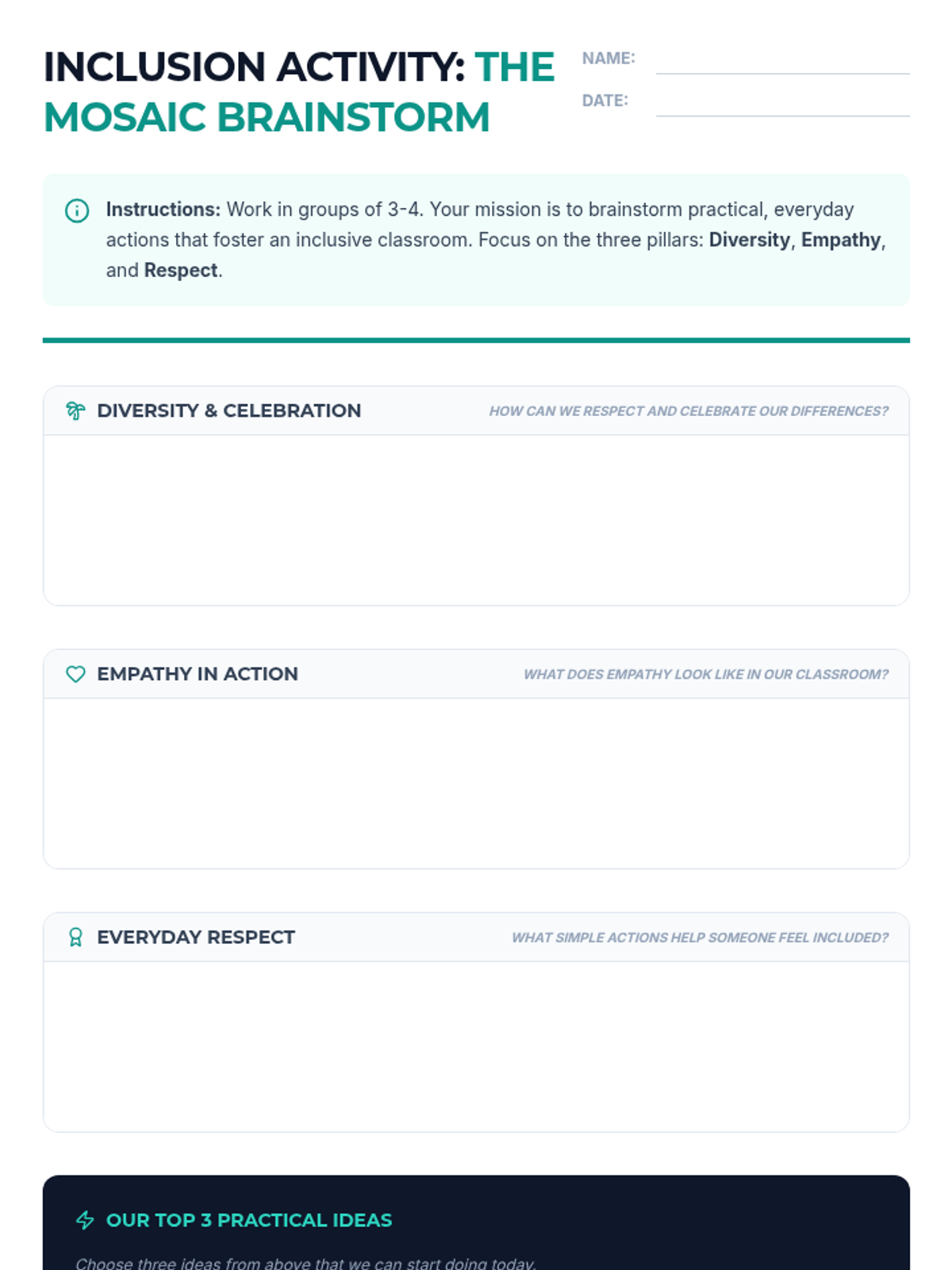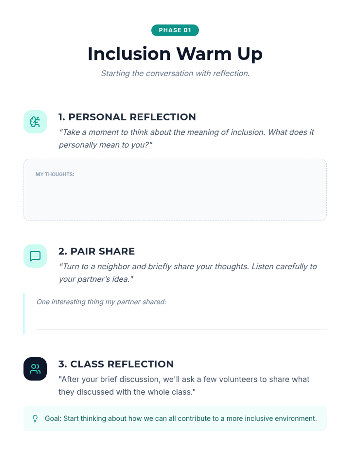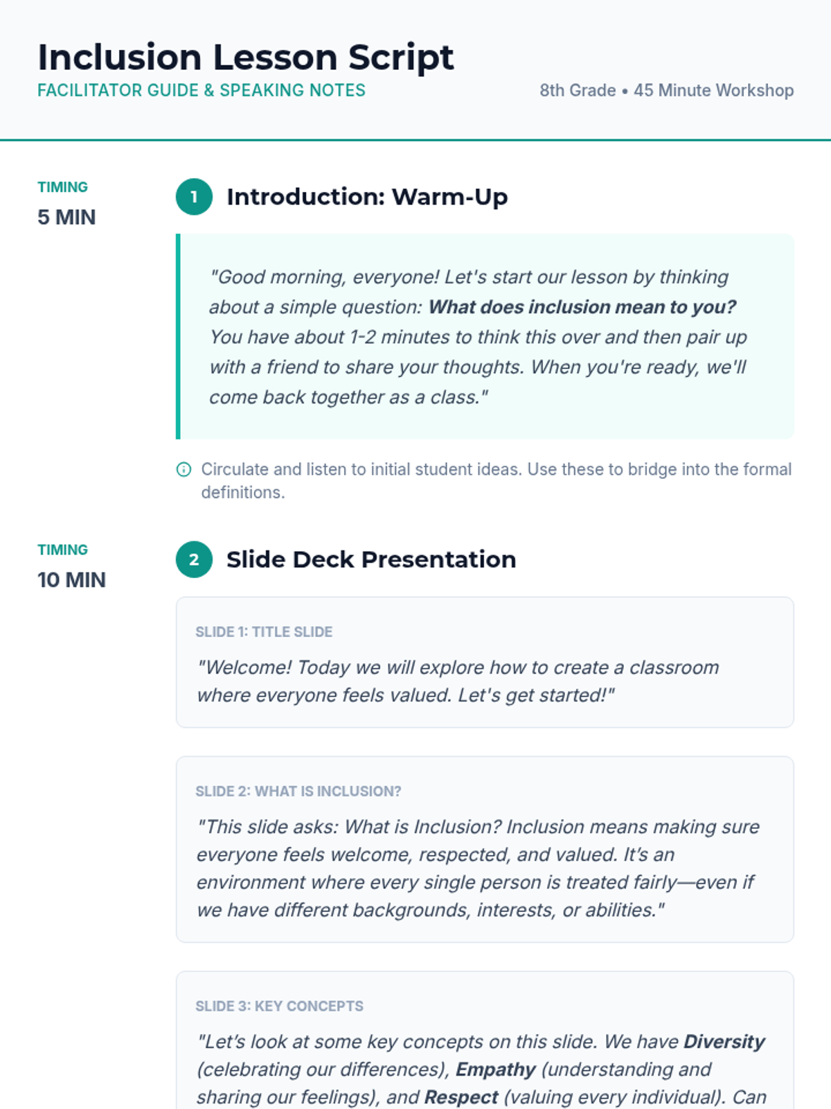 A 45-minute lesson for 8th graders designed to foster an inclusive classroom environment through the exploration of diversity, empathy, and respect. Students engage in interactive discussions, group brainstorming, and personal reflection to develop actionable commitments to inclusion.