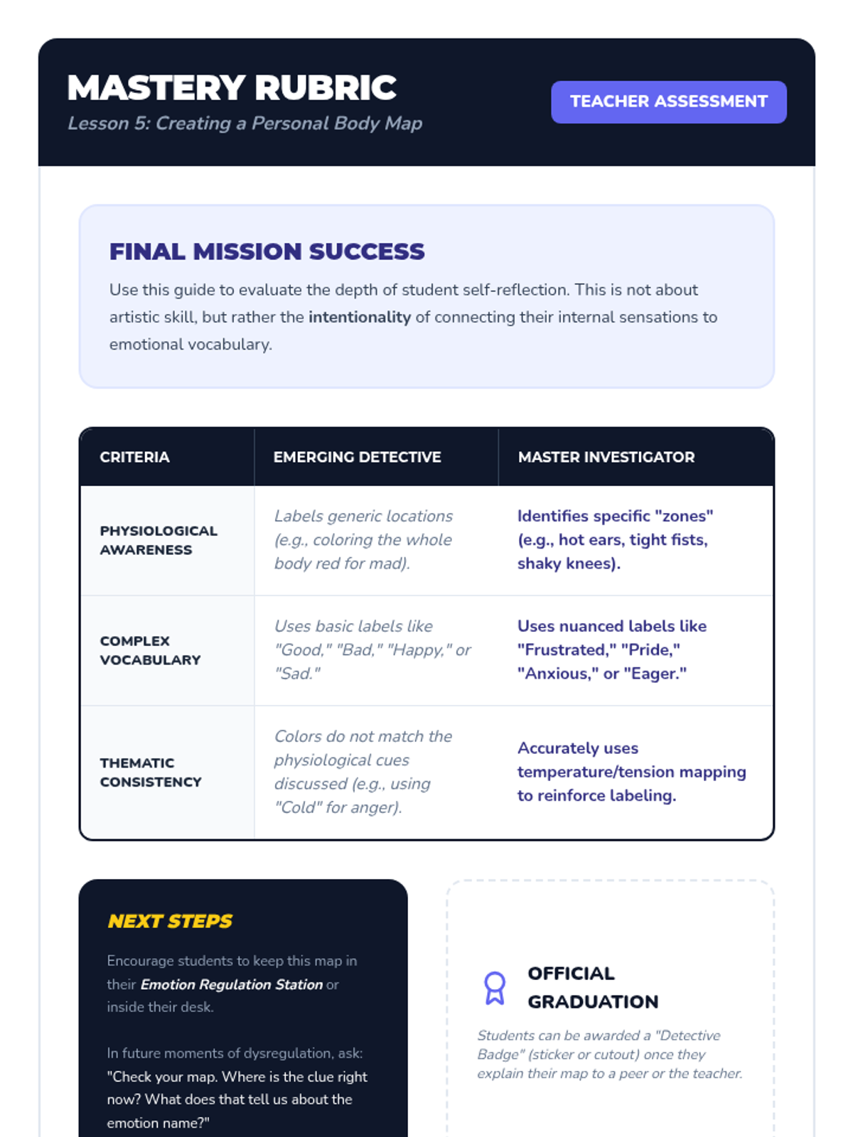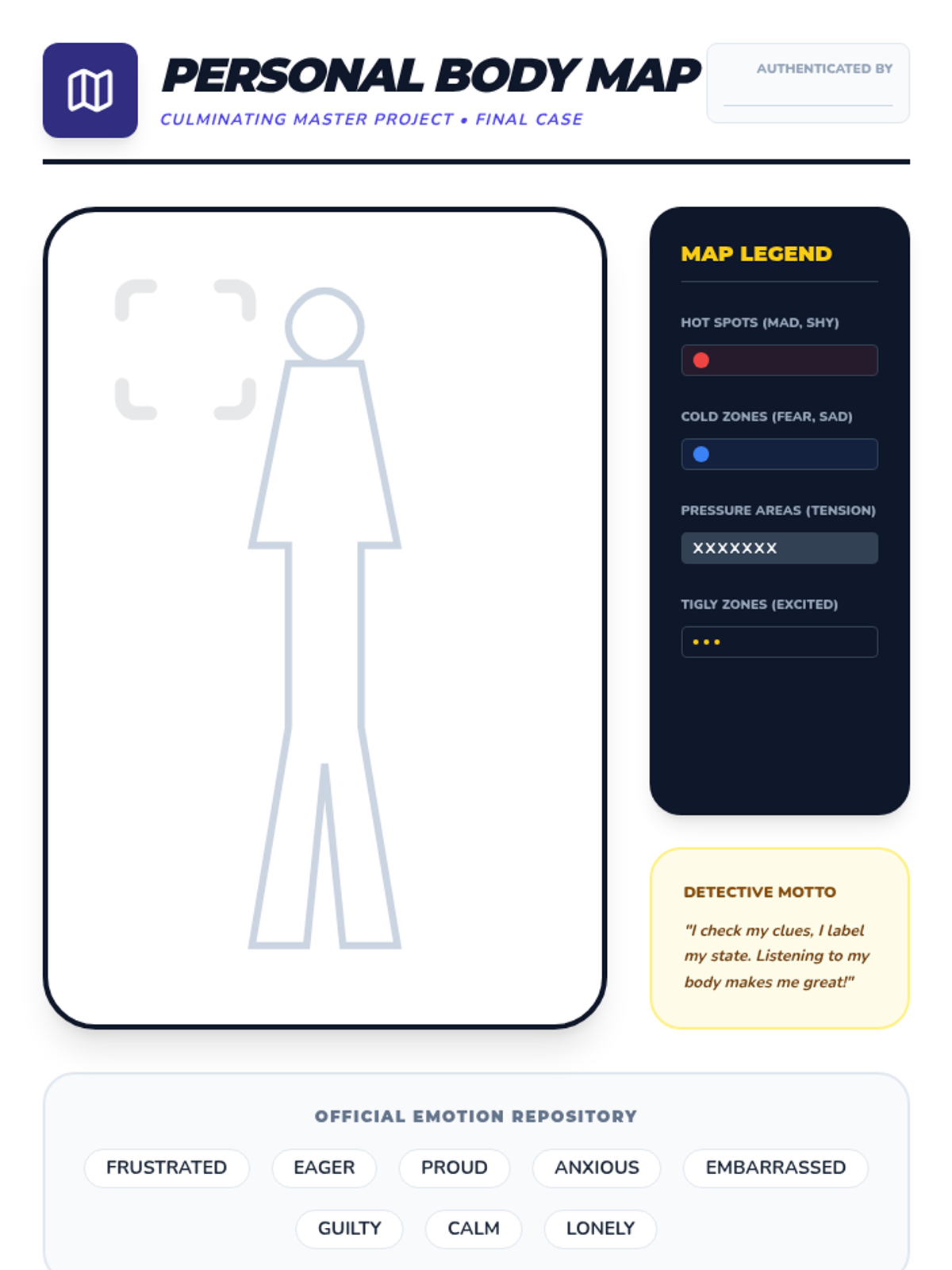 Students create a personalized Body Map reference guide linking their unique physical cues to emotional vocabulary.