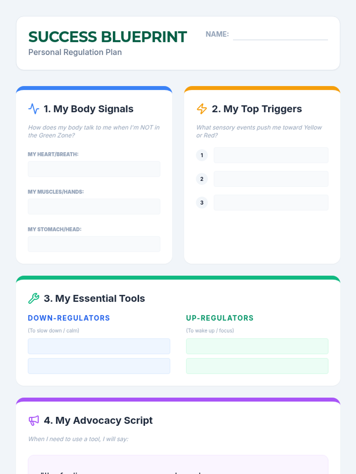 Students synthesize their knowledge of triggers, body signals, and effective tools into a cohesive Regulation Plan. They design a portable reference card or digital slide that lists their 'Green Zone' strategies.