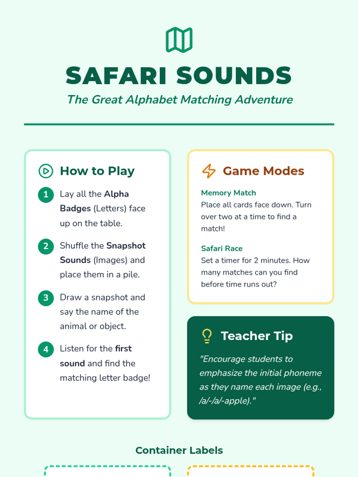 A hands-on phonics game where students match uppercase letters to their initial sound images in a safari-themed adventure.