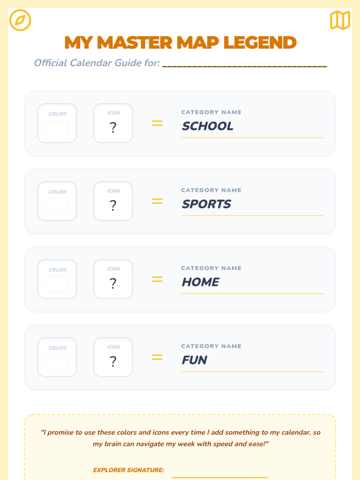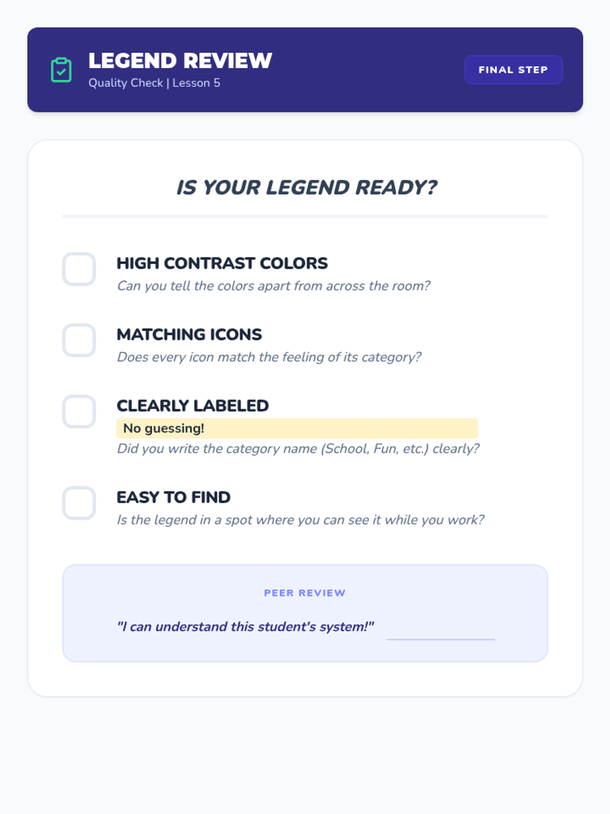 Students create a physical or digital legend that defines their color and icon system for consistency and external support.